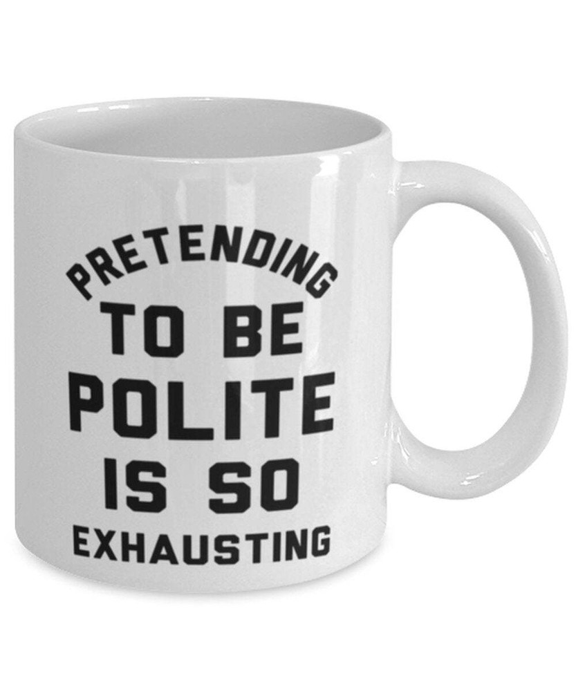 Funny Coffee Mug Pretending To Be Polite Is Exhausting Gift Coffee White Mug Product Details.. This high quality 11oz. ceramic white mug has a premium hard coat that provides crisp and vibrant color reproduction sure to last for years. Perfect for all hot & cold beverages. The highest quality printing possible is used. It will never fade no matter how many times you wash it. Material: 100% Ceramic. Print both sides. Dishwasher and Microwave Safe. High Gloss + Premium White Finish. Printed in the U.S.A. Personalized & Custom. We support personalized and custom mug to add custom, when placing an order, you can add notes to the "order note" in shipping address section. Also you can contact us directly via message. Shipping Info. Ready to ship in 1 to 2 business days, All products are made-to-order and proudly printed in the United States. Shipped by USPS and DHL, You will receive your order in 5-7 days. Replace & Refund. All products are defective during shipping broken, chipped will be replaced free of charge. You are not satisfied with the product, we will refund 100% money to you. If any other issues arise, please do not hesitate to message, we would be more than happy to assist you.