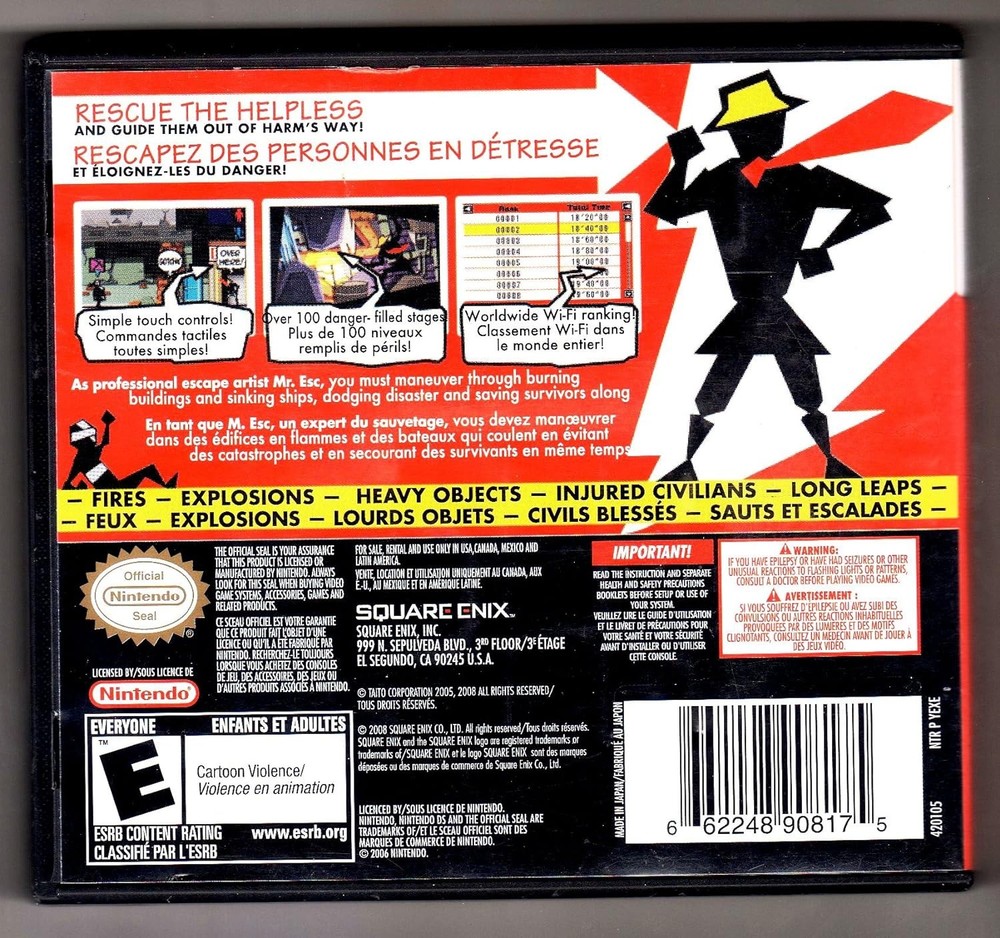 Further Details Title: Exit / Game Condition: New Publisher: Square Enix Genre: Legacy Systems Sub-Genre: Nintendo Systems, Nintendo DS Release Date: 11/04/2008 Description: The stylish and inventive action puzzle game comes to Nintendo DS! As professional escape artist Mr.Esc, players must maneuver through burning buildings and sinking ships as they dodge disaster and save survivors along the way. EXIT DS makes a smooth return to the portable scene with all-new Touch-Screen functionality and over 100 stages to solve. See more Certificate: RP - Rating Pending Platform: Nintendo DS Type: Nintendo DS MPN: 90817 Release Year: 2008 Missing Information? Please contact us if any details are missing and where possible we will add the information to our listing.