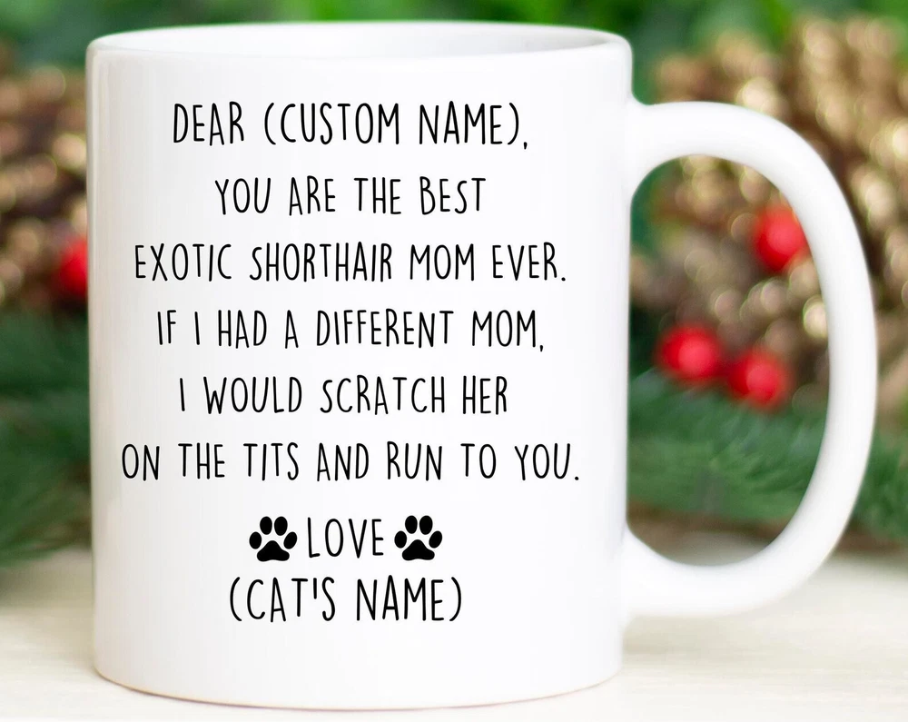 Exotic Shorthair Mom Birthday Gift Funny Exotic Cat Mom Christmas Gift Exotic Cat Mom Valentine Gift Funny Exotic Cat Mom Appreciation Product Details.. This high quality 11oz. ceramic white mug has a premium hard coat that provides crisp and vibrant color reproduction sure to last for years. Perfect for all hot & cold beverages. The highest quality printing possible is used. It will never fade no matter how many times you wash it. Material: 100% Ceramic. Print both sides. Dishwasher and Microwave Safe. High Gloss + Premium White Finish. Printed in the U.S.A. Personalized & Custom. We support personalized and custom mug to add custom, when placing an order, you can add notes to the "order note" in shipping address section. Also you can contact us directly via message. Shipping Info. Ready to ship in 1 to 2 business days, All products are made-to-order and proudly printed in the United States. Shipped by USPS and DHL, You will receive your order in 5-7 days. Replace & Refund. All products are defective during shipping broken, chipped will be replaced free of charge. You are not satisfied with the product, we will refund 100% money to you. If any other issues arise, please do not hesitate to message, we would be more than happy to assist you.
