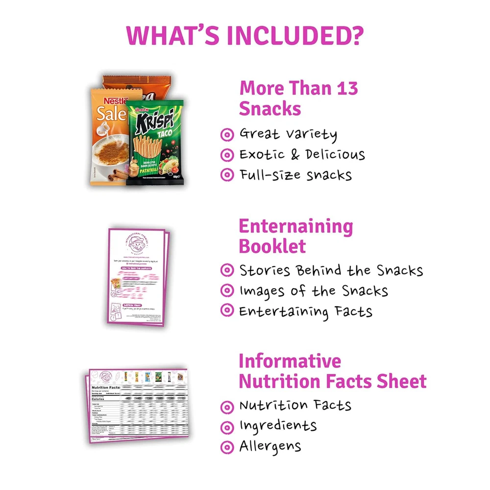 Fast Shipping Great Customer Support Satisfaction Guaranteed DESCRIPTION Shipping Shipping Shipping All domestic packages are shipped for Free (Unless other shipping method was selected during the checkout) Most items ship and arrive much sooner than the estimate delivery date. Usually within 2-3 days from payment. However, we have longer estimates to compensate for the occasional delay or supply chain breakdown. We do not accept P.O. BOXES - PLEASE PROVIDE A PHYSICAL ADDRESS Return Return Return In the event that you would like to return your purchase, we allow returns that are processed within the defined return date (the return date is to be found in the return policy/shipping and handling section) Please contact us for a return authorization and the return shipping address. Payment Payment Payment PayPal is our preferred method of payments it's the quickest, easiest and most secure way to pay for your goods or services online. PayPal offers buyer and seller protection should there be a problem. If you do not have a PayPal account, to get started and buy your first item with us is very easy. Simply click on the 'Buy It Now' button and follow the eBay checkout steps. Select PayPal as the payment method you then will be given the chance to enter your card details in to PayPal's secure checkout in order to pay for your order. Once the payment has been made, you will then be given the opportunity to make your own PayPal account to make paying for your items in the future very easy. Should there be a problem with payment please do let us know. Feedback Feedback Feedback Customer satisfaction is very important to us. If you have any problem with your order,please contact us and we will do our best to make you satisfied, please do not leave a negative feedback before we resolve your problem. We guarantee that your issue will be solved quickly. As long as you are happy with your purchase of , please leave us a positive feedback. Your feedback is very important to us it affects our search placement on eBay. We will leave a positive feedback for you in return automatically once we receive your feedback. Contact Us Contact Us Contact Us If you have any queries, please contact us via ebay. We usually respond within 24 hours on weekdays. Thank you for visiting our ebay store! Immerse yourself into the world of snacks with International Yummies by Matleas International snacks you find in this crate offer great variety and exotic tastes unlike any other Comes with a pamphlet that gives funny trivia about snacks Perfect choice for gifting occasions with artistically designed mystery snack box for curious minds You will have great time exploring these rare snacks from around the world with friends and family Exotic food in our boxes strikes perfect balance between sweet and savory and even include candies All snacks in this variety pack are full-size Our boxes are wrap sealed and we use US-format expiration dates (Month/Year) Comes with US-format nutritional facts table for nutritional values and allergens We always produce small batches to guarantee freshness every time Immerse yourself into the world of snacks with International Yummies by Matleas. International snacks you find in this crate offer great variety and exotic tastes unlike any other. Comes with a pamphlet that gives funny trivia about snacks. Perfect choice for gifting occasions with artistically designed mystery snack box for curious minds. You will have great time exploring these rare snacks from around the world with friends and family. Exotic food in our boxes strikes perfect balance between sweet and savory and even include candies. All snacks in this variety pack are full-size. Our boxes are wrap sealed and we use US-format expiration dates (Month/Year). Comes with US-format nutritional facts table for nutritional values and allergens. We always produce small batches to guarantee freshness every time. Exotic Snack Box 12 Full-Size Snacks + 1 Bonus Treats from Around the World Click here to see description Fast Shipping Great Customer Support Satisfaction Guaranteed DESCRIPTION Shipping All domestic packages are shipped for Free (Unless other shipping method was selected during the checkout) We ship within two business days of payment, usually sooner Standard FREE shipping takes between 3-5 business days Expedited shipping takes between 2-3 business days Overnight shipping takes between 1-2 business days We do not accept P.O. BOXES - PLEASE PROVIDE A PHYSICAL ADDRESS We Ship Globally using ebay's GSP, the item is sent to a logistic center in KY and shipped from there to the rest of the world. International customers are responsible for all duties and taxes Contact your local authority for questions related to the amount of duties or taxes you will be responsible for Return In the event that you would like to return your purchase, we allow returns that are processed within the defined return date (the return date is to be found in the return policy/shipping and handling section) Please contact us for a return authorization and the return shipping address. Please contact us for a Return Merchandise Authorization (RMA) number. We advise you to use a reputable carrier service when returning your goods. Please pack all returns appropriately. We ship globally Via eBay's global shipping program (GSP). Thus we don't cover returns for items shipped globally. Buyers returning such items will be refunded ONLY for the item's cost and not for the shipping. please check the Voltage information and make sure it matches the one in your country. In case it's not stated in the description, do ask us. Payment PayPal is our preferred method of payments it's the quickest, easiest and most secure way to pay for your goods or services online. PayPal offers buyer and seller protection should there be a problem. If you do not have a PayPal account, to get started and buy your first item with us is very easy. Simply click on the 'Buy It Now' button and foll