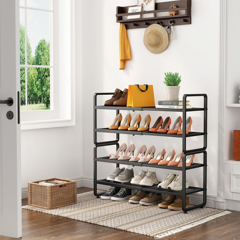 This 4 tier shoe rack can be extended from 18.6" to 30.5" and hold up to 16 pairs of shoes on the shelves, which is perfect space solution for shoes organization, and you can adjust the height of the shoe stand to fit taller boots as per your needs. Well-made of heavy-duty metal material with black coated finish and sturdy constructure, our shoe rack will not sag, collapse, rust and deform, while the adjustable feet ensure it stays stably on uneven grounds. It will serve for a long time. Expandable Shoe Rack: This 4 tier shoe rack can be extended from 18.6" to 30.5" and hold up to 16 pairs of shoes on the shelves, which is perfect space solution for shoes organization of small place, garage, entryway, closet and living room. Height Adjustable and Stackable: You can adjust the height of the shoe stand to fit taller boots as per your needs. Meanwhile, the 4 tier shoe organzier can be purchased more to stacke into 6-tier, 8-tier, 10-tier and even 12-tier to maximize the vertical space. Perfect for High Heels: The shelves of our shoe rack is specifically constructed from mesh wire grip that is taut enough to keep heels from teetering over. Compared with other flimsy plastic shoe racks or thin wire metal shoe racks, our shoe rack features better compatibility and durability. Built to Last: Well-made of heavy-duty metal material with black coated finish and sturdy constructure, our shoe rack will not sag, collapse, rust and deform, while the adjustable feet ensure it stays stably on uneven grounds. It will serve for a long time. Easy Assembly and Cleaning: This shoe rack can be assembled less than 10 mins with simple structure design. A detailed user manual and instructional video are also provided to simplify the assembly process. And you can rinse or wipe the rack to keep it clean. This rack would be a reassuring choice for you to organize the shoes.