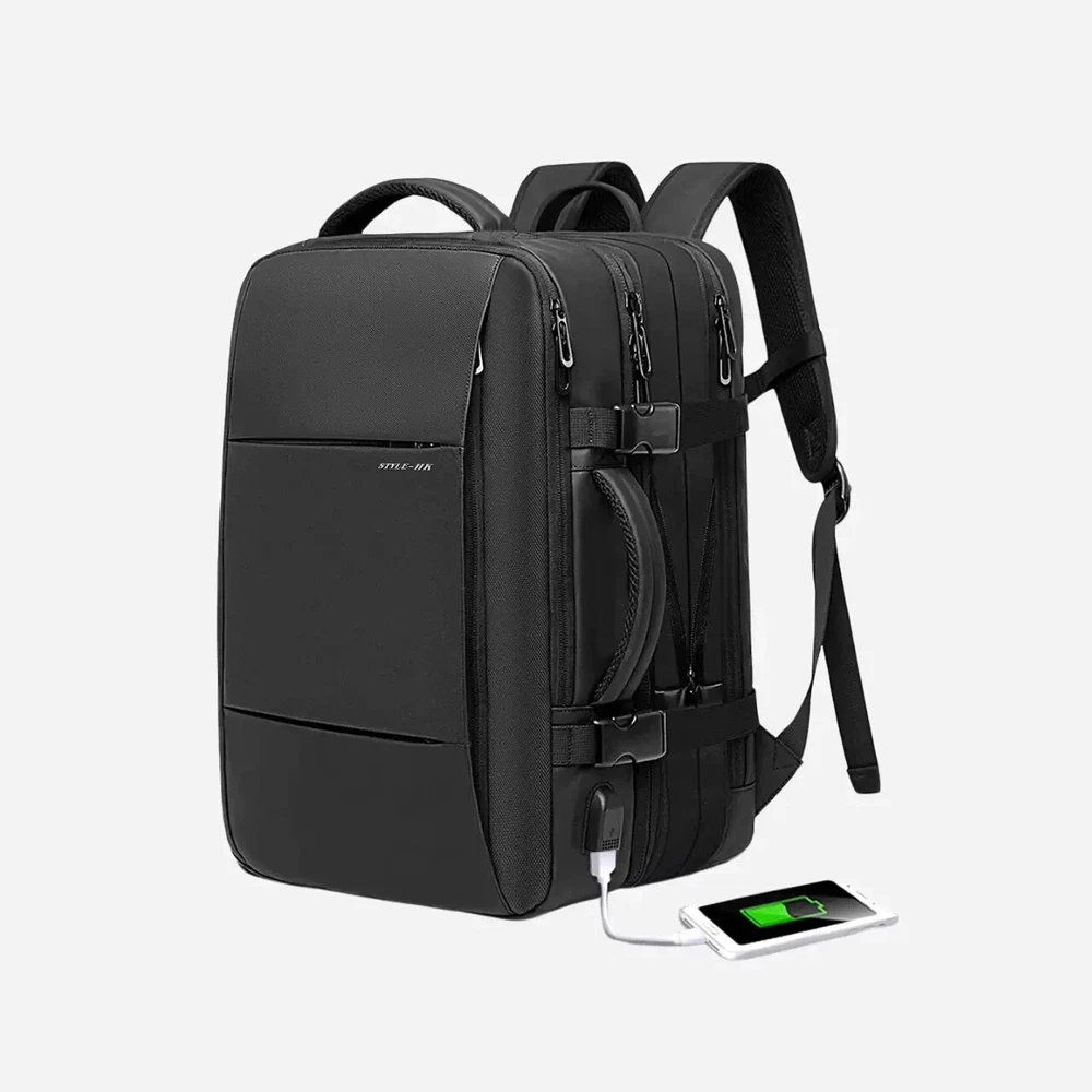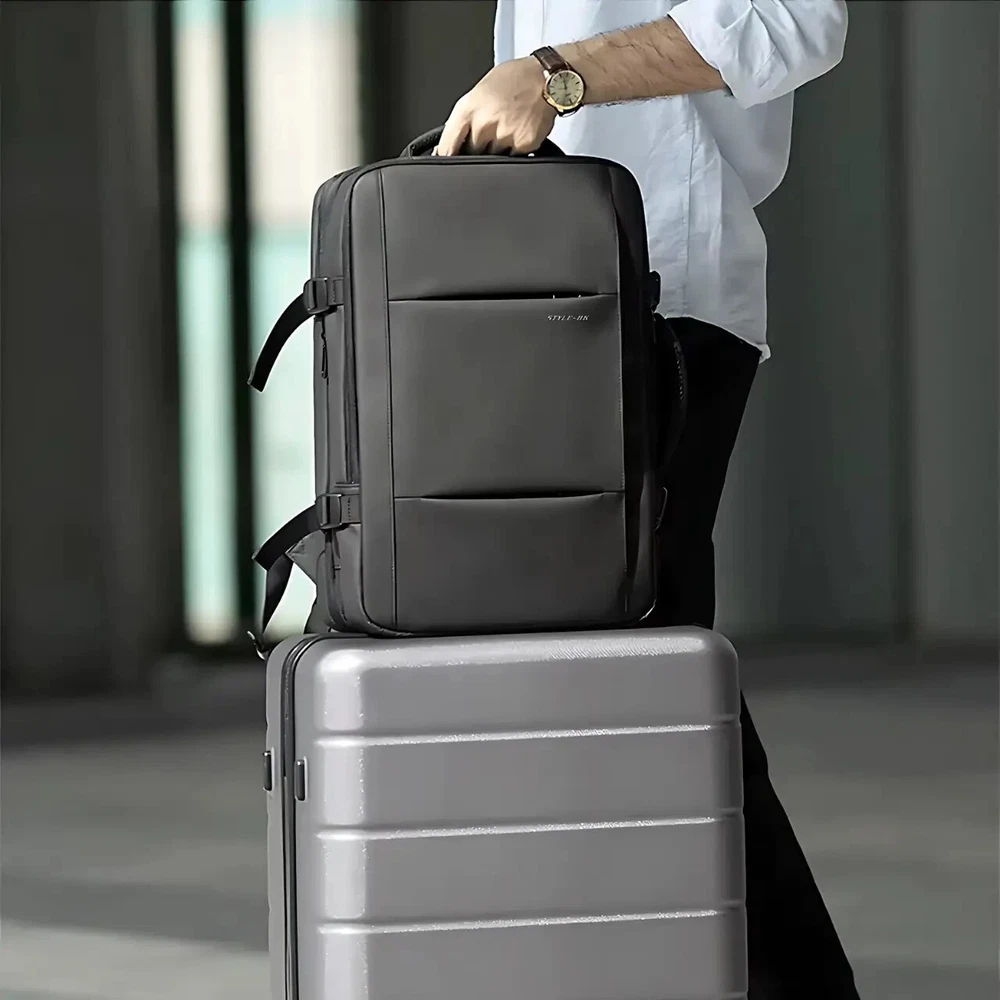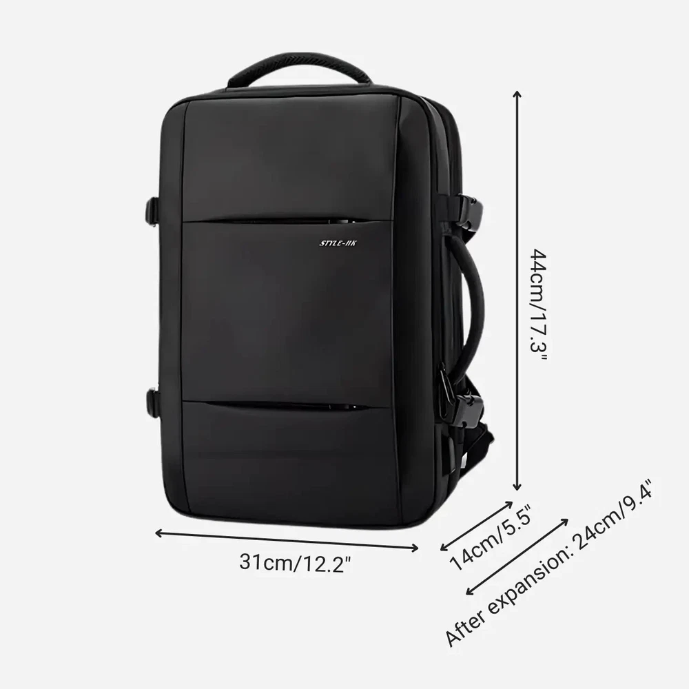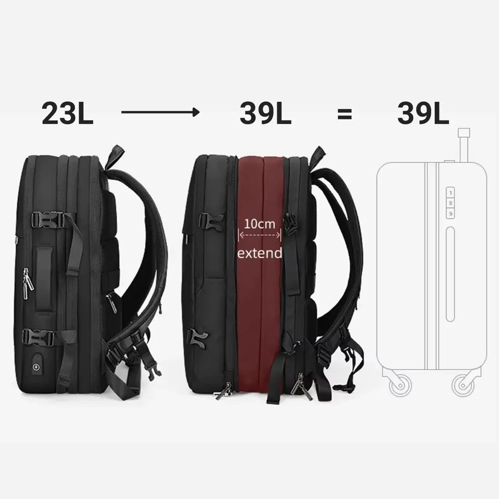 The Expandable Carry-On Backpack: Versatile Design for Every Journey ✔️ Expandable Capacity: Adjusts from 22L to 35L to suit your travel needs. ✔️ Cabin-Ready: Perfectly sized to fit in the overhead compartment. ✔️ Dedicated Laptop & Tablet Layer: Easy access without rummaging through the main compartment. ✔️ USB Charging Port: Stay connected on the go. ✔️ Luggage Sleeve: Effortlessly secure it to your suitcase. ✔️ Water-Repellent Fabric: Keeps your essentials safe in unexpected weather. ✔️ Internal Wet & Dry Compartment: Organized packing for every trip. Ideal for business trips, weekend getaways, or staying within Ryanair’s cabin baggage limits, this backpack combines functionality with a sleek design. Key Features: Expandable Capacity: Adjustable from 22L to 35L, making it versatile for both short and extended trips. Cabin-Ready Design: Perfectly fits Ryanair and most airline cabin luggage specifications. Smart Organization: Dedicated padded compartments for a laptop (up to 15.6”) and tablet, plus multiple internal pockets for easy access to essentials. USB Charging Port: Built-in USB port ensures your devices stay powered during your travels. Water-Repellent Fabric: Premium material to protect your belongings from light rain and accidental spills. Wet & Dry Compartments: Separate spaces to keep wet items from mixing with your dry essentials. Ergonomic Comfort: Lightweight design with adjustable, padded shoulder straps. Luggage Sleeve: Slides onto your suitcase handle for convenient travel. Top and Side Grab Handles: Handy for quick carrying. Specifications: Dimensions (Not Expanded): 44cm x 14cm x 31cm (17.3" x 5.5" x 12.2") Dimensions (Expanded): 44cm x 24cm x 31cm (17.3" x 9.4" x 12.2") Capacity: 23L to 39L Main Material: Durable Oxford fabric Lining Material: High-quality polyester