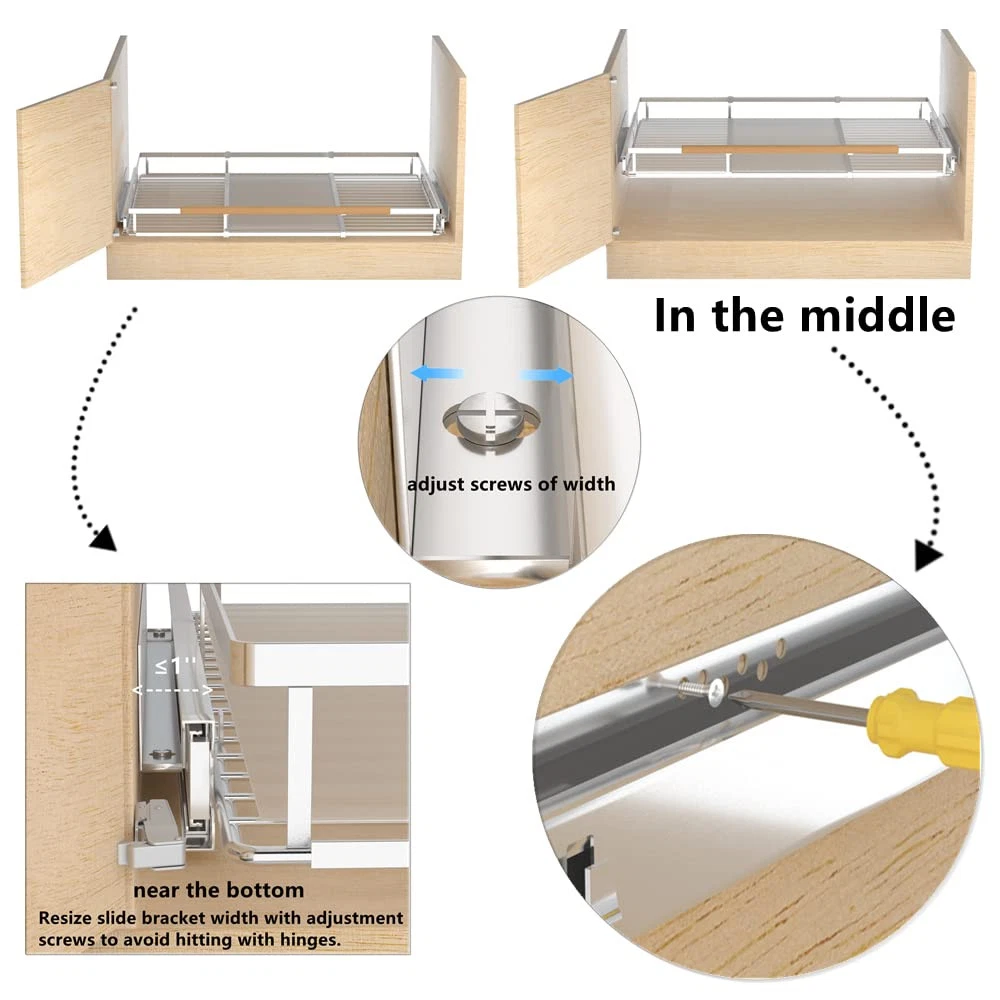 【Slide-Out Shelf】This pull out cabitnet drawer can be adjusted width from 12“ to 18.2”. Depth 16.9". Height 2.6". This pull out cabitnet shelf is designed to fit in small cabinets. 【Well Construction】Made of high quality chrome stainless steel, which is sturdy and durable and has a strong load-bearing capacity. Industrial-ball bearing system ensures quiet and smooth sliding every time. The drawer shelves is removable and washable, give you a tidy home. Includes a 2-year limited to ensure top quality. 【Space Saving】The rails are installed on both sides of the cabinet, so you can install the height of the shelf according to your need. Organize your spice racks, pans, cooking utensils, cleaning supplies, etc. Fit in many places like kitchen/cabinets/under the sink/closet/bathroom vanity/pantry/book shelves. 【Easy Installation】Package contains detailed instructions and all necessary hardware. Notice for proper installation, please make sure that the width of your cabinet is between 13 to17 inch, the depth is more than 18 inch deep. 【100% Satisfaction 】If you have any questions about the product(missing parts/bend/crack), please feel free to us, we will provide the best service!