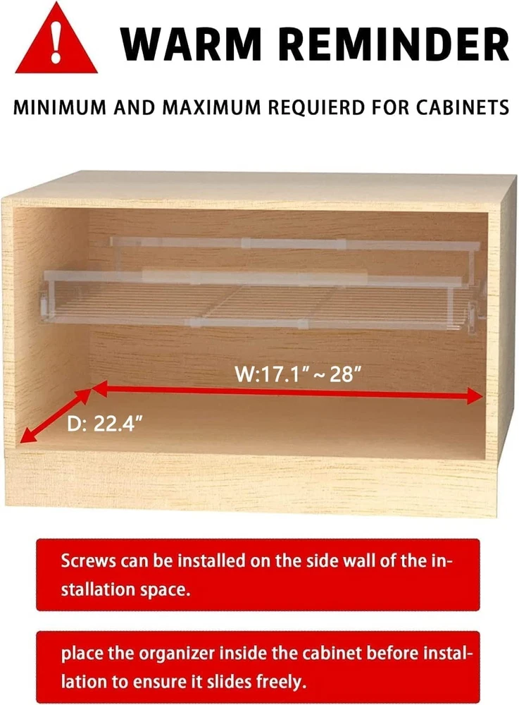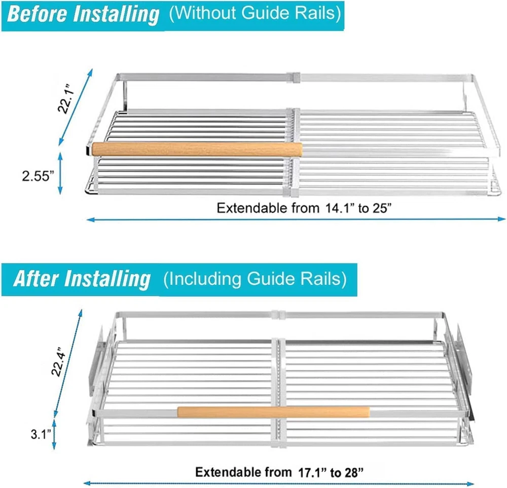 ✅【Space-Saving Cabinet Organizer】: The slide out cabinet organizer is designed to storage kitchen items and put the clutter away in order to give you a tidy home! The sliding drawer system suits for many places in your kitchen, such as cabinets, under sink, pot rack, cupboard, wardrobe, etc. And it's also suitable for bathrooms and laundry rooms, organizing cleaning supplies. ✅【Expandable and Pull Out Design】: The width of this cabinet drawers can be adjusted to your desire. The original pullout organizer measures 17.1" W x 22.4" D x 3" H. The width can be extended from 17.1” to 28” according to your needs. The slide out design makes kitchen organization easy to store and access. ✅【Smooth and Quiet Sliding】: The cabinet pull out shelves is manufactured with industrial-grade ball sliding system, Sliding out ultra-smooth even under the heavy weight of kitchen utensils (Such as kitchen mixers, pots and pans, dishes, plates and spices), Without unpleasant noise. ✅【Sturdy and Reliable Materials】: Our pull out cabinet organizers made of high quality chromed stainless steel, prevent scratches, not easy to rust and deform, and features excellent stability. Smooth surface and chrome color can be matched with various style of cabinets, suitable for variety of family styles. ✅【Easy to Install】: Please measure the size of your cabinets before purchasing. The installation method is very simple, just follow the instructions to complete easily. And the package includes the hardware required for installation. We are always responsible for our pull out drawers, Up to ONE YEAR replacement/refund service, please feel free to contact us if you with any issue.