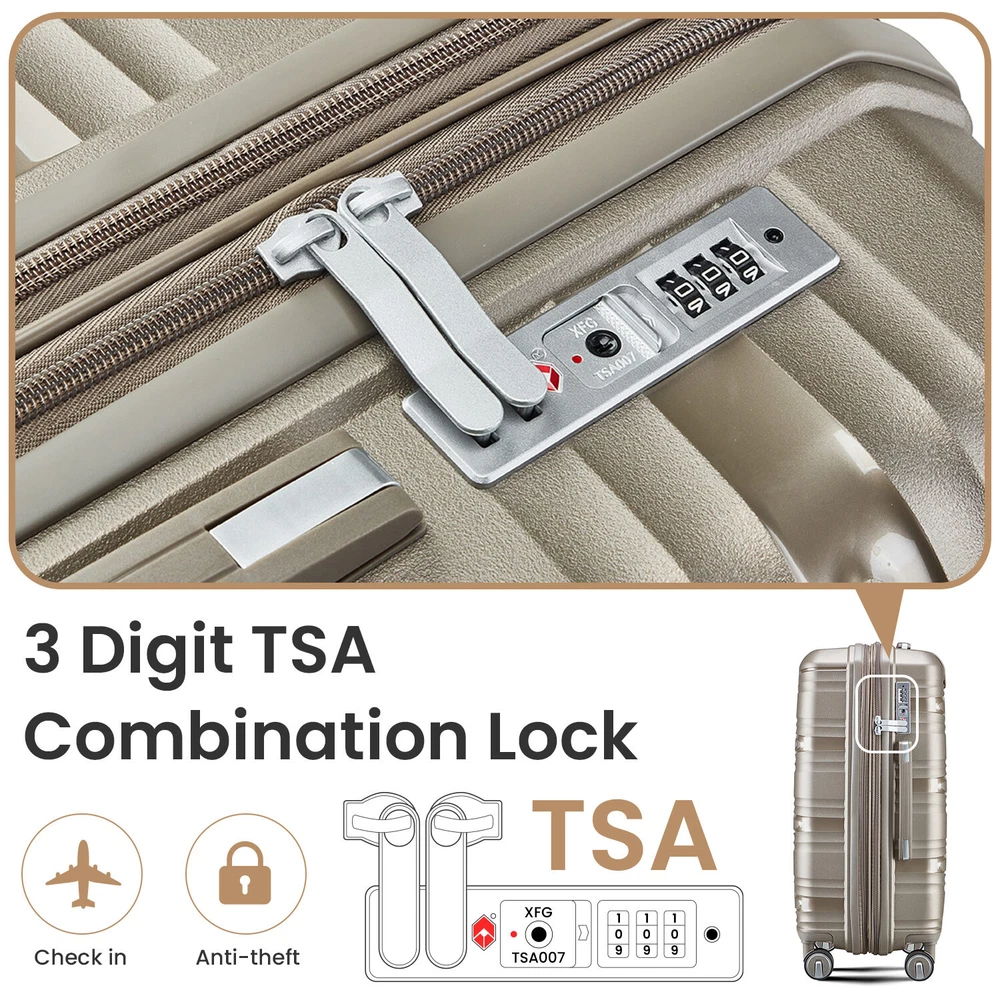 Product Information Item Code:W2098126492 Product Type:General Item Product Name:Luggage 4 Piece Sets(14/20/24/28), Hard Shell Lightweight TSA Lock Carry on Expandable Suitcase with Spinner Wheels Travel Set for Men Women Place of Origin:China Main Color:Champagne Main Material:Polypropylene Product Dimensions Assembled Length (in.):18.30 Assembled Width (in.):10.80 Assembled Height (in.):29.00 Weight (lbs.):24.00 Package Size Length (in.):19.30 Width (in.):11.80 Height (in.):30.00 Weight (lbs.):26.50 Product Features Lightweight Luggage Sets: Made of environmentally friendly imported ultra-light PP material, Compared with ABS and PC plastics, PP materials suitcase have better resilience, it can be restored to its original state after being hit violently. Luggage 4 piece sets are the best choice for travel, family travel and business travel. Expandable 4 Piece Luggage Set: The 14 inch suitcase can store some daily necessities such as cosmetics, water glasses, etc. which is easy to access at any time. 20 inch carry on luggage & 24 inch suitcase is perfect for business and personal travel, 24 inch & 28 inch luggage is expandable, which can expand 25% of the additional space. Luggage with TSA Lock: TSA customs password lock design to avoid violent damage to the luggage. which allows only TSA agents to inspect your bags without damaging the lock when traveling. Silent Suitcases with Spinner Wheels: Luggage with spinner wheels can help save your strength and make your suitcase lighter. Luggage moves very silent and smoothly with 360° rotate double wheels, which better than other singer wheel. Full interior space: Travel luggage with fully lined interior has adjustable tie-down straps for securing garments in place.This roller suitcase has reinforced padded top and side handles to make it easier to lift and carry your luggage.