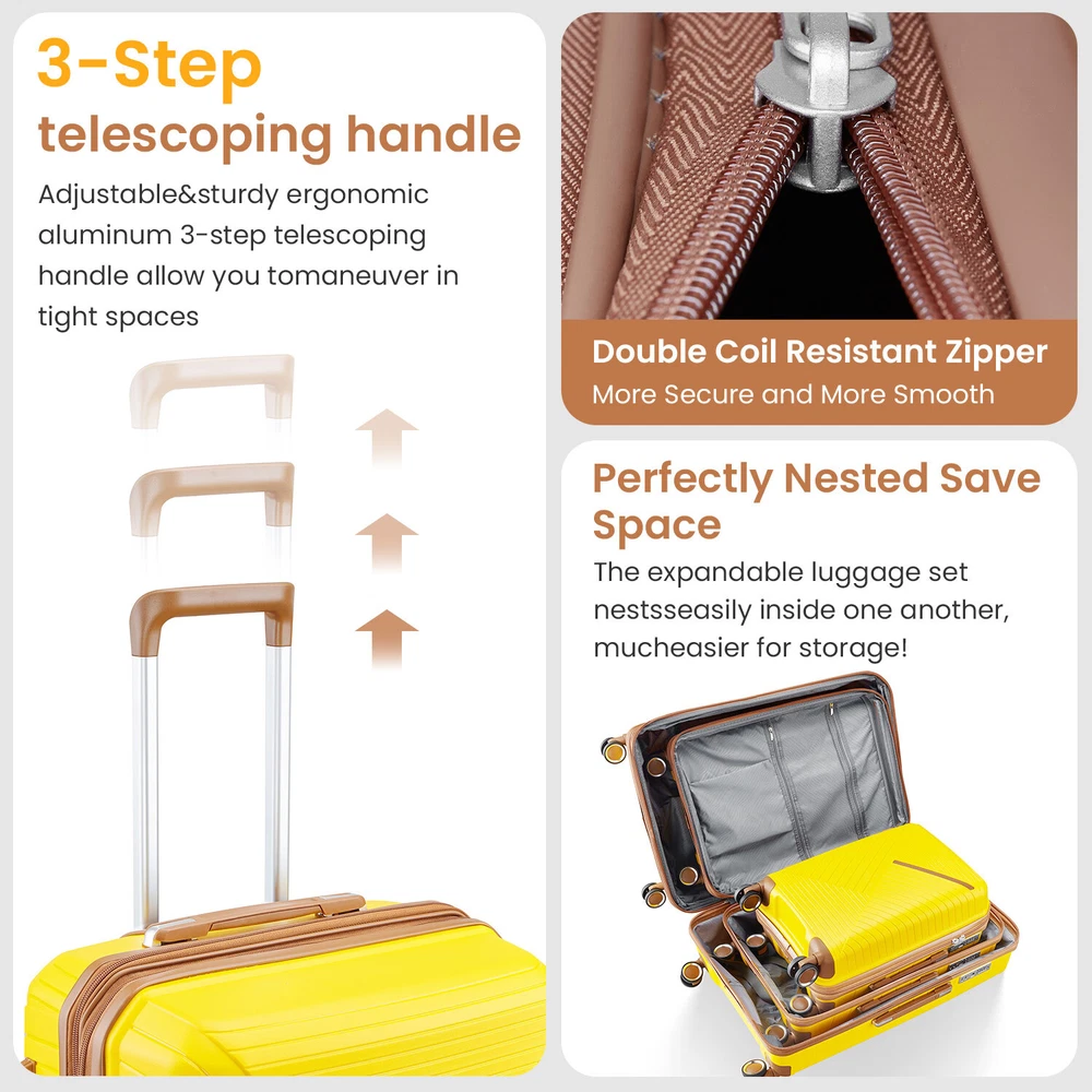 Specification Product Information Item Code:W2098P186378 Product Type:General Item Product Name:Luggage Sets 4 Piece(14/20/24/28), Expandable Lightweight Suitcase with 4 Double 360 Degrees Mute Spinner Wheels PP Materials Durable TSA Lock Travel Luggage Place of Origin:China Main Color:Yellow Main Material:Polypropylene Product Dimensions Assembled Length (in.):Not Applicable Assembled Width (in.):Not Applicable Assembled Height (in.):Not Applicable Weight (lbs.):Not Applicable Package Size Length (in.):19.30 Width (in.):11.80 Height (in.):30.00 Weight (lbs.):26.50 Product Features Lightweight & Durable: This family luggage is made of strong waterproof PP exterior and black lined interior, which is easy to clean and long-term use. In addition, it is light in weight and easy to carry. Four molded side feet keep the luggage upright even when standing on its side. TSA Lock: The side of the trolley case is equipped with a TSA lock to increase safety and reduce damage. The zipper is not easy to be pierced by sharp tools such as pens, which better protects the items and privacy in the luggage. Ideal Storage Space: Store as many essentials as possible, luggage shouldn't be a stress on your travels. The interior is equipped with cross straps and a partition bag with zipper, which can better protect your items during use. Modern Appearance: The hard shell suitcase has a stylish texture design, which brings a pleasant mood to your journey. What's more, it can better resist scratches and keep the case looking good after travel. It can meet all your travel needs. Elaborate Design: 360°multi-directional universal wheels, can move smoothly and smoothly in all directions. The adjustable and sturdy ergonomic aluminum telescoping handle allows you to maneuver in tight spaces and provides easy movement.