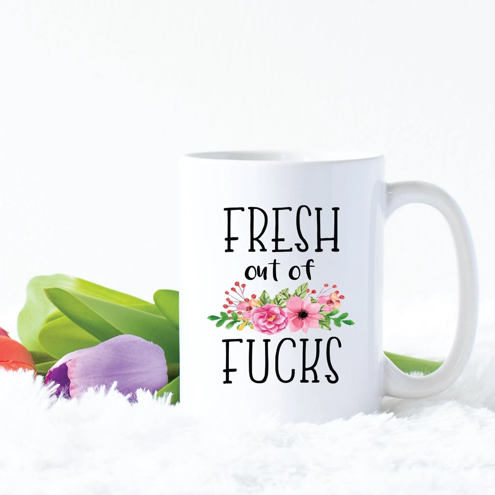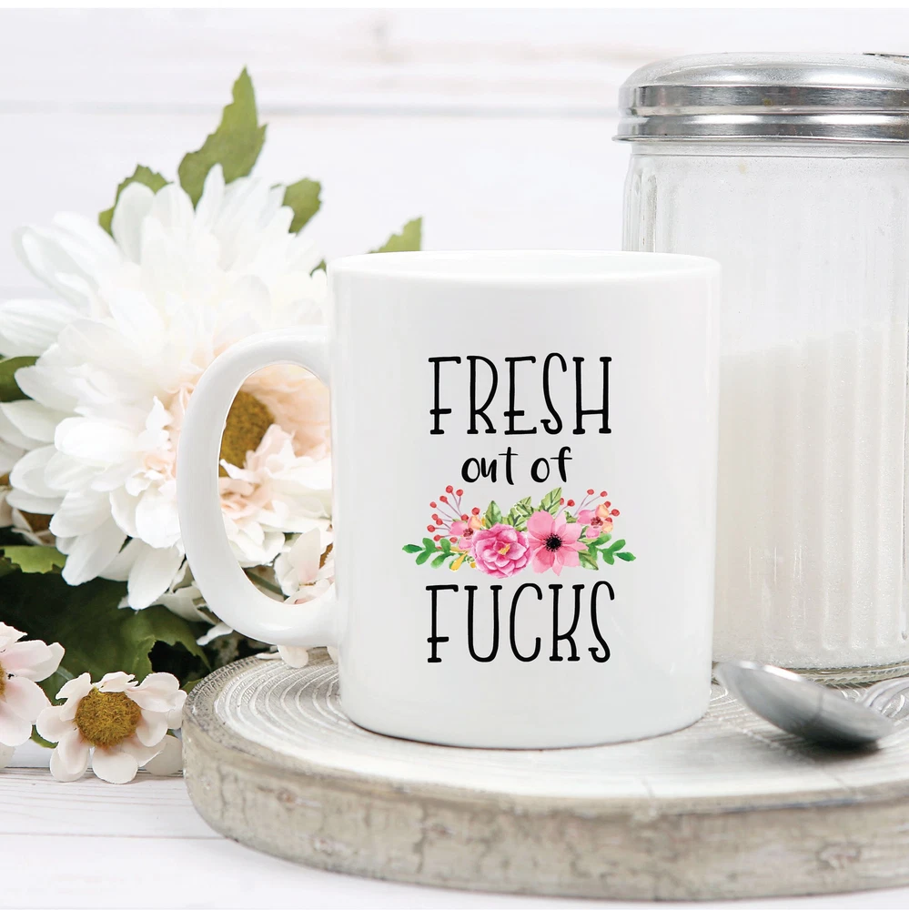 Expletive Coffee Mug Fresh Out Of F*cks Cup Product Details.. This high quality 11oz. ceramic white mug has a premium hard coat that provides crisp and vibrant color reproduction sure to last for years. Perfect for all hot & cold beverages. The highest quality printing possible is used. It will never fade no matter how many times you wash it. Material: 100% Ceramic. Print both sides. Dishwasher and Microwave Safe. High Gloss + Premium White Finish. Printed in the U.S.A. Personalized & Custom. We support personalized and custom mug to add custom, when placing an order, you can add notes to the "order note" in shipping address section. Also you can contact us directly via message. Shipping Info. Ready to ship in 1 to 2 business days, All products are made-to-order and proudly printed in the United States. Shipped by USPS and DHL, You will receive your order in 5-7 days. Replace & Refund. All products are defective during shipping broken, chipped will be replaced free of charge. You are not satisfied with the product, we will refund 100% money to you. If any other issues arise, please do not hesitate to message, we would be more than happy to assist you.