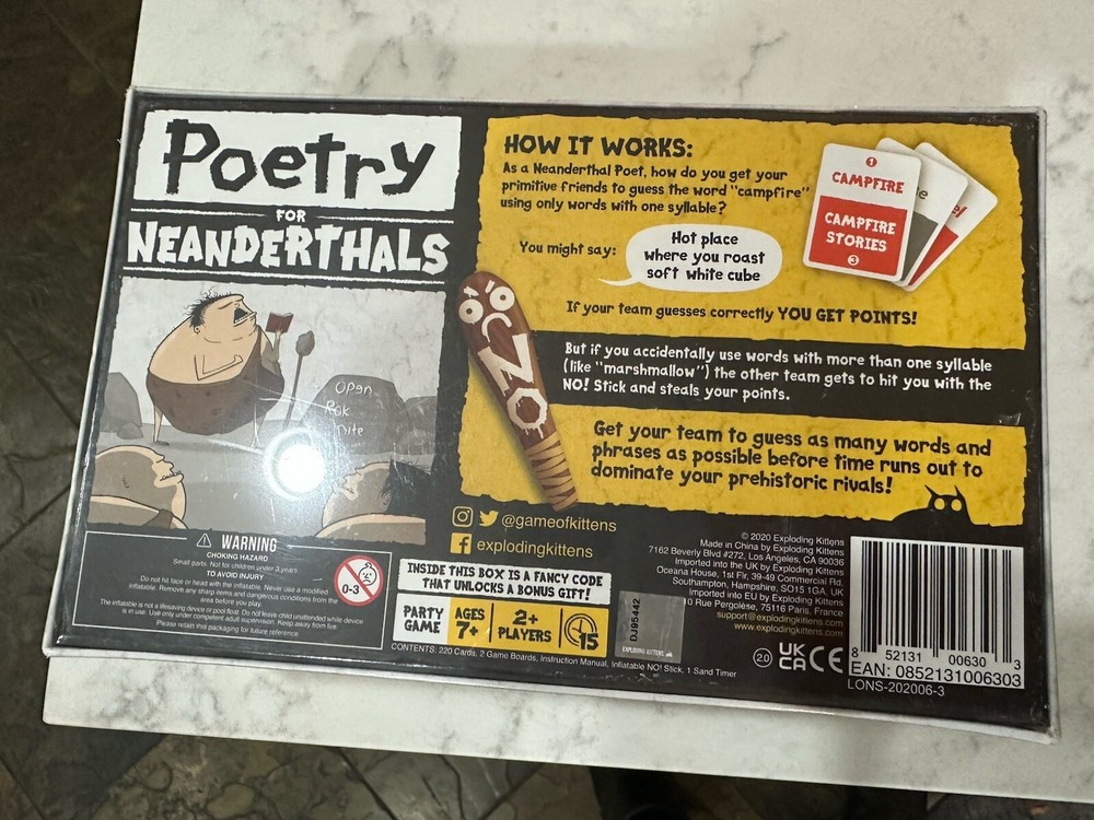 gtin13:0852131006303Brand:Exploding KittensType:Complete GameMPN:POETRY-CORE-1Year:2021Min. Number of Players:2 playersUPC:0852131006303Theme:StrategyRecommended Age Range:7+ yearsGame Title:Poetry for NeanderthalsAge Level:12-16 Years, 8-11 Years, 17 Years & UpGender:Boys & GirlsGame Type:Word Game