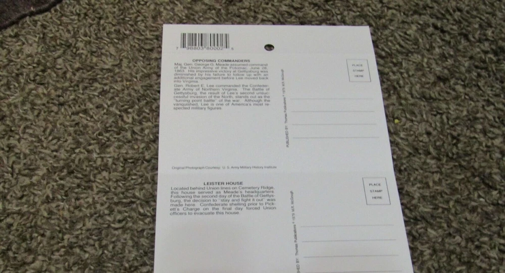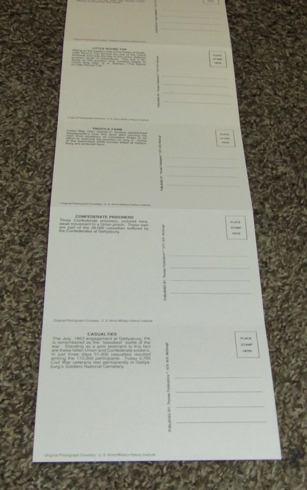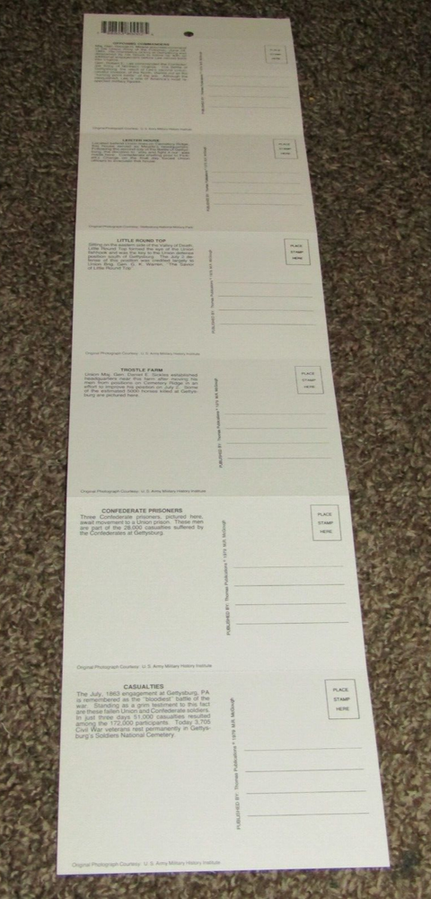 Gettysburg Civil War Battle Scene Photos - 6 Postcards Set, New Old Stock 6 different post cards. Each one is perforated to separate them. Published by Thomas Publications 1979 Be sure to SAVE me on Ebay, as I add more items each week that you may like. FREE SHIPPING NO INTERNATIONAL SHIPPING, BE SURE TO CHECK EACH IMAGE & ASK ANY QUESTIONS BEFORE BIDDING. THANKS FOR LOOKING & HAVE A NICE WEEK!!!!!