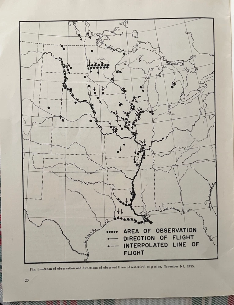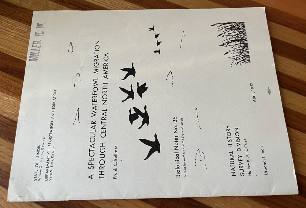 A spectacular waterfowl migration through central North America, 1957. Author is Frank C. Bellrose. Illinois Natural History Survey, Biological Notes No. 36. Paperback, Staple Bound. 24 pages. A waterfowl conservation classic. Nice condition. There is a name stamp on the front cover. Some wear (rubbing, mild staining) to the front and back cover. There is a small tear near the bottom center of the front cover and mild bending to the outer bottom corner. If additional books are purchased, I will gladly combine all into one shipment to reduce postage costs. Savings on postage will be returned to the buyer. Note that there is an additional Frank Bellrose publication listed.