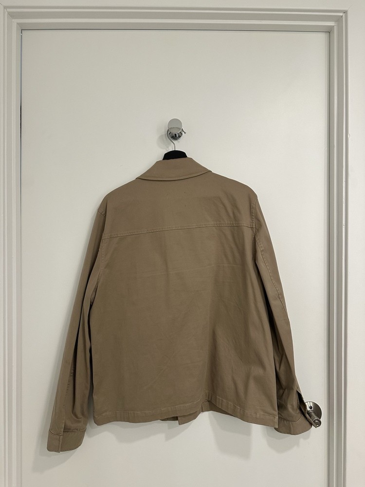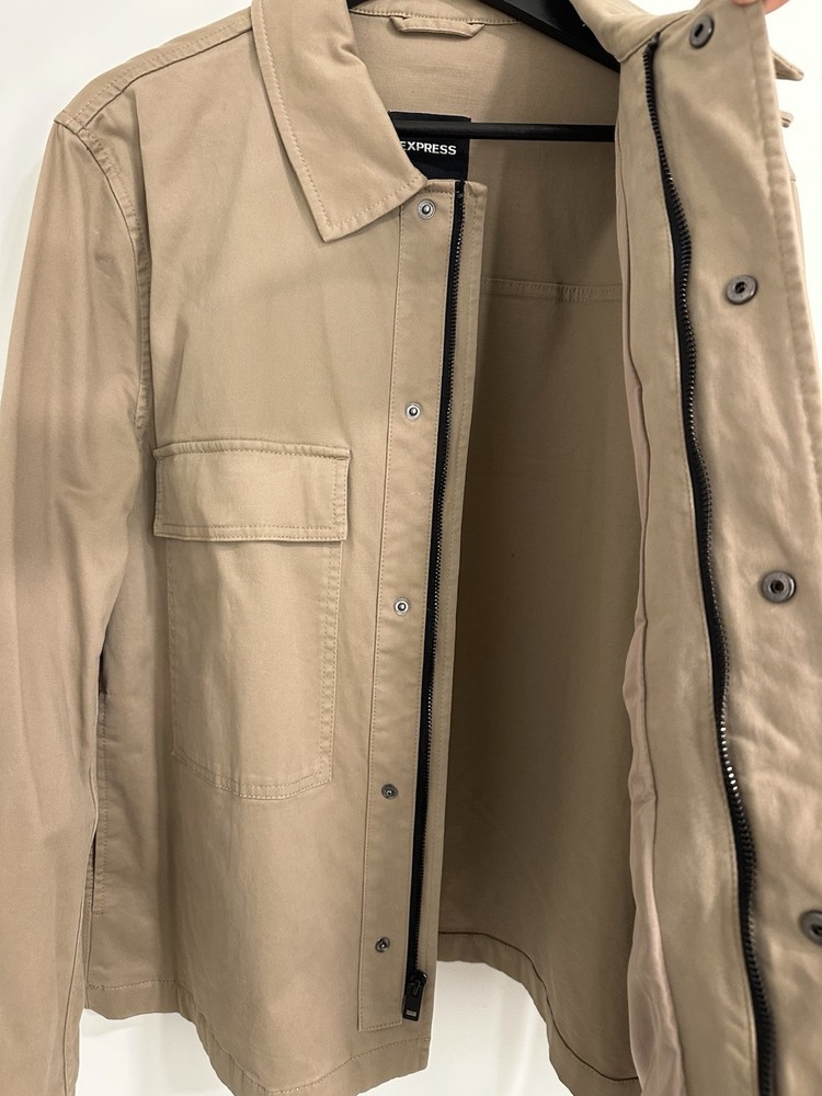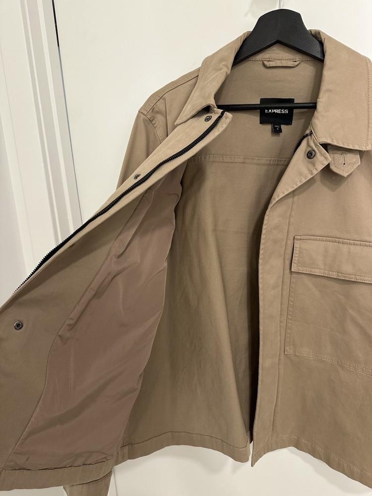 • Express premium / higher-end line piece from approximately 5–6 years ago • Purchased when Express was producing higher-quality, elevated essentials • Worn approximately 5 times total, very light use • Excellent condition with no noticeable flaws • Clean, minimalist utility / field jacket design • Structured cotton fabric with a smooth hand feel • Neutral tan color, easy to style year-round • Two front utility chest pockets • Button and zip front closure (covered placket) • Unlined, ideal for layering in spring, fall, or mild winter