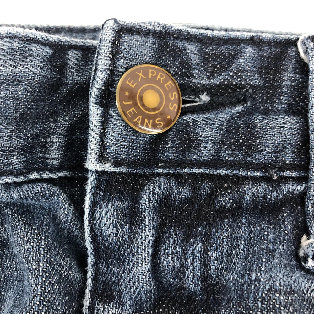 Elevate your denim collection with these Express bootcut jeans for women. The dark wash and solid pattern of these jeans make them a versatile addition to your wardrobe. The denim fabric with a touch of stretch provides comfort and ease of movement, while the button, zipper, and logo accents add a touch of style. These jeans are perfect for any casual occasion and can be paired with a variety of tops and shoes.