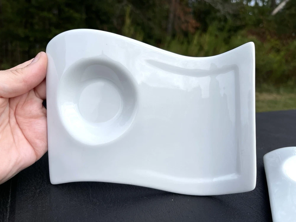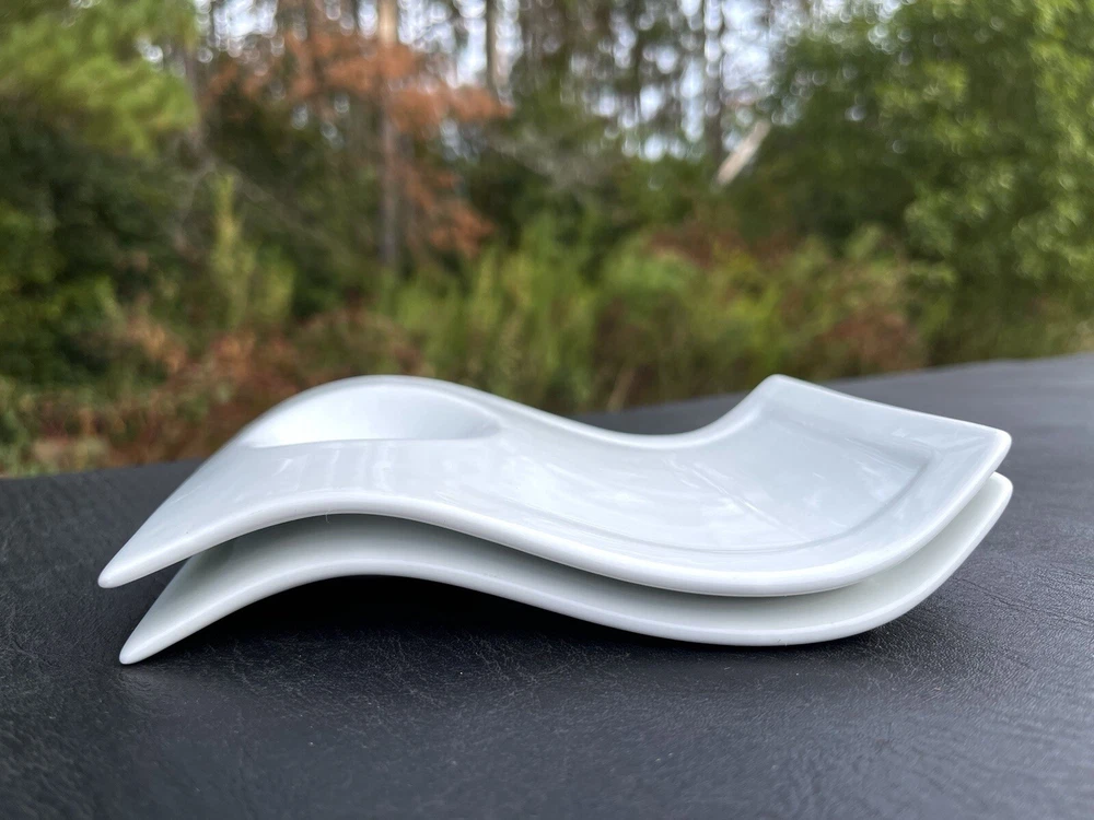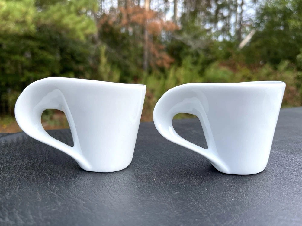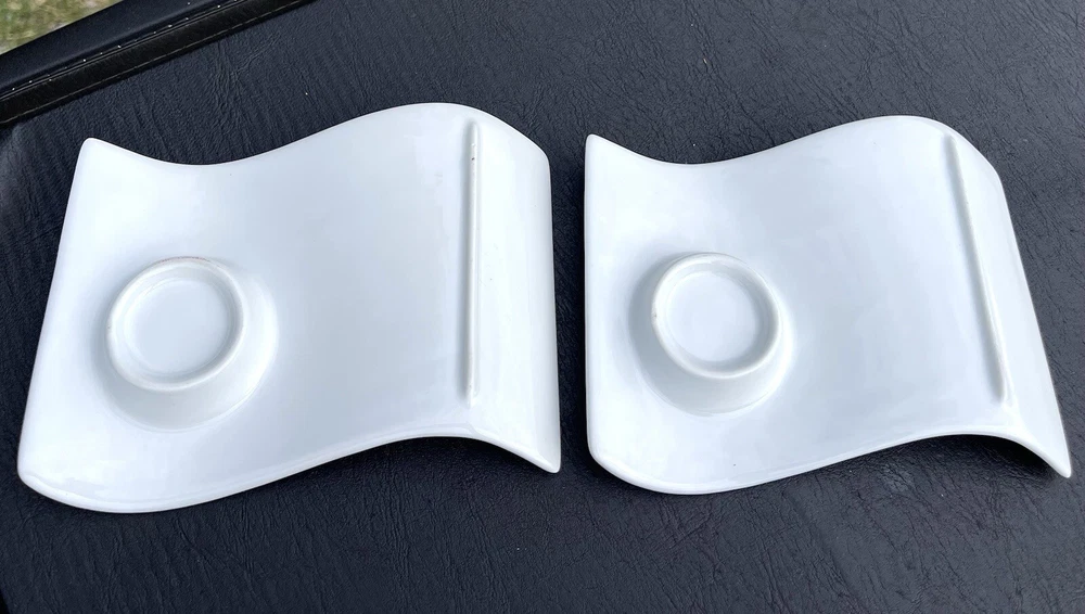 Please note: There is x2 expresso mugs and x2 wave plates only does not come with original box or paper work. They are unbranded but look identical to name brands for a great price. Good used condition no chips or cracks. Please see all photos before purchasing. Thanks for looking and supporting small business. Each wave plate measures about 6.5” long and 4.5” inches wide at the wider part of the wave Each expresso mug is 2.5” tall and has a diameter of 2.5”