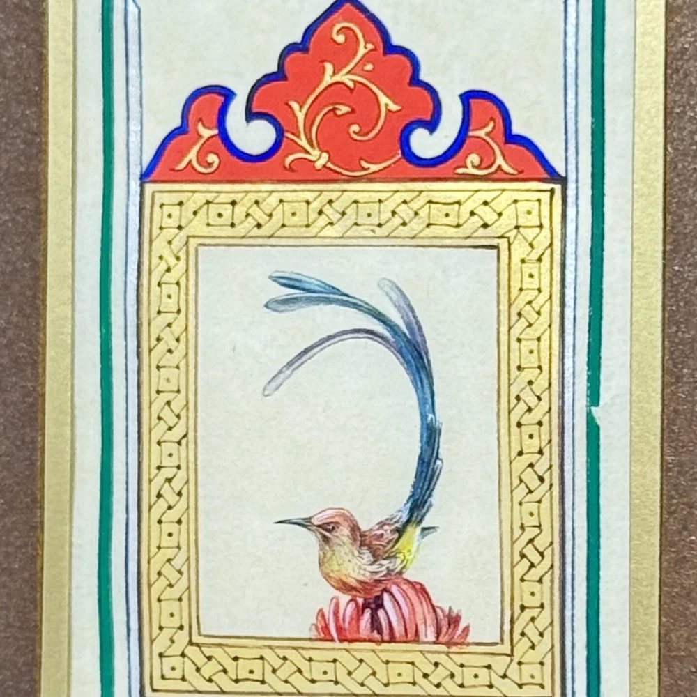 Framed Artwork: Tiny Bird Portrait ( Fine Walnut Frame, Protected with Glass, Hermetically Sealed ) An unparalleled masterpiece of miniature art, this framed portrait of a tiny bird is a testament to exceptional precision and timeless craftsmanship. Painted under a magnifying glass, the intricate details come alive through the use of a fine brush and a masterful combination of materials — including watercolor, gold leaf, gold gouache, acrylic, tempera, and liquid ink. Each element of this artwork is a harmonious fusion of nature’s beauty and ornamental design, brought to life on the finest silk paper. Encased in an elegant walnut frame, this piece is meticulously crafted to elevate any interior, exuding sophistication and artistic excellence. A true Collector’s Edition , this fine art painting embodies the spirit of luxury, rarity, and cultural richness. Ready to hang, it is perfect for collectors seeking to own a piece of extraordinary artistry. Brought to life by ARTBEHZODIYUS — where the spirit of timeless artistry and unrivaled craftsmanship unite. We also are pleased to offer a custom ( framing, sizes, colors, composition) made-to-order piece, so we encourage customers to contact us before any customizations. This ensures we provide an accurate timeline for completion and customize the piece to your preferences.