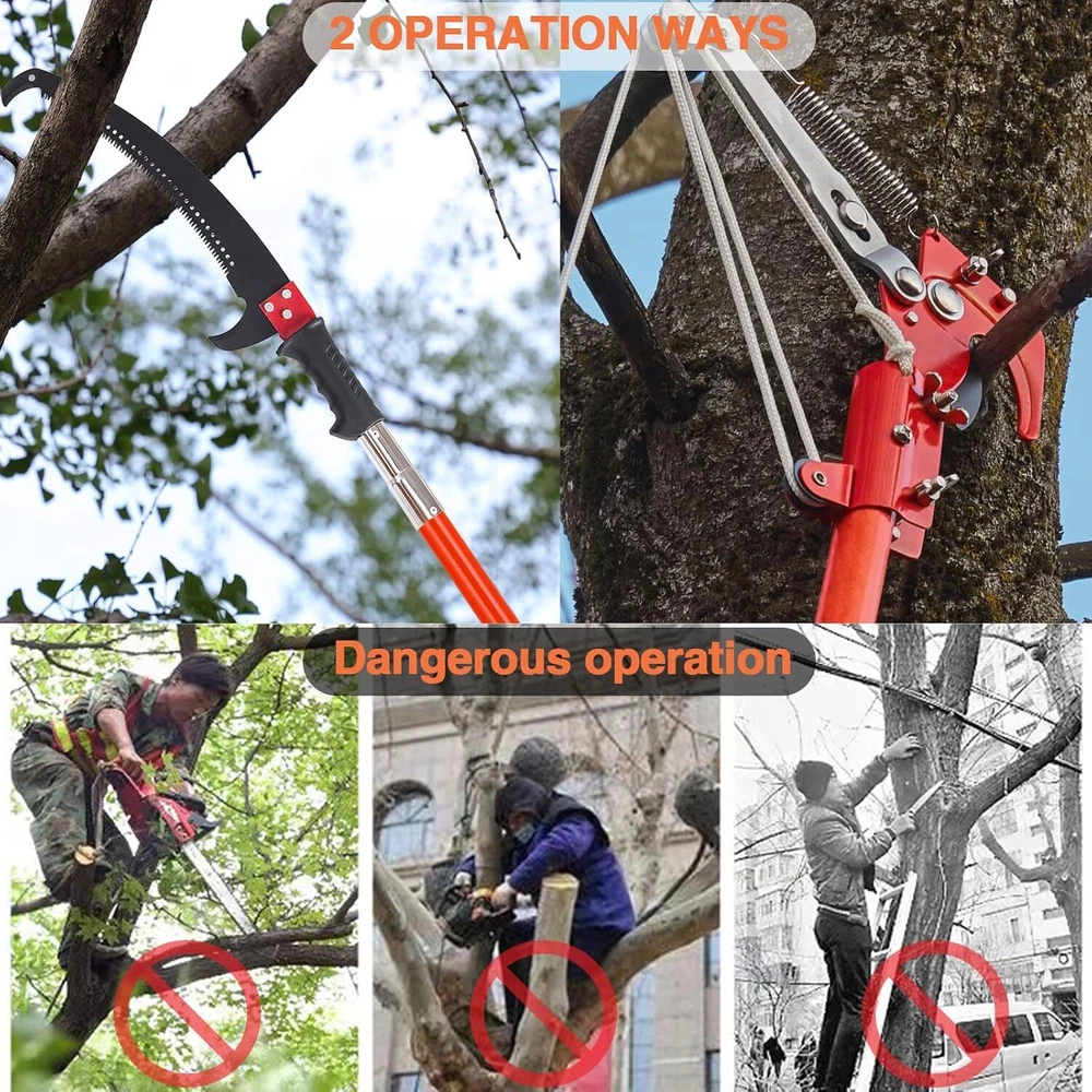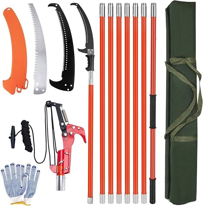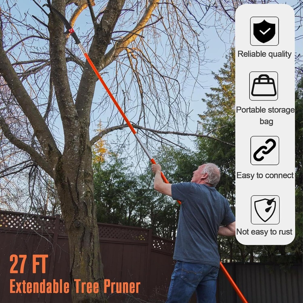 Pole Saws for Tree Trimming, 7.3-27 ft Manual Pole Saw Extendable Tree Trimmer, Long Branch Trimmer Tree Pole Pruner Saw Blades and Scissors Set for Pruning Palms and Shrubs (Red) 【Pole Saws for Tree Trimming】This tree pruner pole saw is designed for easy tree trimming. With its strong toughness and sharpness, it can effortlessly cut through branches. Suitable for palm trees, pine, fir and oak and more. This manual pole saw is widely used in lawns, gardens, forestry and other places where trees need to be trimmed. You can also easily trim high and hard-to-reach branches without bending down, climbing a ladder, and avoiding the dangers of working at heights. 【Spring-Action Pruning Jaws and Hacksaw Head】 Ideal for shearing smaller branches, the pulley-operated spring-action pruning jaws are made of hardened carbon steel. The high-strength alloy hacksaw head, after high-temperature heat treatment, features sharper grinding teeth on three sides for smoother cutting, making it very suitable for sawing thicker branches. 【Extendable Pole Saw】 The tree pole saw has 8 poles of 3.28 feet each, with a maximum length of 27ft, this extendable tree trimmer allows you to reach higher branches without the need for a ladder. It provides convenience and safety during tree trimming. 【Durable and Sturdy】 The long branch trimmer blade is crafted from rust-proof and long-lasting 0.05" / 1.2 mm thick carbon steel. The epoxy resin pole is lightweight and durable. Corrosion resistance, strong bearing capacity, and good insulation performance. It ensures long-lasting performance and can withstand tough tree trimming jobs. 【Easy Assembly】 The tree pole pruner is easy to assemble, the pole connection is threaded structure, easy to install and remove. Palm tree trimmer comes with a sturdy nylon bag for easy portability. Buy with confidence. Blade Material Alloy Steel Surface Recommendation Alloy Steel Power Source Manual Special Feature Extendable Pole, Spring-Action Pruning Jaws, Hacksaw Head