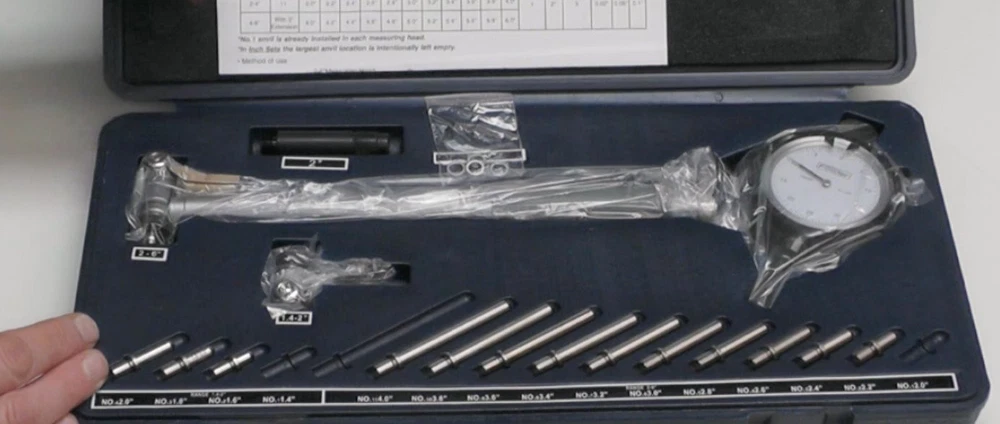 Cylinder Dial Bore Gage with carbide tipped anvils has a measurement range of 1.4 to 6 ". This product has a 1-year warranty offered by High Precision. Bore gages measure holes, or bores, in a workpiece. They can measure the interior diameter of a hole at any depth (within its reach), while internal micrometers can only measure to the depth of their contacts. Bore gages are typically calibrated with a setting ring and come in two types: simple and direct measuring. Simple bore gauges are used with a caliper to transfer the hole measurement, while the more complex gauges take the measurement directly and display it through a vernier, dial, or digital display. Bore gages have a two- or three-point contact, indicating how many points on the gage head touch the inside of the bore. Two-point contacts are better at measuring ovality, while three-point contacts are used to measure lobing or triangular form error. Pistol-grip bore gages are used for fast, single-handed operation with repeatable results from one operator to another. Bore gages can also be used in special applications, such as measuring threads, spline pitch diameters, and deep bores. , an American company, manufactures premium inspection and measurement instruments like electronic indicators, calipers, bore gages, and micrometers. The company, founded in 1946, is headquartered in Newton, MA. ACCURATE MEASUREMENTS: This bore gage features a dial indicator with a graduations of 0.0005" and a measuring depth of 9.5" EXTENDED RANGE: This 1.4-6" range bore gage, with a two-point contact system, is used for measuring hole diameters and also to detect geometry abnormalities such as ovality and taper; carbide-tipped anvil contact points provide extended wear and improved abrasion resistance SELF CENTERING: The easily adjustable bore gauge is self-centering for fast, accurate measurements EASY AND EFFICIENT: This bore gage comes with an insulated grip and a chrome plated handle for easy use. SET INCLUDES: Set comes with two self-centering measuring heads, an extension holder, spacers, and a fitted case
