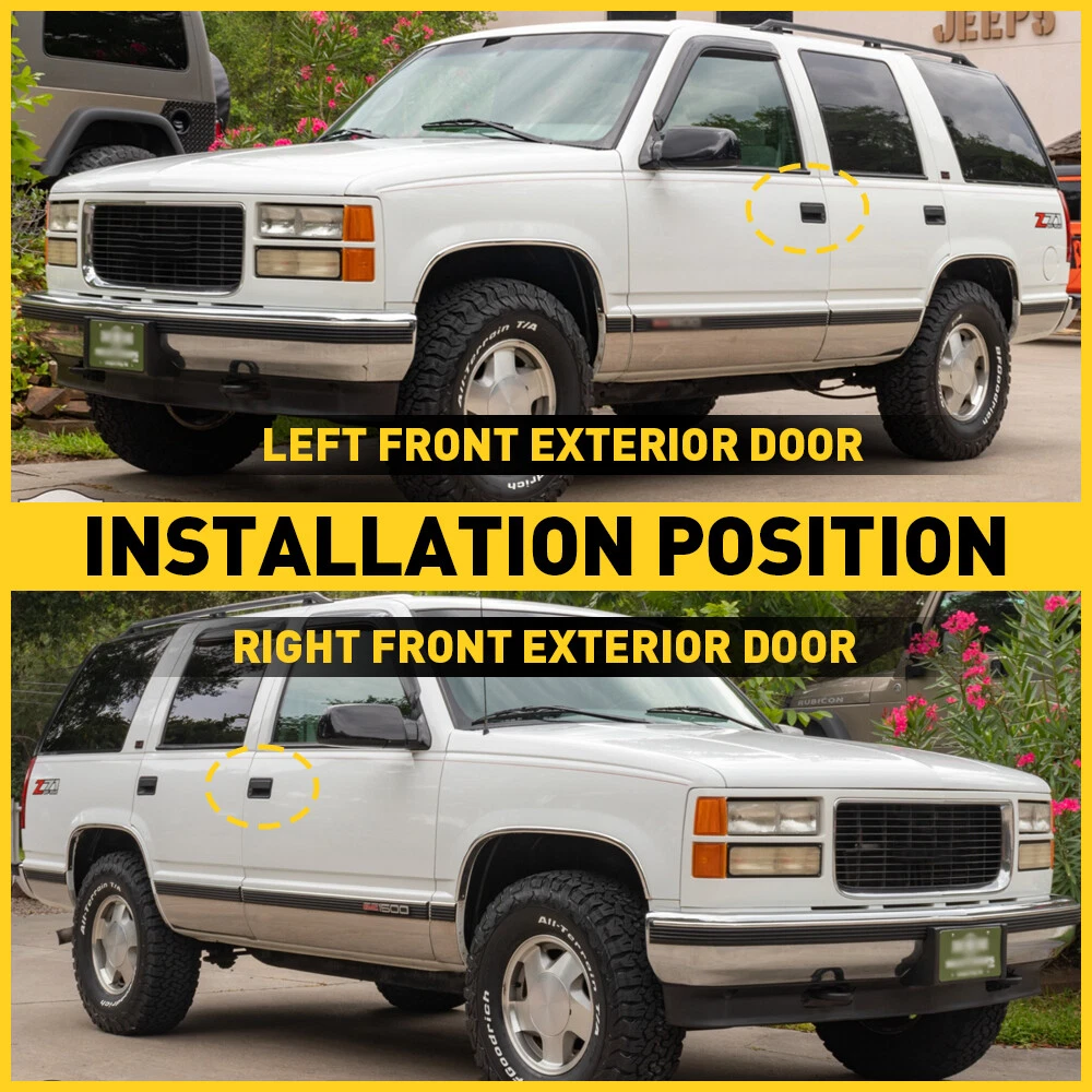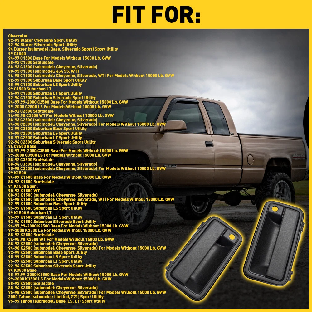Fits for: Cadillac 99-2000 Escalade Base Sport Utility Chevrolet 92-93 Blazer Cheyenne Sport Utility 92-94 Blazer Silverado Sport Utility 94 Blazer (submodel: Base, Silverado Sport) Sport Utility 99 C1500 94-97 C1500 Base For Models Without 15000 Lb. GVW 88-92 C1500 Scottsdale 88-93 C1500 (submodel: Cheyenne, Silverado) 90-93 C1500 (submodel: 454 SS, WT) 94-98 C1500 (submodel: Cheyenne, Silverado, WT) For Models Without 15000 Lb. GVW 92-99 C1500 Suburban Base Sport Utility 95-99 C1500 Suburban LS Sport Utility 99 C1500 Suburban LT 95-97 C1500 Suburban LT Sport Utility Exterior Door Handle For Chevrolet 88-99 K1500 C1500 Set of 2 Front Fits for: Cadillac 99-2000 Escalade Base Sport Utility Chevrolet 92-93 Blazer Cheyenne Sport Utility 92-94 Blazer Silverado Sport Utility 94 Blazer (submodel: Base, Silverado Sport) Sport Utility 99 C1500 94-97 C1500 Base For Models Without 15000 Lb. GVW 88-92 C1500 Scottsdale 88-93 C1500 (submodel: Cheyenne, Silverado) 90-93 C1500 (submodel: 454 SS, WT) 94-98 C1500 (submodel: Cheyenne, Silverado, WT) For Models Without 15000 Lb. GVW 92-99 C1500 Suburban Base Sport Utility 95-99 C1500 Suburban LS Sport Utility 99 C1500 Suburban LT 95-97 C1500 Suburban LT Sport Utility 92-94 C1500 Suburban Silverado Sport Utility 94-97,99-2000 C2500 Base For Models Without 15000 Lb. GVW 99-2000 C2500 LS For Models Without 15000 Lb. GVW 88-92 C2500 Scottsdale 94-95,98 C2500 WT For Models Without 15000 Lb. GVW 88-93 C2500 (submodel: Cheyenne, Silverado) 94-98 C2500 (submodel: Cheyenne, Silverado) For Models Without 15000 Lb. GVW 92-99 C2500 Suburban Base Sport Utility 95-99 C2500 Suburban LS Sport Utility 95-97 C2500 Suburban LT Sport Utility 92-94 C2500 Suburban Silverado Sport Utility 94 C3500 Base 95-97,99-2000 C3500 Base For Models Without 15000 Lb. GVW 99-2000 C3500 LS For Models Without 15000 Lb. GVW 88-92 C3500 Scottsdale 88-94 C3500 (submodel: Cheyenne, Silverado) 95-98 C3500 (submodel: Cheyenne, Silverado) For Models Without 15000 Lb. GVW 99 K1500 94-97 K1500 Base For Models Without 15000 Lb. GVW 88-92 K1500 Scottsdale 91 K1500 Sport 90-93 K1500 WT 88-93 K1500 (submodel: Cheyenne, Silverado) 94-98 K1500 (submodel: Cheyenne, Silverado, WT) For Models Without 15000 Lb. GVW 92-99 K1500 Suburban Base Sport Utility 95-99 K1500 Suburban LS Sport Utility 99 K1500 Suburban LT 95-97 K1500 Suburban LT Sport Utility 92-94 K1500 Suburban Silverado Sport Utility 94-97,99-2000 K2500 Base For Models Without 15000 Lb. GVW 99-2000 K2500 LS For Models Without 15000 Lb. GVW 88-92 K2500 Scottsdale 94-95,98 K2500 WT For Models Without 15000 Lb. GVW 88-93 K2500 (submodel: Cheyenne, Silverado) 94-98 K2500 (submodel: Cheyenne, Silverado) For Models Without 15000 Lb. GVW 92-99 K2500 Suburban Base Sport Utility 95-99 K2500 Suburban LS Sport Utility 95-97 K2500 Suburban LT Sport Utility 92-94 K2500 Suburban Silverado Sport Utility 94 K3500 Base 95-97,99-2000 K3500 Base For Models Without 15000 Lb. GVW 99-2000 K3500 LS For Models Without 15000 Lb. GVW 88-92 K3500 Scottsdale 88-94 K3500 (submodel: Cheyenne, Silverado) 95-98 K3500 (submodel: Cheyenne, Silverado) For Models Without 15000 Lb. GVW 2000 Tahoe (submodel: Limited, Z71) Sport Utility 95-99 Tahoe (submodel: Base, LS, LT) Sport Utility GMC 99 C1500 For Models Without 15000 Lbs. GVW 97 C1500 Sierra GT For Models Without 15000 Lbs. GVW 88-93 C1500 (submodel: Sierra, Sierra SLE, Sierra SLX) 95-98 C500 (submodel: Sierra SL, Sierra SLE, Sierra SLT, Sierra Special) For Models Without 15000 Lbs. GVW 95-99 C1500 Suburban SLT Sport Utility 92-99 C1500 Suburban (submodel: Base, SLE) Sport Utility 88-93 C2500 (submodel: Sierra, Sierra SLE, Sierra SLX) 95-2000 C2500 (submodel: Sierra SL, Sierra SLE, Sierra SLT) For Models Without 15000 Lbs. GVW 95-99 C2500 Suburban SLT Sport Utility 92-99 C2500 Suburban (submodel: Base, SLE) Sport Utility 88-93 C3500 (submodel: Sierra, Sierra SLE, Sierra SLX) 94-2000 C3500 (submodel: Sierra SL, Sierra SLE, Sierra SLT) For Models Without 15000 Lbs. GVW 2001 C3500HD For Models Without 15000 Lbs. GVW 91-94 C3500HD Base 95-2000 C3500HD Base For Models Without 15000 Lbs. GVW 99 K1500 For Models Without 15000 Lbs. GVW 95 K1500 Sierra SLS For Models Without 15000 Lbs. GVW 93 K1500 Sierra Sport 88-93 K1500 (submodel: Sierra, Sierra SLE, Sierra SLX) 95-98 K1500 (submodel: Sierra SL, Sierra SLE, Sierra SLT, Sierra Special) For Models Without 15000Lbs. GVW 95-99 K1500 Suburban SLT Sport Utility 92-99 K1500 Suburban (submodel: Base, SLE) Sport Utility 88-93 K2500 (submodel: Sierra, Sierra SLE, Sierra SLX) 95-2000 K2500 (submodel: Sierra SL, Sierra SLE, Sierra SLT) For Models Without 15000 Lbs. GVW 95-99 K2500 Suburban SLT Sport Utility 92-99 K2500 Suburban (submodel: Base, SLE) Sport Utility 93-2000 K3500 Sierra SLE For Models Without 15000 Lbs. GVW 88-92 K3500 (submodel: Sierra, Sierra SLE, Sierra SLX) 93 K3500 (submodel: Sierra, Sierra SLX) For Models Without 15000 Lbs. GVW 94-2000 K3500 (submodel: Sierra SL, Sierra SLT) For Models Without 15000 Lbs. GVW 92-95 Yukon Base 99-2000 Yukon Denali 93 Yukon GT 96-97 Yukon SL 92-99 Yukon SLE 95-99 Yukon SLT 92,94 Yukon Sport Specifications: OE number: 15742230, 15742229、GM1311132, GM1310132 15523571 15569441、15607105 15667243 15686155 15968163、15523572 15569442 15607106 15667244、15686156 15688164 15968164 77369,77374 Material: ABS Color:Black Placement on vehicle: Exterior(Front left+ right) Features: *Perfect fit Manufactured according to original one to match with your vehicle perfectly. *Strict Quality Control All of our handles undergo strict quality control not just before shipping but throughout the production process. *Durable Mainly made of high-quality plastic material to ensure the durability. Packaging include: Door Handle*2 Item Specifics Brand AUXITO Bundle Listing Yes Bundle Description 2x Exterior Front,Left,Right Door Handle Components (2) Exterior Door Handles Features Anti-Stain, Durable, Easy Installation, Scratch-Resistant Finish Textured Black Fitment Type 
