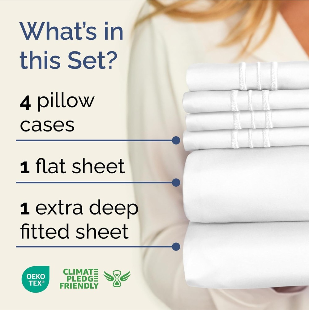Extra Deep King Sheet Set - 6 Piece Breathable & Cooling King, 01 - White Product Details Size: King Material: Polyester Color: 01 - White Pattern: Solid Brand: CGK Unlimited Number of Pieces: 6 Special Feature: Wrinke-Free, Hotel-Quality Style: 21Inch 6 Pcs Sheet Set Included Components: 4 Pillowcases, Fitted Sheet, Flat Sheet Closure Type: Pull-On Thread Count: 200 Age Range (Description): Adult Product Care Instructions: Machine Wash Theme: Solid Seasons: All Pillowcase Quantity: 4 Unit Count: 1 Count Manufacturer: CGK Unlimited Package Dimensions: 12.44 x 10 x 4.53 inches Item Weight: 4.13 pounds Country of Origin: China Item model number: 21InchKingWhite Is Discontinued By Manufacturer: No EXTRA DEEP POCKET KING SHEETS / EXTRA DEEP FITTED KING SHEETS: These bed sheets are for very deep pocket mattresses. They fit any mattress with pockets that are 18, 20, 21, 22 and 24 inches deep. There's stretchable elastic around the extra deep fitted sheet which stretches for a nice tug around your mattress. Perfect for extra tall & large mattresses. Rest assured these oversized sheets will stay on tight & stay in place! 6 PIECE SHEET SET: This bed sheet set comes with 4 pillowcases total all with a beautiful decorative embroidery design on each pillow case. The pillow cases have enclosure designs. This bedding set will accommodate your extra thick mattress perfectly. GREAT FOR DOUBLE PILLOW TOP MATTRESS: These bed sheets are perfect for mattresses with a 3 inch or 4 inch topper on top, memory foam toppers, big mattress pads, pillow tops, foam toppers, big foam toppers, pillow top mattresses and memory foam. These sheets will not come off. MICROFIBER: These are the softest type of microfiber bed sheets we have created. Super soft with a light feel. Not crisp like cotton. If you're accustomed to cotton sheets and you've never tried microfiber sheets we recommend you give these a try. They're even softer than cotton! DIMENSIONS & SIZES: Flat Sheet 111 wide and 102 long. Fitted sheet 78 wide and 80 long with 21 inch pockets (has elastic so it can stretch). All four pillow cases are oversized 20 x 40 inch.