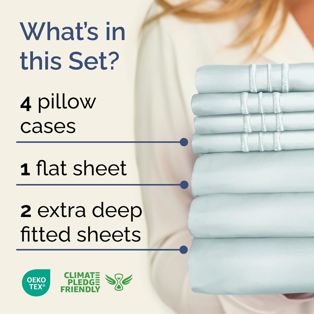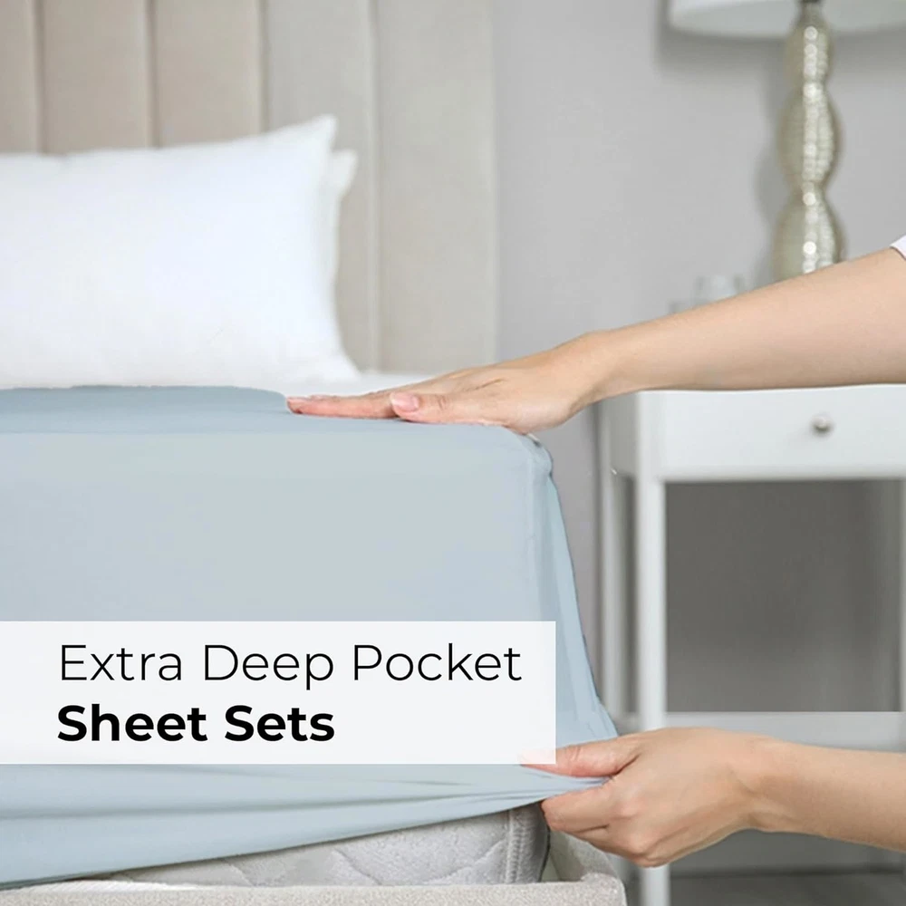 Fast Shipping Great Customer Support Satisfaction Guaranteed DESCRIPTION Shipping Shipping Shipping All domestic packages are shipped for Free (Unless other shipping method was selected during the checkout) Most items ship and arrive much sooner than the estimate delivery date. Usually within 2-3 days from payment. However, we have longer estimates to compensate for the occasional delay or supply chain breakdown. We do not accept P.O. BOXES - PLEASE PROVIDE A PHYSICAL ADDRESS Return Return Return In the event that you would like to return your purchase, we allow returns that are processed within the defined return date (the return date is to be found in the return policy/shipping and handling section) Please contact us for a return authorization and the return shipping address. Payment Payment Payment PayPal is our preferred method of payments it's the quickest, easiest and most secure way to pay for your goods or services online. PayPal offers buyer and seller protection should there be a problem. If you do not have a PayPal account, to get started and buy your first item with us is very easy. Simply click on the 'Buy It Now' button and follow the eBay checkout steps. Select PayPal as the payment method you then will be given the chance to enter your card details in to PayPal's secure checkout in order to pay for your order. Once the payment has been made, you will then be given the opportunity to make your own PayPal account to make paying for your items in the future very easy. Should there be a problem with payment please do let us know. Feedback Feedback Feedback Customer satisfaction is very important to us. If you have any problem with your order,please contact us and we will do our best to make you satisfied, please do not leave a negative feedback before we resolve your problem. We guarantee that your issue will be solved quickly. As long as you are happy with your purchase of , please leave us a positive feedback. Your feedback is very important to us it affects our search placement on eBay. We will leave a positive feedback for you in return automatically once we receive your feedback. Contact Us Contact Us Contact Us If you have any queries, please contact us via ebay. We usually respond within 24 hours on weekdays. Thank you for visiting our ebay store! EXTRA DEEP POCKET SPLIT KING SHEETS / EXTRA DEEP FITTED SPLIT KING SHEETS: These bed sheets are for very deep pocket mattresses. They fit any mattress with pockets that are 18, 20, 21, 22 and 24 inches deep. There's stretchable elastic around the extra deep fitted sheet which stretches for a nice tug around your mattress. Perfect for extra tall & large mattresses. Rest assured these oversized sheets will stay on tight & stay in place! 7 PIECE SHEET SET: This bed sheet set comes with 4 pillowcases total all with beautiful decorative embroidery design on each pillow case. The pillow cases have enclosure designs. This bedding set will accommodate your extra thick mattress perfectly. GREAT FOR DOUBLE PILLOW TOP MATTRESS: These bed sheets are perfect for mattresses with a 3 inch or 4 inch topper on top, memory foam toppers, big mattress pads, pillow tops, foam toppers, big foam toppers, pillow top mattresses and memory foam. These sheets will not come off. MICROFIBER: These are the softest type of microfiber bed sheets we have created. Super soft with a light feel. Not crisp like cotton. If you're accustomed to cotton sheets and you've never tried microfiber sheets we recommend you give these a try. They're even softer than cotton! DIMENSIONS & SIZES: Flat Sheet 113 wide and 102 long. Fitted sheet 39 wide and 80 long with 21 inch pockets (has elastic so it can stretch). All four pillow cases are oversized 20 x 40 inch. Extra Deep Split King Sheet Set - 7 Piece Cooling Luxury Ice Blue Sheets Click here to see description Fast Shipping Great Customer Support Satisfaction Guaranteed DESCRIPTION Shipping All domestic packages are shipped for Free (Unless other shipping method was selected during the checkout) We ship within two business days of payment, usually sooner Standard FREE shipping takes between 3-5 business days Expedited shipping takes between 2-3 business days Overnight shipping takes between 1-2 business days We do not accept P.O. BOXES - PLEASE PROVIDE A PHYSICAL ADDRESS We Ship Globally using ebay's GSP, the item is sent to a logistic center in KY and shipped from there to the rest of the world. International customers are responsible for all duties and taxes Contact your local authority for questions related to the amount of duties or taxes you will be responsible for Return In the event that you would like to return your purchase, we allow returns that are processed within the defined return date (the return date is to be found in the return policy/shipping and handling section) Please contact us for a return authorization and the return shipping address. Please contact us for a Return Merchandise Authorization (RMA) number. We advise you to use a reputable carrier service when returning your goods. Please pack all returns appropriately. We ship globally Via eBay's global shipping program (GSP). Thus we don't cover returns for items shipped globally. Buyers returning such items will be refunded ONLY for the item's cost and not for the shipping. please check the Voltage information and make sure it matches the one in your country. In case it's not stated in the description, do ask us. Payment PayPal is our preferred method of payments it's the quickest, easiest and most secure way to pay for your goods or services online. PayPal offers buyer and seller protection should there be a problem. If you do not have a PayPal account, to get started and buy your first item with us is very easy. Simply click on the 'Buy It Now' button and follow the eBay checkout steps. Select PayPal as the payment method you then will be given the chance to enter your card details in to PayPal's secure checkout in order to pay for your order. O
