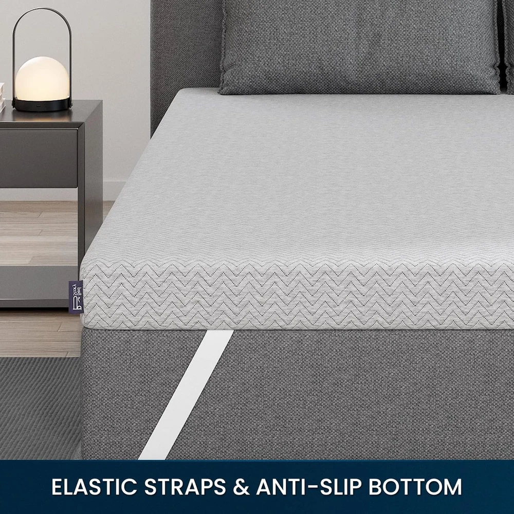 Firm Mattress Topper ERGONOMIC DESIGN & PAIN-PAIN RELIEF - This 2-layer pressure-relieving Visco fusion memory foam conforms to your curves, and distributes weight evenly to align the spine and alleviate pressure points. 2-LAYER DESIGN & OPTIONAL FIRMNESS - Featuring a double-layer foam design, the top side of the mattress topper is firm, and the bottom side is extra-firm, giving you the "just right" firmness. COOLING & VENTILATED FUNCTION - The mattress topper with gel-infused beads and an open-cell structure, can regulate temperature well, and distribute body heat evenly. It is perfect for hot sleepers. REMOVE MOISTURE & ALLEVIATE FATIGUE - Fusion foam containing gel/bamboo charcoal/copper/green tea extract, enhances the cooling function and can remove moisture and absorb sweat, promote human blood circulation and alleviate fatigue. 100 NIGHT NO RISK SLEEP TRIAL - As the brand owner and manufacturer, you can get the best price mattress topper. Each mattress topper we sell goes with a 100-night trial and lifetime service. If you have any problem with the gel mattress topper, please contact us, we are 24/7 for you.