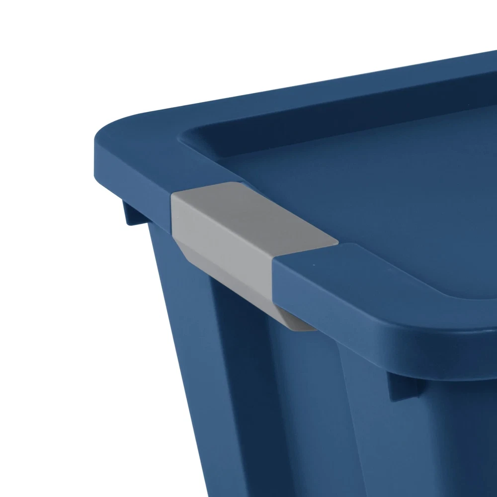 Step up to Sterilite's versatile 34 Gallon Storage Bin with latching lid, ideal for a variety of household storage challenges! The deep recessed lid surface allows totes to stack securely to efficiently use vertical storage space. Large latches keep the lid attached to the base, so contents stay safely stored inside, and provide a comfort grip when carrying. The sturdy design makes it a great option for garages, basements and attics, where you might need a bit more durability. This large size plastic storage container is perfect for storing and concealing blankets, sleeping bags, seasonal clothing, sporting gear, and more! Sterilite 34 Gallon Latch Tote, Stackable Plastic Storage Bin with Lid, Blue Outside Dimensions: 31 5/8" x 20" x 17 1/4" Interior Dimensions at bottom: 26" x 16 1/2" x 16 1/8" Large latches secure lid to base, keeping contents safely stored inside Deep recessed lid allows for secure stacking, maximizing vertical storage space Comfortable integrated handles for easier lifting and transporting Use good judgment when stacking items, keep heaviest bin at the bottom BPA-free and phthalate-free