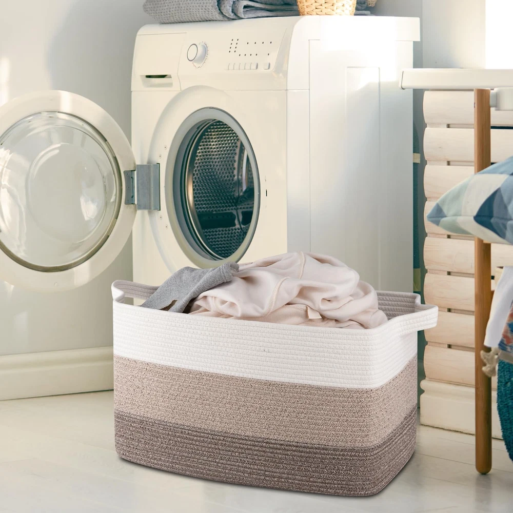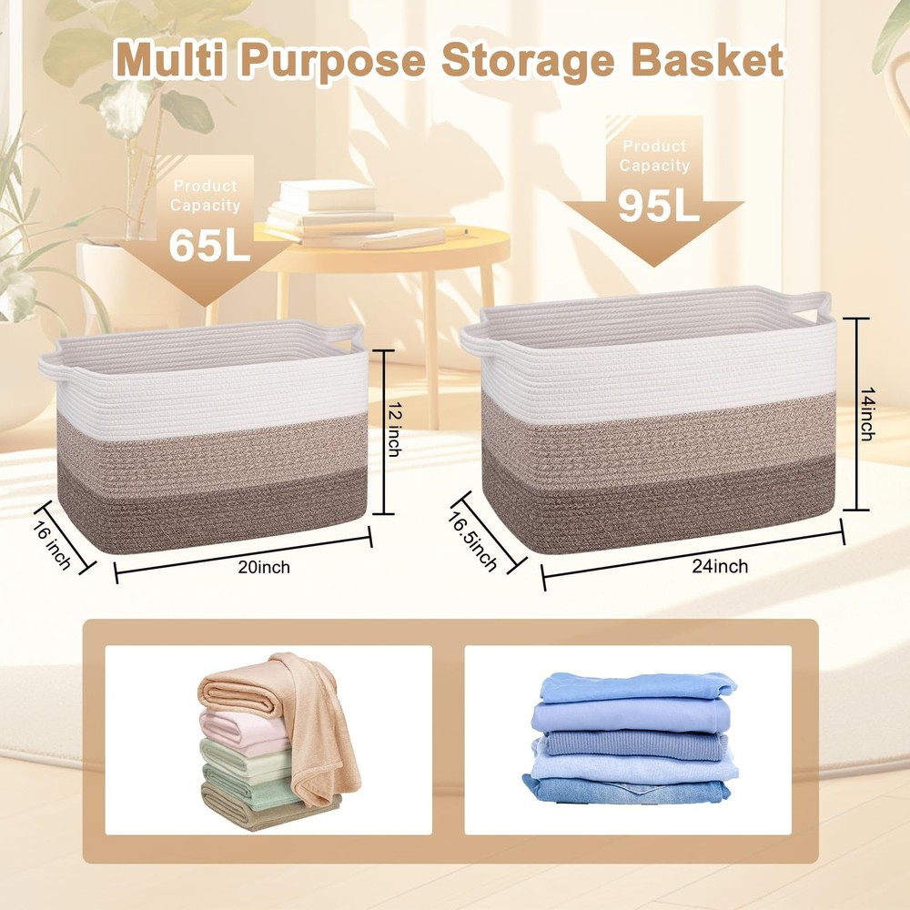 Blanket Basket for Living Room: This decorative laundry basket is more stable and easier to restore its shape after you receive the package. The size of the large storage basket is 24’’ x 17’’ x 14’’, it can be used to store blankets, clothes, toys, etc Cotton Rope Storage Basket:woven toy basket are made of 100% natural cotton, soft and odor free, there are no sharp or hard edges to scratch floors, and safe for kids and pets. Also it is more firm than plastic basket Large Basket With Handles: This rope basket is equipped with sturdy handles, which is sewn with double reinforced threads. It can support heavy objects, or it can be dragged. It is convenient for you to take it from upstairs to the rooms Foldable Laundry Baskets for Storage: toy storage bin are soft and sturdy enough, it can be folded to save space when not in use. The basket is widely used in bedrooms, living rooms, nurseries, laundries and bathrooms Washable Laundry Basket: This storage basket can be washed by hand or machine. NOTE: These baskets are folded when shipping, but it will turn back to its elegant shape quickly if you fill it with some clothing, and iron is great idea to remove the creases