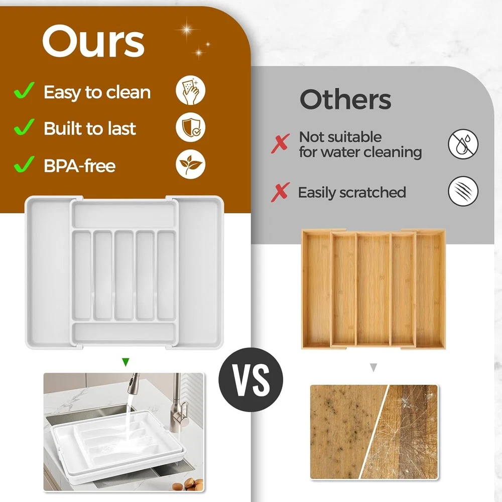 Keep Your Kitchen Organized π΄ β The Ukeetap Silverware Organizer features 7-9 compartments with 2 expandable panels , maximizing drawer space and keeping everything within reach. Adjustable Size βοΈ β Expands from 12.4" to 21" , fitting most standard drawers. Measure your drawer for the perfect fit. Premium & Safe Material β β Made of BPA-free plastic , waterproof and food-safe , perfect for storing cutlery, utensils, and more. Easy to Use π οΈ β No assembly required. Simply unfold and start organizing! Unique buckle design allows smooth sliding and convenient adjustments. Multi-Purpose π β Ideal for kitchen utensils, cosmetics, jewelry, stationery, and more. A practical & stylish gift for housewarmings or new home moves. White Color