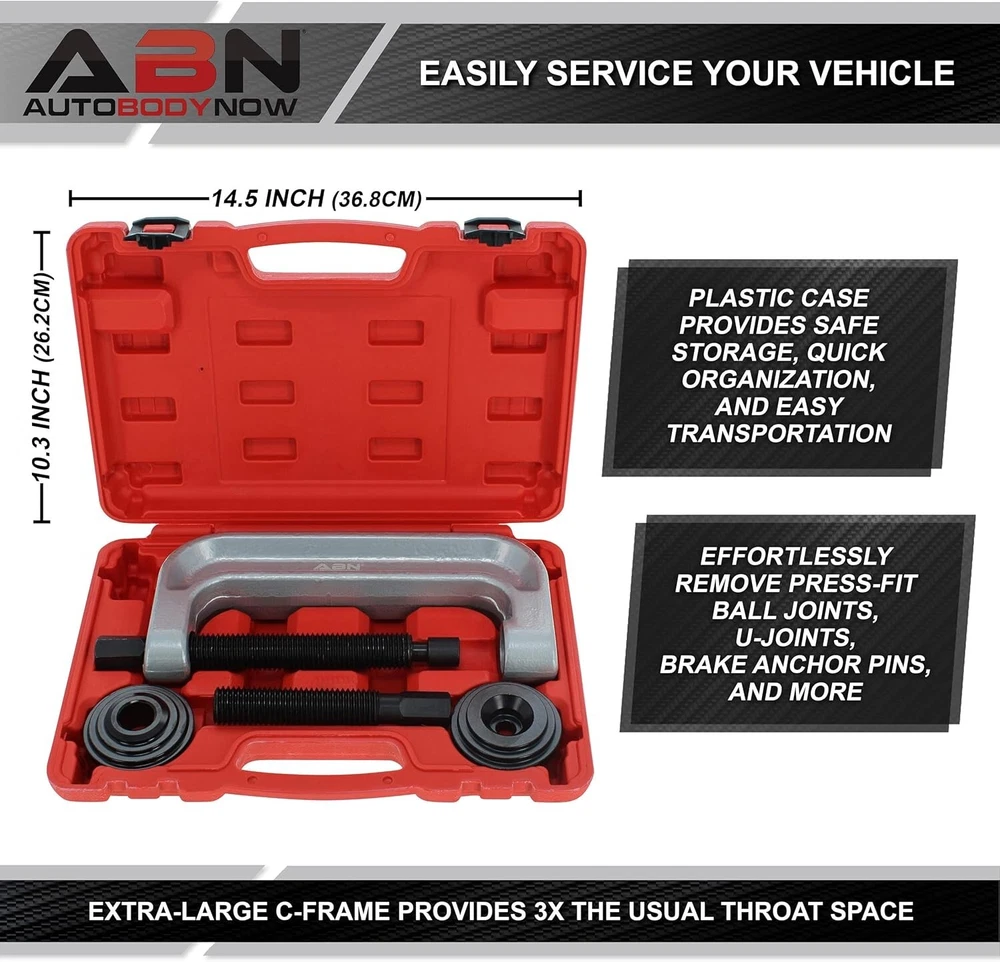Extra Large Ball Joint Press Tool with 3 Adapters for Domestic & Imported Cars ‹ › ‹ › ‹ › ‹ › ‹ › ‹ › ‹ › ‹ › ‹ › Extra Large Ball Joint Press Tool with 3 Adapters Specifically designed to make your vehicle servicing efficient and effective, this versatile tool is essential for any automotive enthusiast. Features: Service your vehicle's suspension system effortlessly by replacing worn or rusted ball joints. Multi-functional use as a ball joint puller kit, control arm bushing tool, U joint press kit, or tie rod and track pin press set. Heavy-duty design fits most 2 and 4 wheel-drive domestic and imported cars, pickup trucks, SUVs, and even tractors. Constructed from professional-grade forged steel, offering maximum strength and durability. Features a black oxide finish to resist elemental damage and wear, ensuring longevity. Specifications: Dimensions: 11.5 inches (29.2cm) tall with a robust C-frame. Includes 2 interchangeable pressure screws and a 3.5-inch (8.9cm) pressure screw head adapter. Two 3-inch (7.6cm) wide stepped automotive press adapters fit 10 and 6.5-inch (25.4 and 16.5cm) pressure screws. Convenient Storage: Comes with a 14.5 by 10.3-inch (36.8 x 26.2cm) plastic blow-molded carrying case for safe storage. Quick organization with a compartment for each ball press kit piece. Easy to transport for on-the-go servicing. Why Choose Our Extra Large Ball Joint Press Tool? Empower yourself with this essential tool that combines quality, durability, and convenience for all your automotive needs. Replace ball joints with ease and confidence while ensuring your vehicle’s suspension system operates smoothly. Whether you're a professional mechanic or a DIY enthusiast, this heavy-duty kit is tailored to meet your expectations. Upgrade your workshop with our Extra Large Ball Joint Press Tool today and experience the effortless service of your vehicle! Shipping Free & Fast Shipping - We offer free shipping to most of the USA with a normal delivery time of 3-7 days. However, due to the current situation, additional delivery time (up to 3 weeks) may be required for some items. Alternative Carriers - We may use alternative carriers (e.g. USPS, FedEx, UPS, etc.) to ensure your package arrives safely and on time. Due to the use of multiple carriers, we are unable to provide a tracking number automatically. Handling Time - Orders are processed and shipped within 1-2 business days of receiving cleared payment. Shipping Restrictions - Shipping to Alaska, Hawaii, Puerto Rico, Guam, and other US territories may incur shipping charges or delivery restrictions. Please contact us before ordering, or your order can be refunded/cancelled. State Restrictions - There may be restrictions based on your state of purchase. For example, certain items may not be shipped to California due to state regulations. Contact for Tracking Updates - If you require tracking updates or have any concerns about the delivery of your order, please feel free to contact us, and we will be happy to assist you. Return Please see our eBay Return Policy. Thank you. Payment We accept all major credit cards, PayPal, and Apple Pay for your convenience. Your payment information is secure and encrypted to ensure a safe and seamless transaction. Please complete your payment within 3 days of purchase to avoid any delays in shipping. Feedback Your feedback is extremely important to us. We strive to provide the best products and customer service possible. If you are satisfied with your purchase, please take a moment to leave us a positive review. If you have any concerns or issues with your order, please contact us before leaving negative feedback. We are committed to resolving any problems and ensuring your satisfaction. Contact Us If you have any questions or concerns, please feel free to reach out to our customer support team. You can contact us through the eBay messaging system. We are available Monday to Friday, 9:00 am to 5:00 pm EST, and we will do our best to respond to your inquiry within 24 hours. Thank you for supporting our small family business! Manufacturer Part Number: Ball Joint Press Kit UPC: Not Set Unit Quantity: 18.94 Type: Ball Joint Splitter,Ball Joint Press Kit,Wheel Bearing Press Kit,Ball Joint Separator,Ball Joint Removal Tool Set,Ball Joint Puller Kit,Control Arm Bushing Tool,U Joint Press Kit,Tie Rod Press Set,Track Pin Press Set Brand: Unbranded Warranty: 1 Year Country/Region of Manufacture: Not Set Unit Type: lb