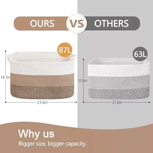 Material Cotton Color 3-toned Brown Brand MEGASKET Shape Rectangular Product Dimensions 15.7"D x 23.6"W x 14.1"H About this item LARGE BASKET FOR BLANKETS: 23.6"L x 15.7"W x 14.1"H, Giant rectangular floor basket offer accessible blanket storage for living room and bedroom. This huge space-saving blanket holder has an 87 liters capacity and can hold tons of blankets and other bedding. Minimum of 5-6 throw blankets or 3 throw sized quilts at once. UNIQUE RECTANGLE DESIGN: Unlike the round basket, this is a rectangular shape woven baskets for storage. Its unique design allows this storage organizer to be placed not only on the floor but also to fit perfectly on a shelf for shoes or inside a closet for laundry. Decorative basket in neutral tones is perfect for modern, rustic, bohemian, farmhouse, vintage or marine room decor. A sweet baby gift for a family. PREMIUM NATURAL COTTON ROPE: The large wicker storage basket is braided from organic natural cotton rope, making it a soft, textured storage bin that'll look great in living room, bedroom, kids room, laundry room and nursery. The rope basket is safe to baby for no unpleasant chemical smells. No hard edges will keep your floors and walls free of scratches. VERSATILE USE ROPE BASKETS FOR ORGANIZING: The wide open designed wicker baskets is exceptionally big, making it perfect for storing various items. Not only is it a choice for keeping throws and blankets, but its versatility also allows you to use it for storing baby clothes, baby diaper, decorative pillows, extra towels, kids toys, and even as a laundry basket in a guest room. WOVEN BASKET WITH STURDY HANDLES: The woven storage container features two sturdy but soft carrying handles. You easily move the woven storage basket from one place to another, allowing you to move items conveniently even when full of blankets and toys. The basket is washable. It comes in folded, you can iron the basket to remove the creases.