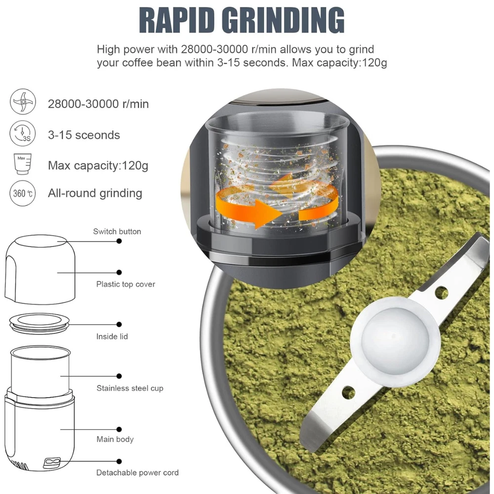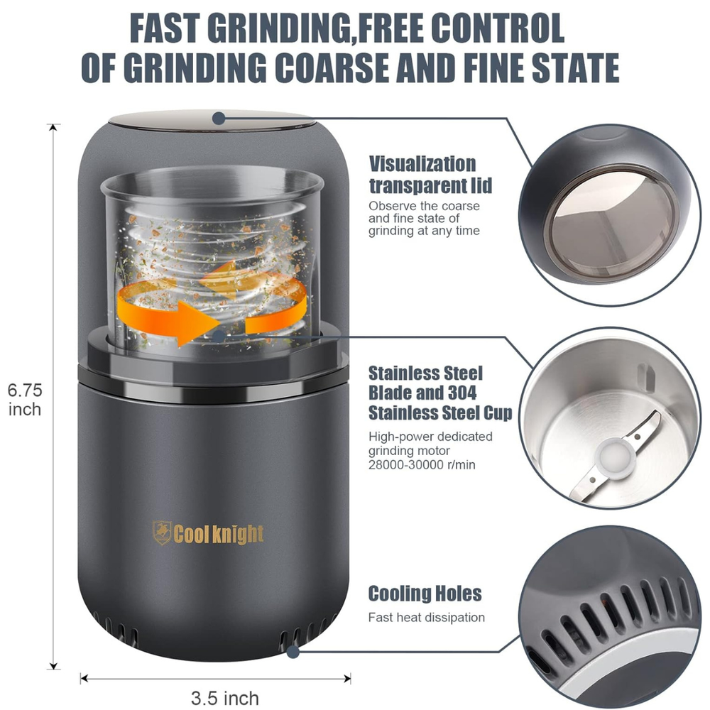 Electric Herb Grinder – Large Capacity Fast Stainless Steel Grinder for Herbs, Spices, Coffee & Pollen | 7.5" (Grey) | California eShop Experience effortless grinding with the Electric Herb Grinder , a powerful and efficient solution for herbs, spices, and coffee. Designed with a large capacity, durable stainless steel interior, and a one-touch safety operation, this grinder offers precision, speed, and convenience all in one. Ideal for kitchens, home bars, and herbal preparation. About This Item Large Capacity & Fast Grinding: Quickly grinds up to 120g of herbs or spices within 5–10 seconds. Visual lid lets you control coarseness easily. Multi-Function Grinder: Perfect for herbs, spices, pollen, and coffee beans — saving time and ensuring uniform results. One-Button Operation: Simple press-to-start design; grinding automatically stops when you lift your hand from the lid. Premium Materials: Features a 304 stainless steel inner tank and high-quality steel blade for long-lasting durability. High-Speed Performance: Operates at 30,000 RPM for quick, consistent results every time. Easy to Clean: Comes with a complimentary cleaning brush and detachable power cord for convenient storage. Product Description This Electric Herb and Spice Grinder combines modern technology with efficiency. Its large-capacity stainless steel chamber, transparent lid, and sharp rotating blades allow precise control over coarseness. Whether grinding herbs, coffee, or spices, this grinder performs with power and safety. The one-touch operation ensures ease of use, and the detachable cord allows easy cleaning and compact storage. Perfect for kitchens, coffee lovers, and herbal enthusiasts. Specifications Type: Electric Herb & Spice Grinder Capacity: 120g Speed: 30,000 RPM Operation: One-touch press-down power Material: 304 Stainless Steel + High-Quality Steel Blade Color: Grey Dimensions: 7.5 inches Power Cord: Detachable Package Contents - 1 × Electric Herb Grinder (7.5" Grey) - 1 × Cleaning Brush - 1 × Detachable Power Cord Important Information Do not exceed maximum fill capacity. Ensure lid is properly secured before operation. Avoid washing the motor base directly with water. Allow the grinder to cool between uses for best performance. Safety Information For household use only. Keep out of reach of children. Do not operate without lid. Avoid touching blades during cleaning. Disconnect power before cleaning or storage. Shipping Details Orders ship within 1–2 business days from our U.S. warehouse. Delivery typically arrives within 3–7 business days across the continental United States. All products are securely packaged for safe delivery. Customer Support For assistance, please contact California eShop through eBay messages. Our U.S.-based support team responds within 24 hours to help with orders, replacements, or product questions. About California eShop California eShop is a trusted U.S.-based online store specializing in premium home, kitchen, and lifestyle products. We focus on quality, fast shipping, and excellent customer service to ensure a reliable shopping experience every time. © California eShop — All Rights Reserved. Product specifications and packaging may vary slightly. Always follow product care and safety guidelines.