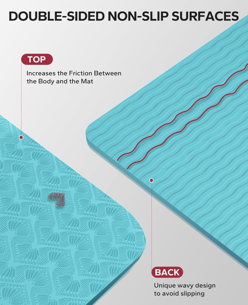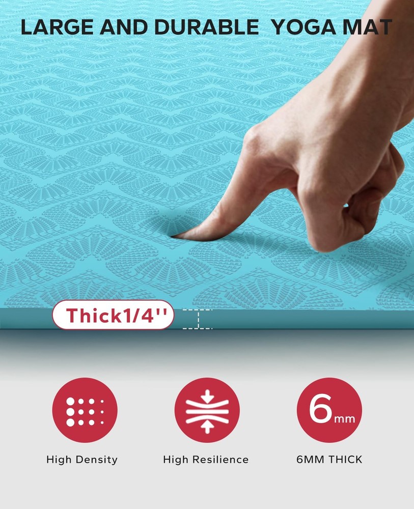 Introducing Our Premium TPE Yoga Mat: Elevate Your Practice to New HeightsOutstanding TPE Material: Eco-Friendly, Skin-Friendly and Lightweight.Our yoga mat is thoughtfully constructed from top-grade TPE (Thermoplastic Elastomer) material, making it an eco-conscious choice. It's free from harmful chemicals and fully recyclable, aligning with your values for a greener planet. The TPE's inherent softness ensures a gentle and skin-friendly touch. Plus, its lightweight design makes it effortless to transport to your favorite practice spot.Exceptional Cushioning and Rebound, 6mm Thickness:Experience yoga like never before with our luxurious 6mm-thick mat. It provides exceptional cushioning and rebound properties, ensuring your joints and muscles are well-supported throughout your practice. Double-Sided Non-Slip Design: Bid farewell to slipping and sliding during your practice. Our yoga mat boasts a double-sided non-slip surface, featuring a specially designed wave pattern on the bottom. This guarantees superior traction on various surfaces, even during the most challenging asanas. Your mat stays securely in place, allowing you to focus on the harmony of your practice.Spacious Yoga Mat Design๏ผWith dimensions measuring a generous 72"x48", our mat offers twice the space of standard mats. This ample room allows you to fully explore your practice, stretch your limits, and flow with grace. No more constraintsโunlock your true potential with our spacious mat.Convenient Accessories Included: 1 x Storage Bag๏ผ2 x Velcro Straps.We believe in going the extra mile to enhance your experience. With every yoga mat purchase, you receive a practical storage bag and two hook-and-loop straps. These accessories simplify transportation and storage, whether you're off to the studio or indulging in outdoor sessions.Exceptional After-Sales Service: Your Satisfaction, Our Priority.Your satisfaction is at the heart of our mission. We are committed to providing exceptional after-sales service to ensure your experience with our yoga mat is seamless. If you have any questions or concerns, our dedicated support team is just a message away, ready to assist you promptly.Elevate your yoga journey to a realm of unparalleled comfort, performance, and eco-consciousness with our Premium TPE Yoga Mat. It's more than a mat; it's your companion on the path to holistic well-being. Upgrade your practice today and discover the perfect fusion of cushioning, stability, and style. Your practice deserves nothing less. ๐๐ฑ๐ญ๐ซ๐-๐๐๐ซ๐ ๐ ๐๐ข๐ฆ๐๐ง๐ฌ๐ข๐จ๐ง๐ฌ: Large workout mat offers an expansive 48x72 inches of space, which is twice the size of standard yoga mats. This generous space allows you to stretch out comfortably, ensuring maximum freedom of movement during your yoga practice. Suitable for various barefoot exercises such as yoga, Pilates, stretching, meditation, planks, push-ups, squats, and cardio workouts ๐๐จ๐ฎ๐๐ฅ๐-๐๐ข๐๐๐ ๐๐จ๐ง-๐๐ฅ๐ข๐ฉ ๐๐๐ฌ๐ข๐ ๐ง: Our extra wide yoga mat features a double-sided non-slip surface to keep you stable and secure during your practice without worrying about slipping or sliding. The unique wave pattern on the bottom enhances grip on a variety of surfaces, ensuring your mat stays securely in place even during the most challenging yoga poses. Note๏ผNot for use on carpet ๐๐ฑ๐๐๐ฅ๐ฅ๐๐ง๐ญ ๐๐ฎ๐ฌ๐ก๐ข๐จ๐ง๐ข๐ง๐ &๐๐๐ฌ๐ข๐ฅ๐ข๐๐ง๐๐: The exercise mat is 6mm thick, providing excellent comfort and support in various yoga poses. Whether you're a beginner or an experienced yoga enthusiast, this yoga mat can meet your needs. Its outstanding cushioning and resilience will help protect your joints and reduce the stress on your body. We believe this yoga mat will be the perfect companion for your practice ๐๐ข๐ ๐ก-๐ช๐ฎ๐๐ฅ๐ข๐ญ๐ฒ&๐๐๐จ-๐๐ซ๐ข๐๐ง๐๐ฅ๐ฒ ๐๐๐ ๐๐๐ญ๐๐ซ๐ข๐๐ฅ: Our yoga mats for home workout is made of high-quality TPE material, which is very soft and skin-friendly and has no unpleasant smell.TPE is also eco-friendly, containing no harmful chemicals, and fully recyclable. Note๏ผThere will be a slight smell after receipt, and it can be placed in a ventilated place for 1-2 days ๐๐๐ฌ๐ฒ ๐๐จ ๐๐๐ซ๐ซ๐ฒ&๐๐ฑ๐๐ซ๐๐ข๐ฌ๐ ๐๐ง๐ฒ๐ฐ๐ก๐๐ซ๐: To make your yoga journey even more convenient, our fitness mat comes with a storage bag and two Velcro straps. The lightweight and portable design allows you to easily take your exercise mat to yoga classes, the gym, outdoors, or any fitness venue