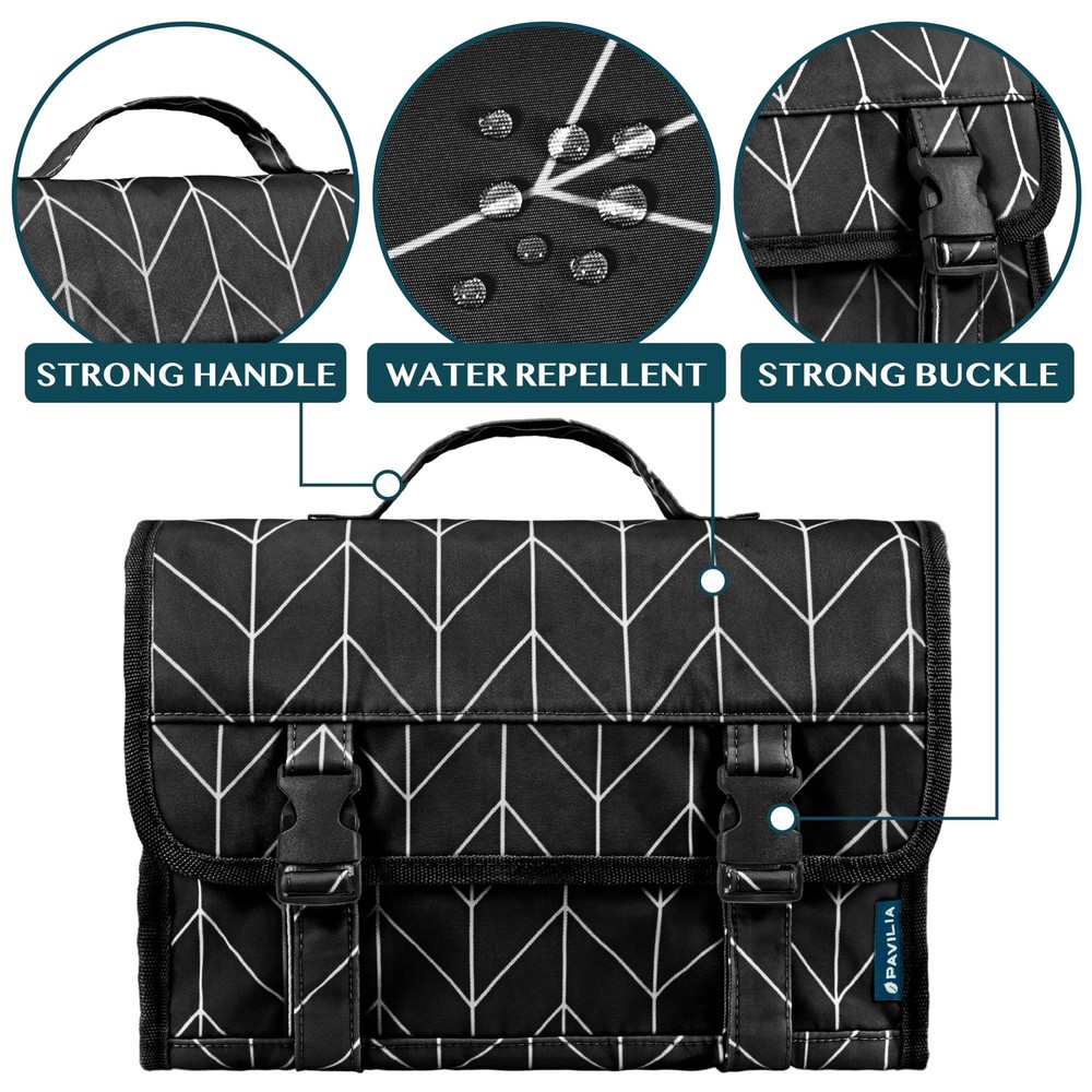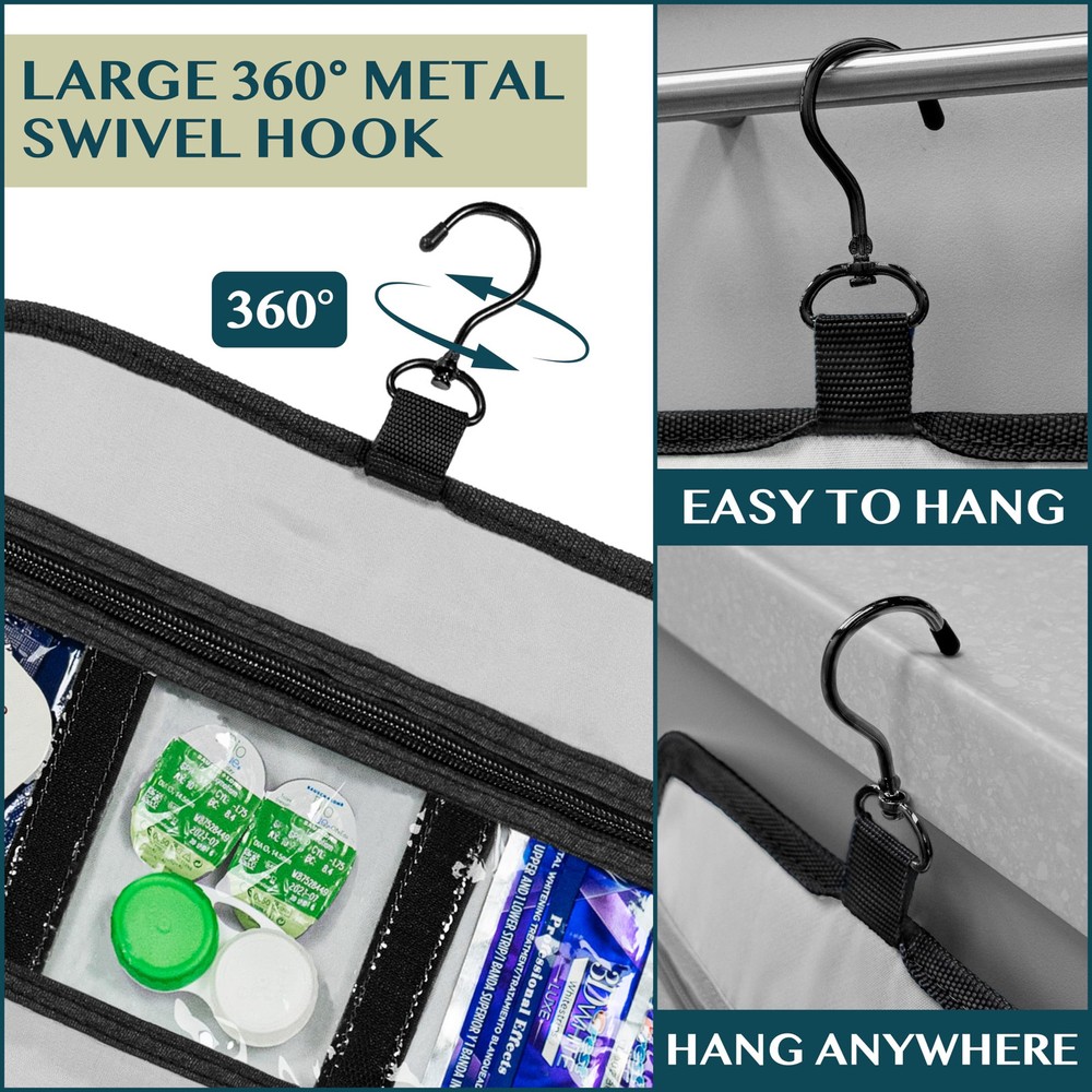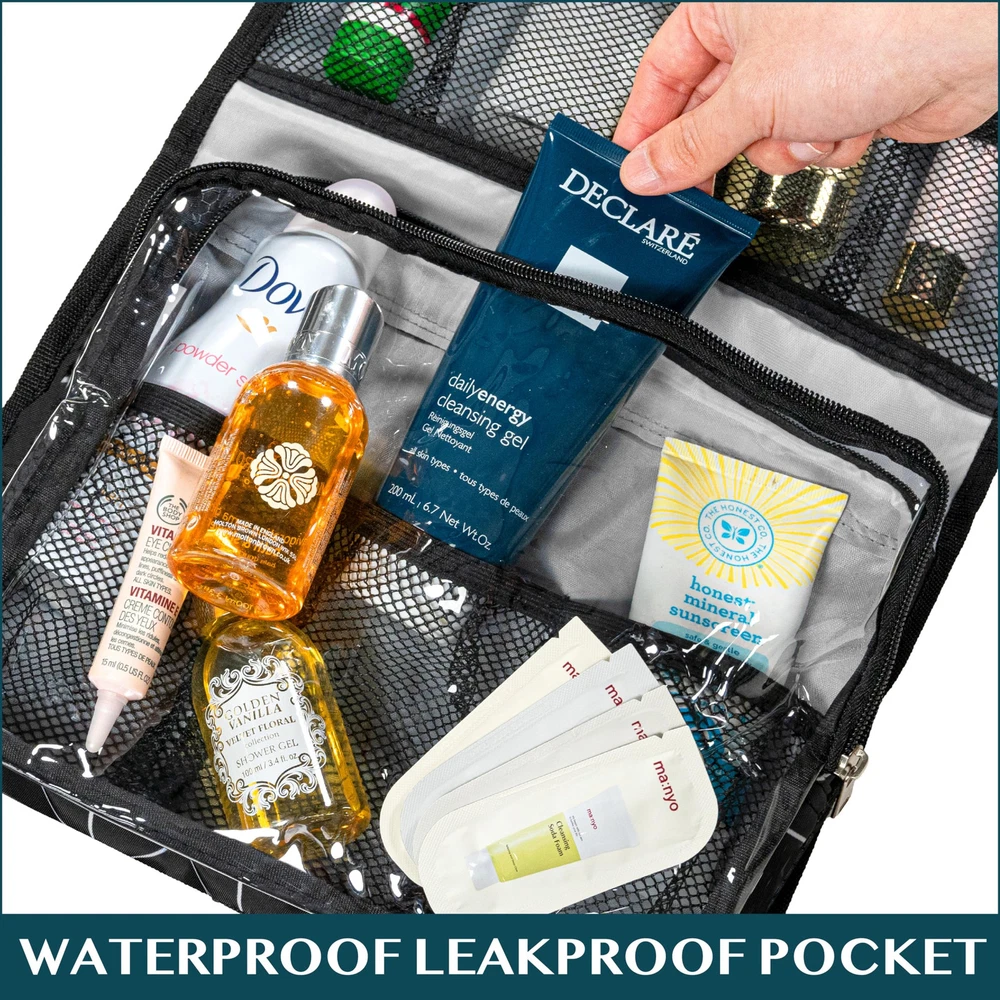 FOLDABLE TRAVEL TOILETRY BAG: large travel bag toiletry organizer case has a 4 main compartments to fit all your travel toiletries containers, makeup, and cosmetic bottles. Zipper pocket in front holds essentials when the toiletry bag is folded. Roll up waterproof pockets can fit skincare cream, shampoo, make up brush, toothbrush and wet items. This is a travel must have for vacation, flying, gym, cruise, and home. Large size at 14x9x2 inches (LxWxH), Size Unfolded 14x26x1 HANGING COSMETICS TRAVEL BAG ORGANIZER: This toiletry bag for women has a hanging hook and multiple pockets that help you stay organizer during business trip, vacation travel. The hanging hook makes it easy to hang the toiletry bag to bars in the hotel shower bathroom. Unzip your toiletry bag to reveal compartments to organize your shampoo, skincare face hygiene products. This toiletry travel bag is an essential accessory for cruise in Europe, plane, Hawaii Trip, and honeymoon. PADDED MAKE UP BAG KIT: The toiletry case bag for men has foam padding that protects toiletries container, shampoo bottle during flying, roadtrip, and plane. The toiletry bag kit also has elastic bands that secure makeup brush, face spray, lipstick, shaving razors. One waterproof compartment for wet toiletries. Clear pockets let you see all essentials clearly and is tsa approved. This large hanging toiletry bag holder for women will protect all gear, cosmetics, and travel gadgets. PACKABLE TOILETRY BAG GIFT: Large and portable, this compact hanging toiletry bag is perfect for business trips, traveling, gym shower, camping, dorm, home use. Easily fit this in any luggage and suitcase. This is a great travel toiletry gift set for travelers, women, men, flight attendants during Birthday, Christmas, holidays, and vacation. Also makes a great gift for mother, father, friend,wife and husband gift during Valentine Day. EASY TO CLEAN: Simply wipe clean with damp cloth to maintain the toiletry bag travel bag. With its water resistant polyester fabric and waterproof compartment, this travel kit for women keeps your travel-size item, shampoo, conditioner, lotion, face wash, medicine, toothpaste, toothbrushes, hair brush and daily makeups protected and organized for every trip, cruise, flight! A must have for every travel packing list!