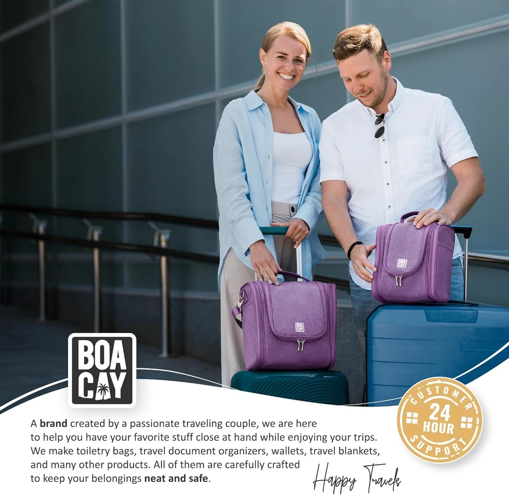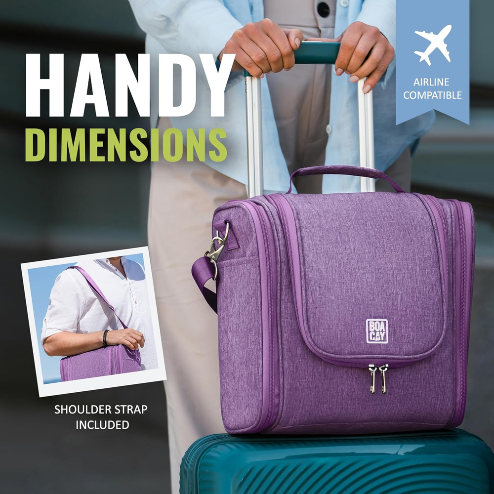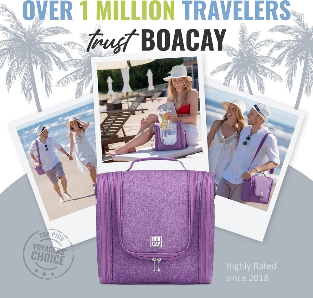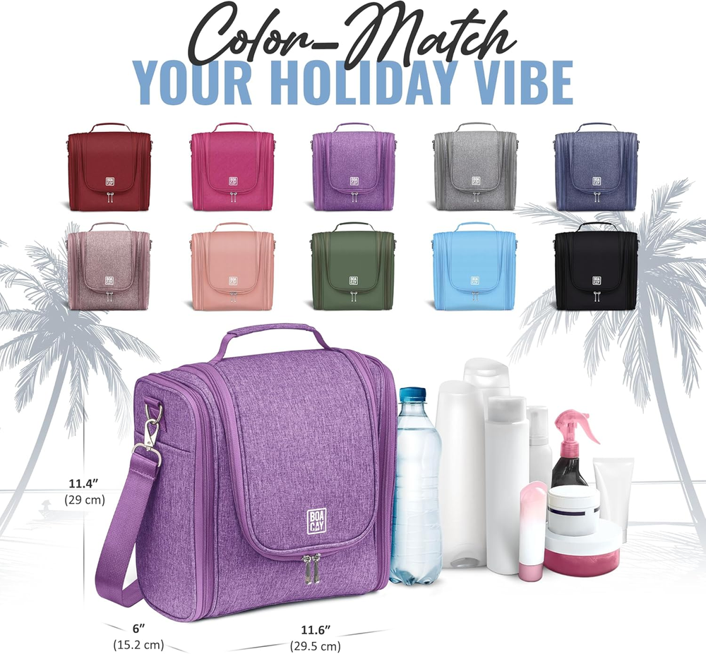 This large travel toiletry bag has a unique design with 21 storage spaces. Its size of 11.6x6x11.4″ allows you to fit in all your items, while the metal hook makes it easy to hang anywhere. If you want a large makeup bag, a cosmetic, or an accessories organizer, Boacay toiletry bag is for you. It is multifunctional, has metal zipper pulls, and it’s made of only high-quality materials. Keep your travel essentials organized and safe with our sturdy extra-large hanging toiletry bag. It is waterproof, washing resistant, and features a foam layer for additional bottle protection. If you need a gift idea, you will love this cosmetic travel bag. Boacay shower bag makes the perfect present for women, men, and even kids, and there are plenty of colors to choose from. Boacay portable travel organizer can also be used as a hygiene & dopp kit, or bathroom bag. It is suitable for home, cruise, gym, camping, or travel use, and it will take away all your worries. Product Description The video showcases the product in use. The video guides you through product setup. The video compares multiple products. The video shows the product being unpacked. PRODUCT COMPARISON Add to Cart Add to Cart Add to Cart Add to Cart Customer Reviews 4.7 out of 5 stars 6,348 4.6 out of 5 stars 15,848 4.6 out of 5 stars 2,142 4.6 out of 5 stars 2,366 Price $19.99 $ 19 . 99 $15.99 $ 15 . 99 $19.99 $ 19 . 99 $9.99 $ 9 . 99 Dimensions 11.61 x 11.42 x 5.98 inches 8.5 x 4.7 x 10.2 inches 11.42 x 3.78 x 7.48 inches 8.8 x 4.3 x 6.9 inches Weight 15 ounces 11 ounces 12.3 ounces 3.21 ounces Water Resistance Waterproof Waterproof Waterproof Waterproof Hanging Bag ✔ ✔ ✔ ✘ Metal Zippers Pulls ✔ ✔ ✔ ✔