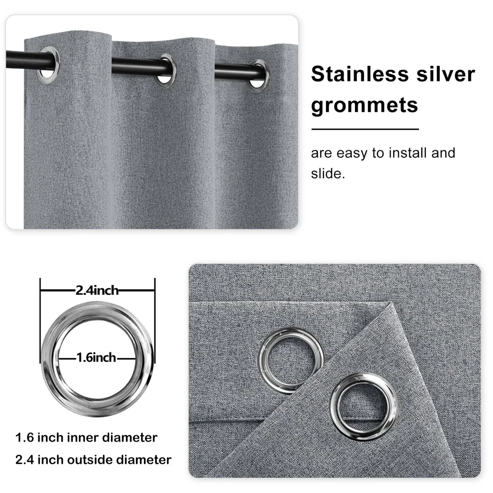 100% blackout curtains designed with 2 linen fabrics outside, between which is blackout lining, so the back side and front side are same. The textured faux linen curtains convey an image of nature and tranquility. The curtains are soft and thick which can create a luxury atmosphere for your home decor, especially for farmhouse decor. Silky touch considerately upgrades your purchasing experience and sets the mood for the rest of the day. PACKAGE INFO: For each packing, there will be 2 panels inside. Each contains 2 faux linen curtains in size 52W x 120L, equipped with 8 standard silver grommets with 1.6-inch inner diameter. BETTER SLEEPING EXPERIENCE: total blackout curtains adapts 3-layer combined fabric, 2 outside layers are linen look and the middle layer is 100% blackout fabric. For doing so, it can block UV ray, creating a great environment for lighter sleepers/ night workers/ babies, which enable them to sleep through the night. UPGRADED COMFORT: tieable curtains are various in sizes and in colors. Both sides of curtains look same. Those linen blackout curtains are good at thermal insulation, keeping your room warm in winter while cool in summer. Our curtains are suitable for bedroom, living room, office, kitchen, baby room, study room and so on, especially for farmhouse style. TIEBACK DESIGN: Both 2 panels are separately sewn with a tieback, so that you can tie them up without purchasing any other ropes and let sunlight in whenever you want to. They are fixed in curtains, and uneasy to loose. MACHINE WASHABLE:For a better purchasing experience, please wash in cold water, tumble dry on low and ironing at low temperature (if needed). Don’t bleach. Any other questions, do not hesitate to contact us.