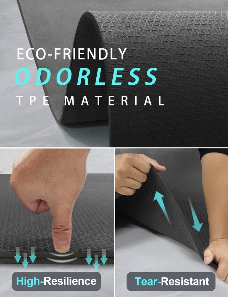 COMFY · HIGHLY ELASTIC TPE MATERIAL -- More expensive but worth it. TPE is the latest technological improvement to the traditional yoga mats. No latex, no PVC, or any heavy metal DOUBLE-SIDED NON-SLIP -- This workout mat has double-sided non-slip surfaces. Wavy undersides make excellent traction on the floor. It unrolls pretty flat and stays put. Special textured surface prevents your hands and feet from sliding when you sweat on it THICKENED TO 7MM FOR ADDED CUSHIONING -- The bumpy non-slip texture on the surface and bottom of the yoga mat thick increases traction for stronger, giving you a firm connection to the floor, keep you from slipping around. You can safely do any poses on the non slip yoga mat without worrying about injury WIDER AND LONGER FOR MORE SPACE -- Longer and wider than regular yoga mats, ideal almost for everyone. Comes with a dual-use strap, which can use as a yoga mat carry strap, or as a yoga stretching strap IDEAL FOR ALL LEVELS YOGA ENTHUSIAST -- A unisex fitness mat built for yoga, pilates and general ground exercise, ideal for both beginners & advanced yoga practitioners