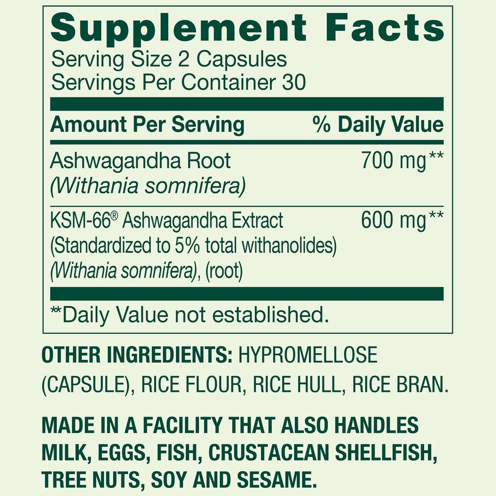 Nourish your body and manage stress with Spring Valley's High-Strength Ashwagandha capsules. Ashwagandha is an adaptogenic herb that helps maintain a healthy stress response, cognitive function, weight management, and thyroid function. * These vegetarian ashwagandha capsules are free of gluten, yeast, wheat, milk or milk derivatives, lactose, sugar, soy, artificial colors, and flavors, and contain less than 5 mg of sodium per serving. Adults should take two capsules daily, preferably with a meal. You can trust Spring Valley's High-Strength Ashwagandha capsules to lead a healthier life. At Spring Valley, we understand that a healthy, balanced lifestyle is key to achieving your best self. We offer a wide range of affordable, naturally inspired products dedicated to supporting the health and overall well-being of you and your family. Spring Valley High Potency Ashwagandha Dietary Supplement, 1300 mg, 60 Vegetarian Capsules High Potency Ashwagandha Dietary Supplement Supports healthy stress response, cognitive function, weight management, and thyroid function* 60 Vegetarian Capsules Contains no gluten, yeast, wheat, milk or milk derivatives, lactose, sugar, soy, artificial colors, or flavors Contains less than 5 mg of sodium per serving