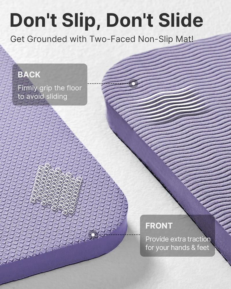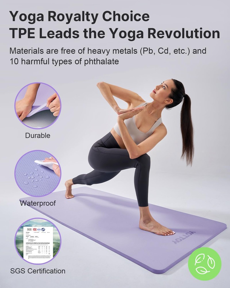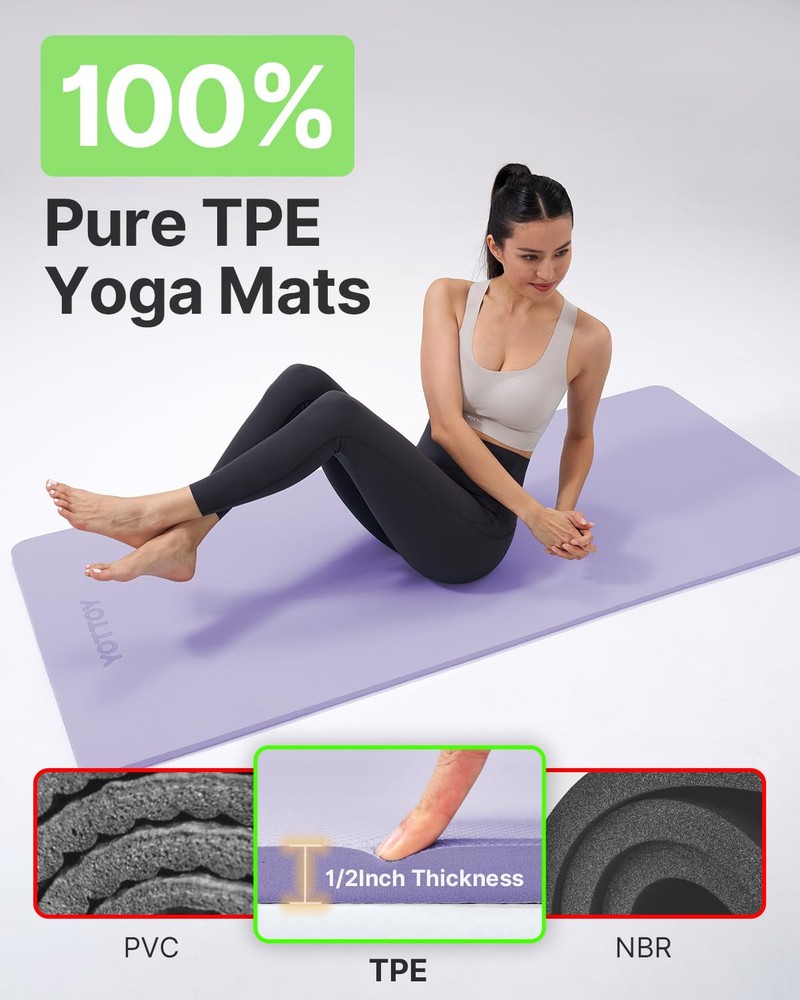 Yoga Mat Thick: At 72" L x 24" W (or 32" W for the extra-wide version), providing ample space for all your Yoga, Pilates, and floor exercise needs. Exercise mat 1/2 inch (12mm) thickness offers superior cushioning for a comfortable workout experience. Now you can stretch out without feeling cramped! Anti-slip Yoga Mat: Say goodbye to slipping and sliding with our anti-slip surface! The granular protrusions increase friction and absorb sweat, ensuring you stay firmly in place during your practice. The water ripple texture on the reverse side grips various surfaces, making it perfect for any workout environment. Friendly Exercise Mats: Crafted from strictly selected TPE materials, yoga mats for home workout are SGS & TUV certified for environmental safety which means the materials are free of heavy metals (Pb, Cd, etc.) and 10 harmful types of phthalate, both of which have long-term adverse effects our overall health.The one-piece foam process results in a non-toxic, odorless mat that’s also waterproof and sweat-proof. Pilates mat’s easy to clean and keeps you secure with every pose. 12mm Extra Thick Yoga Mat: Enjoy the perfect balance of cushioning and stability with our 12mm thick mat. It provides exceptional support for your joints, making it ideal for kneeling and sitting postures. You’ll love the extra comfort it brings to your yoga practice. Easy to Store and Clean: Each Yoga Mat comes with convenient straps, making it easy to carry to the gym, office, or even camping trips. Cleaning is a breeze – simply wipe with a damp cloth, cold water, and mild detergent, then lay flat to dry. Just remember to keep it out of direct sunlight.