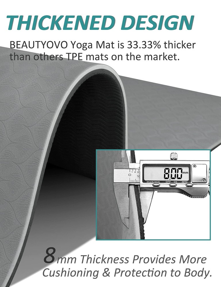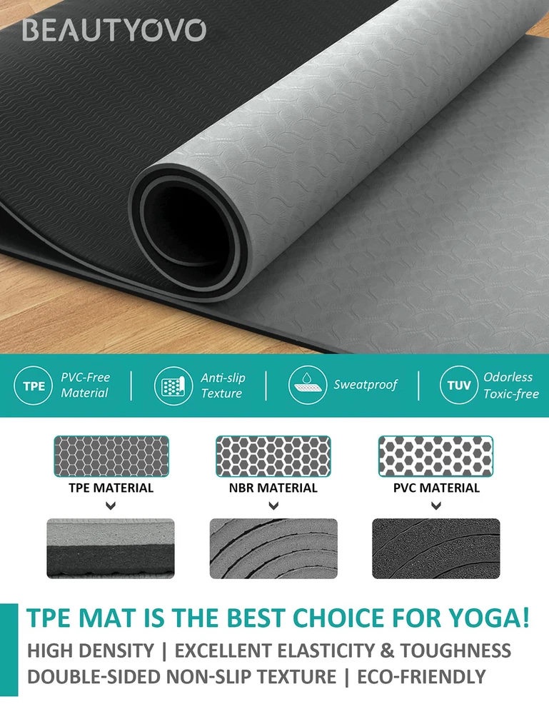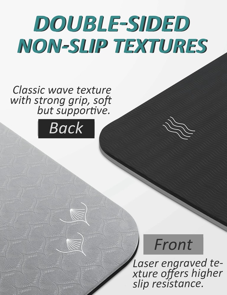▨ PREMIUM ECO FRIENDLY TPE MATERIAL - The material of a mat will determine the texture, stickiness, sponginess, and eco-friendliness. Most yoga mats are made of either plastic or rubber. eco friendly TPE yoga mat moisturizes the advantages of plastic and rubber in one, which features higher elasticity, better abrasion & tear resistance, and more eco-friendly than traditional PVC, NBR materials. It last a long time and can endure many yoga practice. ▨ AMPLE CUSHIONING & SPACE -- 1/3-Inch thick yoga mat provides more cushioning and stability for your body than a thin yoga matt and is safer and more comfortable. It is perfect for practicing balance postures, back support during inversions, and other yoga postures! The size of 72''x24''x1/3" large yoga mat can satisfy all yoga, pilates, and general floor exercise needs for women and men! ▨ GRIPPE NON-SLIP TEXTURE FOR ADDED STABILITY -- The bumpy non-slip texture on the surface and bottom of the yoga mat thick increases traction for stronger, giving you a firm connection to the floor, keep you from slipping around. You can safely do any poses on the non slip yoga mat without worrying about injury! ▨ YOGA MAT WITH STRAP -- Comes with a dual-use yoga mat strap, which is also a popular yoga accessory. It can be used as a portable YOGA MAT CARRIER STRAP or twice as a YOGA STRETCHING STRAP! pilates mat weighs only 2 pounds, you can take it to a yoga studio, gym, or anywhere without any burden, and you can truly realize - YOGA TO GO! ▨ IDEAL FOR ALL LEVELS YOGA ENTHUSIAST -- A unisex fitness mat built for yoga, pilates and general ground exercise, ideal for both beginners & advanced yoga practitioners. 100% customer satisfaction is our unconditional guarantee! If you are not 100% thrilled with your TPE Yoga Mat, we promise to offer you a prompt solution to let you 100% satisfied!