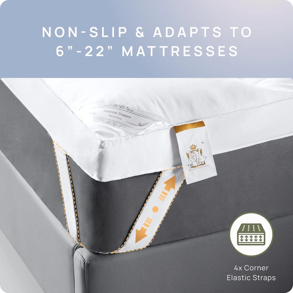 EXTRA THICK COMFORT: Experience cloud-like softness with this queen-size plush mattress topper, generously filled with down alternative gel-fiber, making it the perfect addition to a firm mattress for ultimate sleep comfort. COOLING & BREATHABLE: The soft brushed polyester fabric and breathable gel-fiber filling help regulate temperature, making it a great alternative to heat-retaining memory foam or feather-down toppers—no more sweaty nights! FULL BODY SUPPORT: Ideal for back, side, and stomach sleepers, this ultra-comfortable pillow top mattress topper provides extra cushion and relief for shoulders, back, and hips, helping to alleviate pain and improve sleep quality. SECURE FIT: Featuring 4 corner elastic straps and box quilting design, this topper adapts to mattresses from 6" to 22" deep, ensuring a secure fit and preventing the filling from shifting while you sleep. EASY CARE & MAINTENANCE: Machine washable and easy to maintain, simply tumble dry on low heat to fluff the topper on arrival. For extended durability, cover with a fitted sheet or mattress protector and wash bi-annually.
