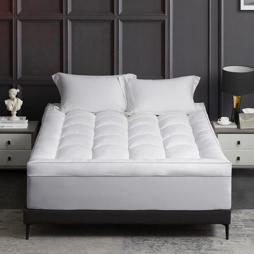 Extra Thick Mattress Topper - Our Mattress Topper is filled with 1300 GSM down alternative fiber, which is twice as much as many other mattress toppers on the market. With this extra filling. 100% Cotton Top & Premium Filling Fibre - The topper's shell is made of 100% cotton, providing a soft and durable surface that wicks away moisture for a comfortable night's sleep. Our cotton mattress topper boasts a premium filling fiber. Non-Slip and Deep Pocket - Our pillow top mattress topper comes with a non-slip, all-around stretchable elastic skirt that fits any mattress up to 24" deep. which ensures a snug fit and prevents the topper from popping off at the corners. Instantly Upgrade Your Old Mattress - Adding a fluffy mattress topper could be the easiest way to personalize your mattress and get the ultimate in luxury slumber. With our cloud-like plush down alternative mattress topper. Product Care - Delivered in a vacuum sealed package, the mattress topper may look thinner after opening. To fluff it up quickly, just shake it, and leave it for several hours.