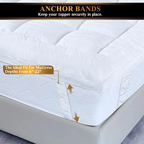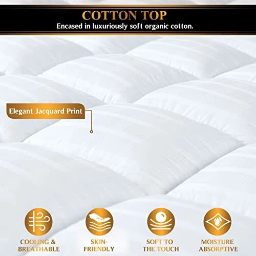 Return Policy Fast Delivery Trusted seller Extra Thick Pillow Top 3 Inch Mattress Topper Queen Size for Firm Mattress, Cooling Fluffy Cotton Hotel Mattress Bed Topper for Cloud Like Sleep & Back Pain, Plush Soft Pad, Fit to 6”-22” Mattress Product Description EXTRA THICK MATTRESS TOPPER WITH 3 INCH LOFTINESS. Our extra thick queen size mattress topper with its 3 inch gusset filled with 131oz soft & plush down alternative fiber adds an extra layer of softness to your firm mattress providing you the bouncy feel and cloud-like sleep comfort. PILLOW TOP MATTRESS TOPPER FOR BACK PAIN RELIEF. Filled with premium quality 3D & 6D plush microfiber, this generously filled mattress topper finds a good balance between softness and cushioning and offers optimized support for your hips, shoulders, back, and knees to avoid back ache and leaves you feeling well rested when morning comes. COOLING & BREATHABLE MATTRESS TOPPER. Encased in the softest, lightest and breathable 100% cotton fabric, our mattress topper retain less heat and maintains optimal temperature. No more sweaty nights caused by memory foam pads or traditional mattresses. It's great for Mother's Day gift. SECURE FIT & BOX QUILTING CONSTRUCTION. Our mattress topper with 4 corner elastic straps adapts to mattress depths from 6" to 22" and ensures a secure fit and allow you toss and turn freely. The box quilting construction prevents the evenly distributed fillings from shifting as you sleep to offer you the most consistent comfort. TIPS FOR USE. It is not necessary to wash your pillowtop before use as it is clean. For best results, tumble dry it on a low heat before use to fluff up the fibers. To extend your bed topper’s life and reduce the need to wash it, position a mattress protector/ fitted sheet over it. Wash bi-annually in a front loader machine on a cool wash. *Please do not use a top loader machine as the agitators destroy the fibers. Shipping Returns Payment Shipping Shipping is FREE to all addresses other than APO/PO boxes in the lower 48 states. All our stock ships from US-based warehouses. Shipped via USPS or UPS (depending on location and package weight) Unless stated otherwise, all orders will ship within 24-72 hours of your payment being processed. Check our feedback to see the great reviews of FAST shipping we offer. Returns Seller does not accept returns Payment We currently accept payment via eBay managed payments only. Once payment is cleared, we will dispatch your shipment within 1-3 business days. Please refer to the "Shipping" tab for more information regarding shipping speed to your destination.