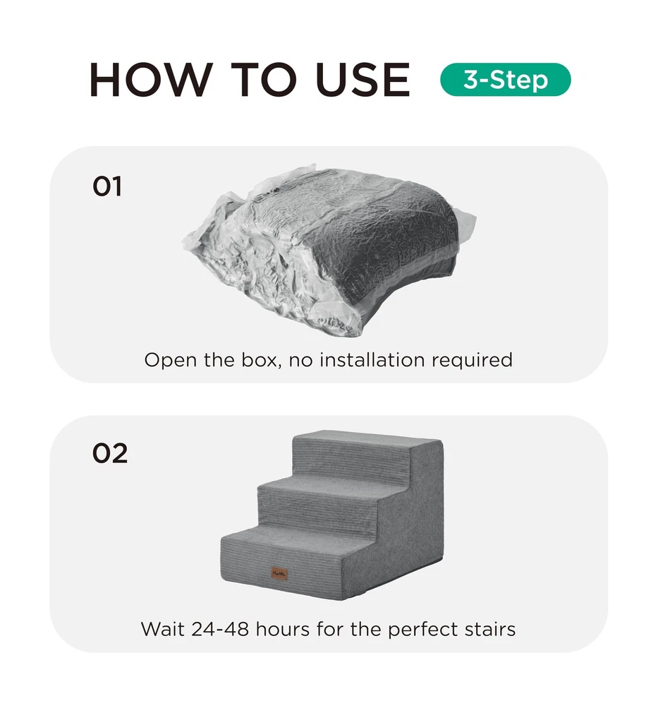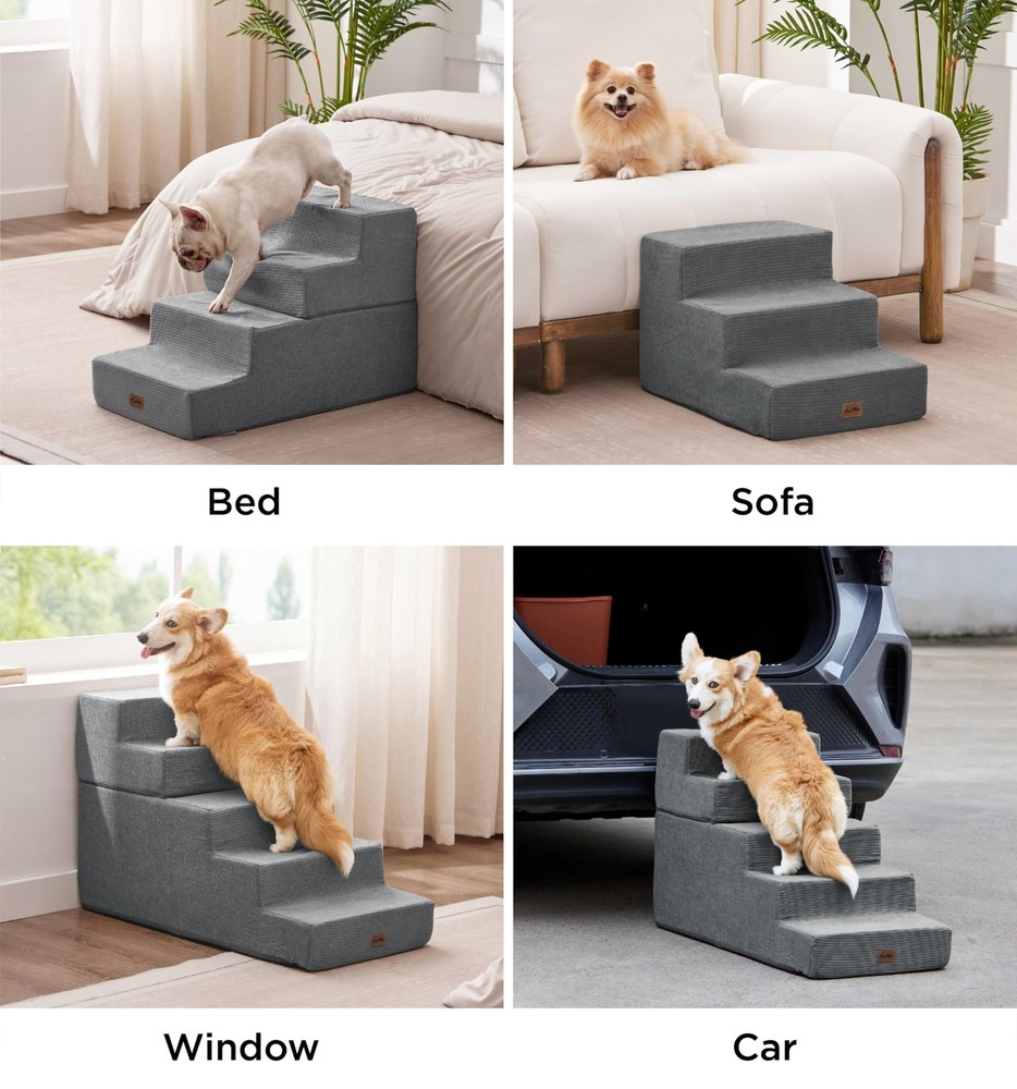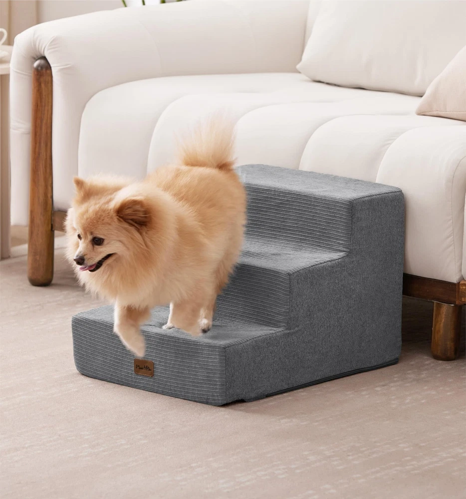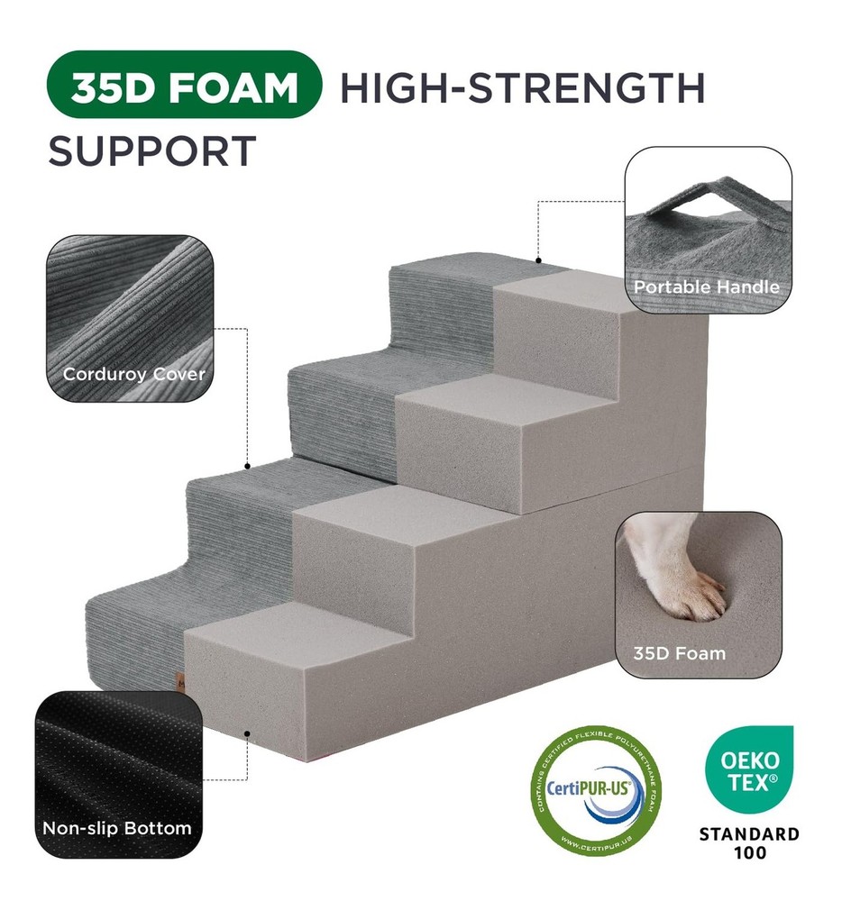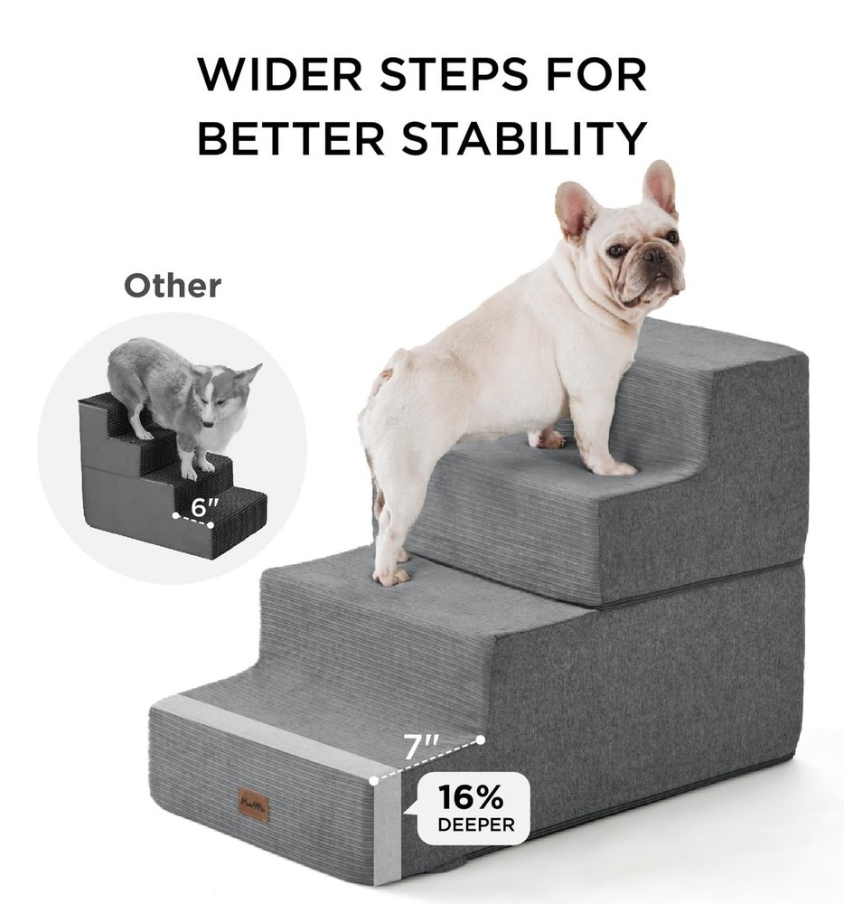 Made4Pets Dog Stairs for Small Dogs, Extra Wide Dog Steps for Bed Couch Sofa and Chair, 35D Foam Pet Steps for Small Dogs and Cats, Non-Slip Bottom Pet Stairs, Grey, 3 Steps Product Details Color: Grey Number of Layers: 3 Size: 21"x15.7"x13.5"H Brand: MADE 4 PETS MPN: MAWW0197GY UPC: Does not apply EAN: Does not apply Brand: MADE 4 PETS Material: Corduroy Color: Grey Assembly Required: No Number of Layers: 3 Package Dimensions : 16.89 x 8.58 x 7.52 inches; 5.27 Pounds Item model number : MAWW0197GY Date First Available : November 28, 2024 Manufacturer : Made4Pets Country of Origin : China Best Sellers Rank: #9,625 in Pet Supplies (See Top 100 in Pet Supplies) #7 in Cat Stairs & Steps #33 in Dog Stairs & Steps #7 in Cat Stairs & Steps #33 in Dog Stairs & Steps Customer Reviews: 4.5 4.5 out of 5 stars 281 ratings Dog Breed Size: Medium Manufacturer: Made4Pets Item Weight: 5.26 pounds Country of Origin: China Item model number: MAWW0197GY Date First Available: November 28, 2024 Item Package Dimensions L x W x H: 16.89 x 8.58 x 7.52 inches Brand Name: MADE 4 PETS Target Audience Keyword: Cats, Dogs Directions: for pets Warranty Description: 1 Year Model Name: MAWW0197GY Size: 21"x15.7"x13.5"H Included Components: Dog Stairs Specific Uses for Product: Indoor Comfortable & Accessible - Made4Pets foam dog stair provides a safe and easy way for your furry friends to access their favorite spots, whether it's the bed, couch, sofa or car. Perfect for small and medium dogs, these stairs offer comfort and stability for pets with joint issues or seniors who struggle to jump Multiple Step Options - These pet stairs come in 3, 4, and 5-step versions to fit your needs. The 3-step is ideal for low couches or beds (up to 18"). The 4-step is better suited for medium-height furniture (up to 23"), and the 5-step helps pets easily reach higher beds or cars (up to 27") High-Quality & Sturdy - Made with 35D high-density foam and eco-friendly material, this doggie steps is both lightweight and durable. The non-slip rubber dots on the bottom provide extra grip, preventing any slipping or shifting while your puppy climbs up or down Easy to Maintain - The removable cover is machine washable, making it easy to keep the stairs clean and fresh. Simply remove the foam core before washing. Note: Allow the foam to fully expand (24-48 hours) after unpacking to ensure maximum comfort and stability Versatile & Foldable - Not just for climbing! 4, 5-step(not 3-step) can be folded into a cozy pet bed for naptime. Ideal for dogs, cats, or pets with mobility challenges, this versatile product helps reduce joint strain and offers a practical solution for everyday comfort and convenience