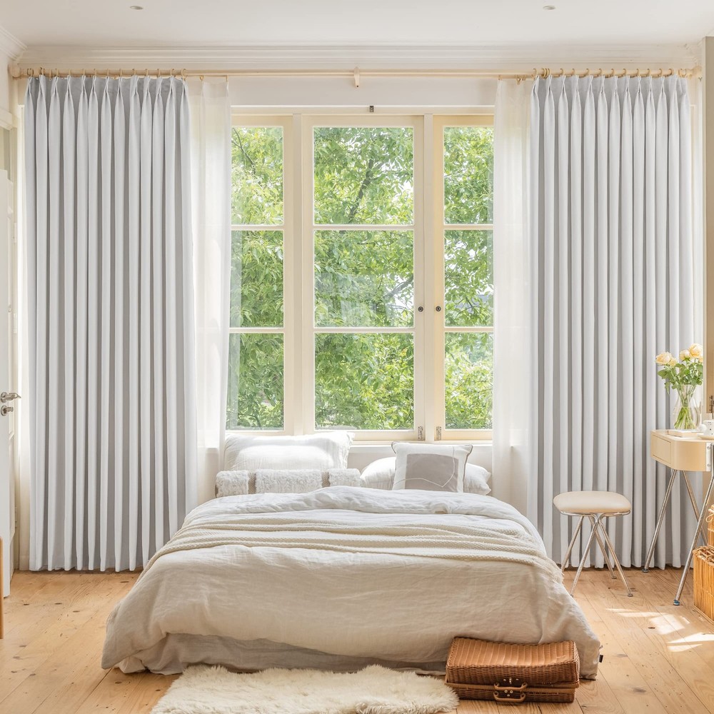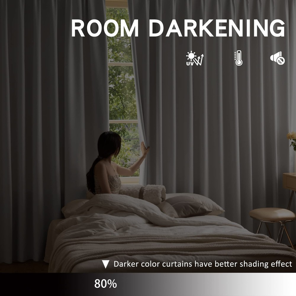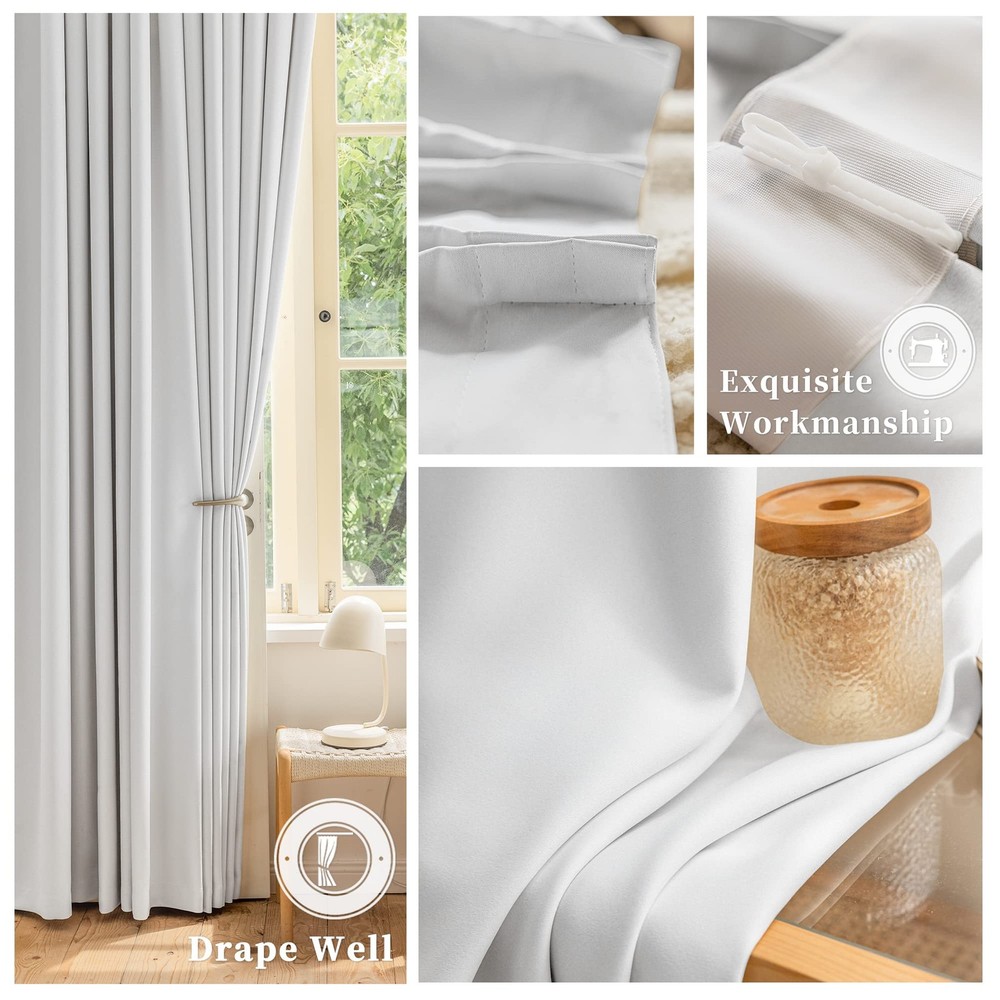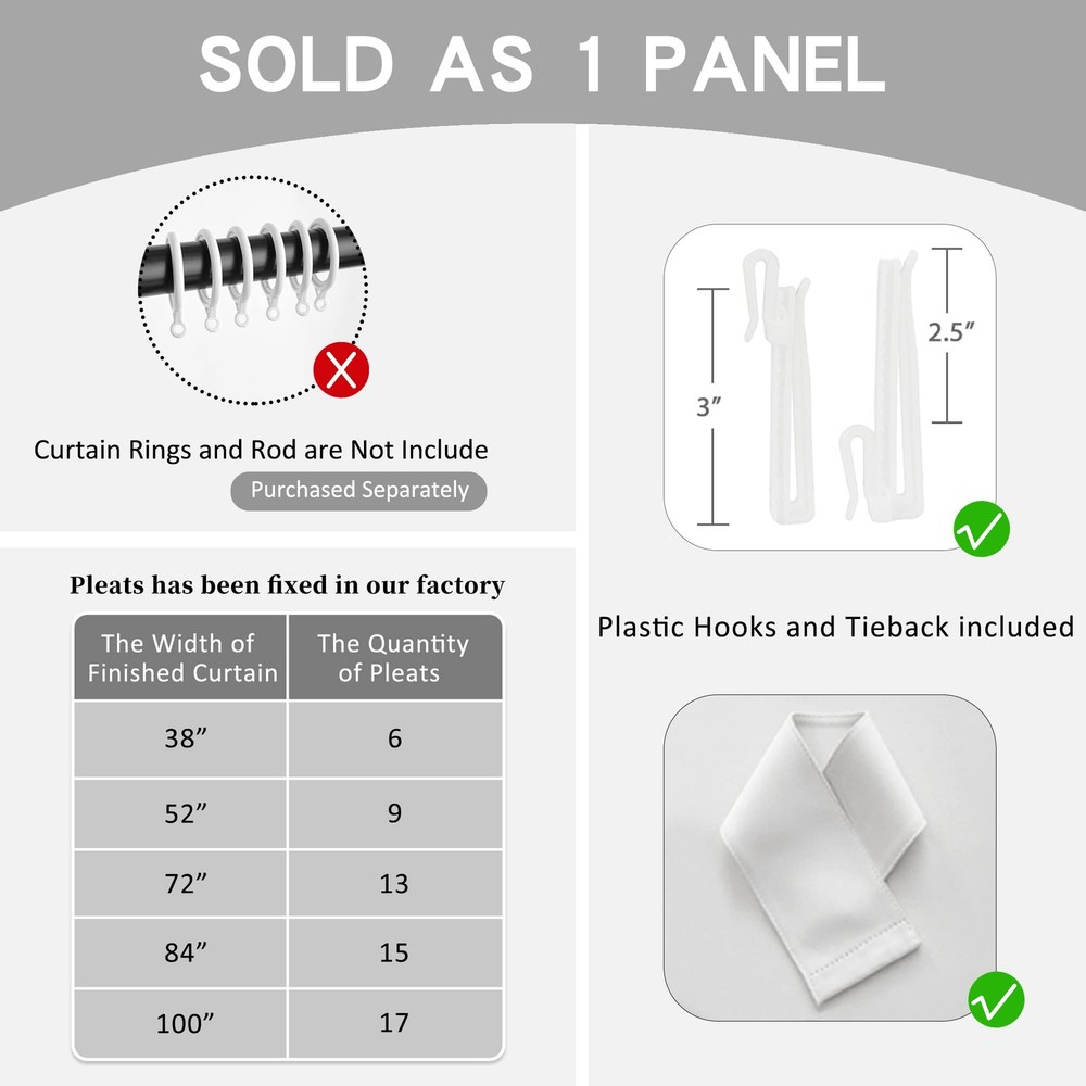 Fabric Composition: 100% Polyester Easy to install: Pinch pleat, tieback and 3"H plastic pin hooks included. Rings are not included. Put the hook through the hole on the traverse rod, or just install the curtain on the curtain rod through the curtain rings. Hooks can move curtain up and down within 3 inches to cover rod or track. Easy Care: Hand wash is recommended and machine wash is possible in cold water on gentle cycle and hang to dry or dry clean. pinch pleat curtain is plenty thick to block 80% to 95% sunlight. Their existence protect the privacy and balances room temperature by insulating against summer heat and winter chill. If there is any quality issues, please feel free to email us, we will make it right for you. Our pleated curtains are crafted from a premium super soft and thick triple weaved polyester fabric. Using three layers of woven technology, the curtains are delicate, fade-resistant and comes with a textured feel. Same color on both sides. READY MADE: One package includes 1 panel only. Panel width is the width that pleats already set. Tieback and pinch pleat hooks included. Hooks height adjustable within 3". But the curtain rings are Not included, which need to be purchased separately. Pleats / hooks quantity: 6 pleats for 38" width; 9 pleats for 52" width; 13 pleats for 72" width; 15 pleats for 84" width; 17 pleats for 100" width. ENERGY SAVING: The curtain is thick enough to block 80-95% sunlights and UV rays (Dark color works well) for maximum privacy and undisturbed sleep. Also balances room temperature by insulating against summer heat and winter chill, reducing air conditioning costs. Protect your furniture, floors and artwork from the ravages of the sun. EXTENSIVE USE: Pinch Pleat curtains hanging in the room look great. These pleated curtains are suitable for different places, such as kitchen, living room, bedroom, home office, kids room and nursery room, which can match various decor styles. EASY CARE: Some packing creases / wrinkles will fall off immediately after ironing. Hand wash is recommended and machine wash is possible in cold water on gentle cycle and hang to dry or dry clean. Do not bleach.