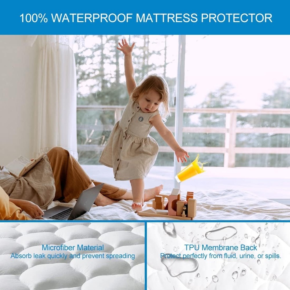 ULTRA SOFT MATTRESS PAD - Our waterproof mattress protector was crafted for a peaceful sleep environment. Filled with over 30oz hollow cotton, the premium mattress cover provides extra fluffy softness and superb breathability, to ease your fatigue after one-day exhausting work and drift to a sweet sleep easily. WATERPROOF MATTRESS PROTECTOR - The mattress pad is lined with an impermeable TPU membrane backing, to protect your pricey mattress against sweat, urine, and other fluid spills. Quiet and vinyl-free material creats a sweet sleep and avoids annoying noise while turning over. BREATHABLE MATTRESS TOPPER COVER – The Mattress protector top layer features diamond stitch quilting, combined with the specially designed TPU membrane, to help circulate airflow efficiently and whisking away excess heat. The evenly distributed hollow cotton filling can effectively help you cushion pressure while you slowly drift off into a heavenly sleep. ELASTIC SKIRT DESIGN MATTRESS COVER - Our mattress cover has a 360-degree elastic skirt, perfectly hugging up to 21" deep mattress for a flawless fit. The full protection can keep your mattress safe and prevent stains or unexpected accidents from shortening the mattress life. MACHINE WASHABLE & EXCELLENT CUSTOMER SERVICE - Easy to care for! Simply throw it in your home washer and dryer following the care instructions on the tag. All mattress protectors have a 30-day replacement.