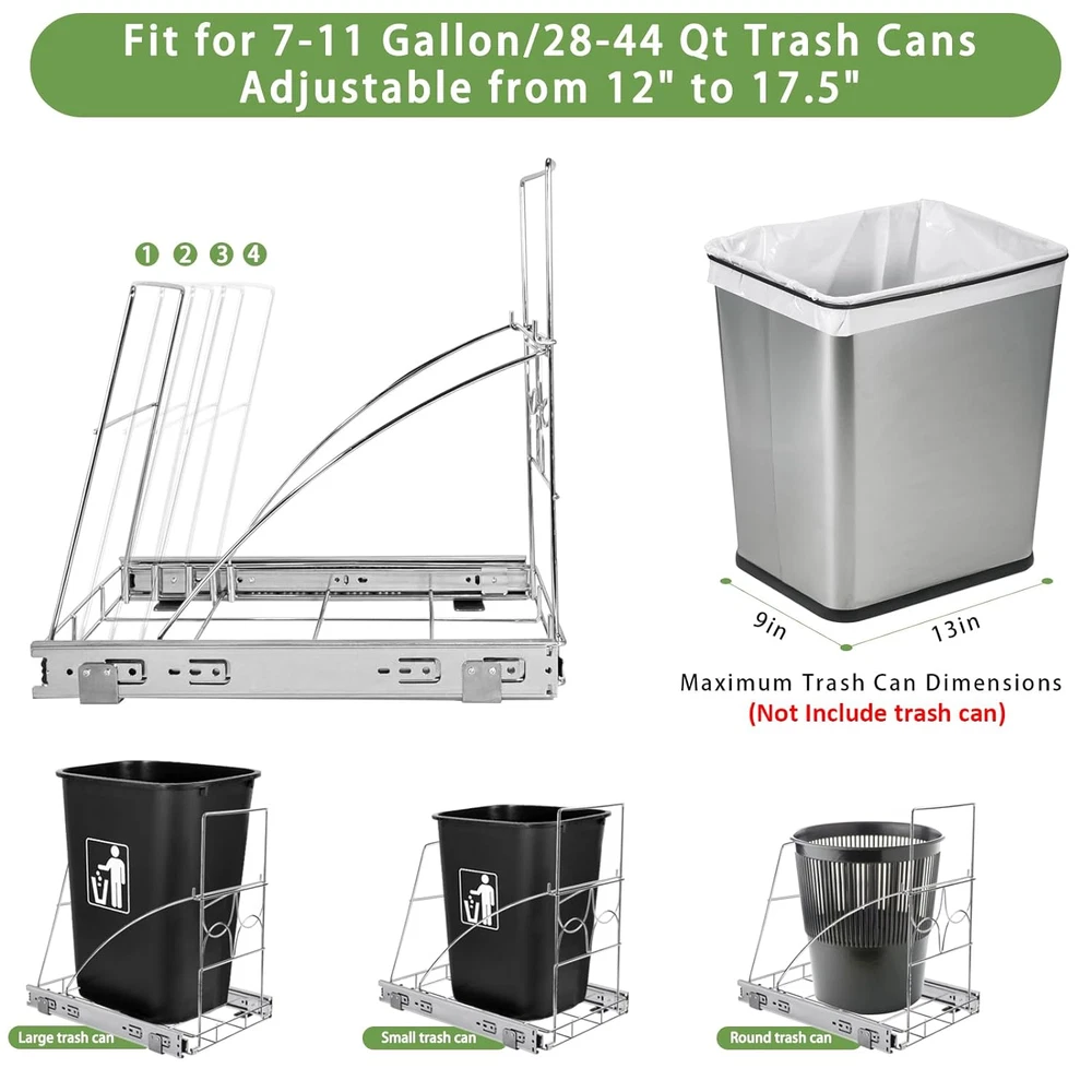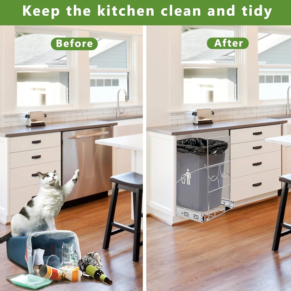 Store New Arrivals Add to Favorite View Feedback Contact Pull Out Trash Can under Cabinet, under Sink Trash Can Sliding under Mount Kitchen Trash Can for 7-11 Gallon/28-44 Qt Trash Cans (Trash Can Not Included) Description Item model number 000 Room Type Kitchen Capacity 40 Quarts Color silver Special Feature Quiet Close Product Dimensions 11.5 x 2.04 x 16.2 inches; 4.4 Pounds Material Aluminum Country of Origin China Shape Rectangular Opening Mechanism Pull-Out Recommended Uses For Product Kitchen Cabinet Finish Type Lacquered ๐กใ๐๐๐๐ข๐ง๐๐ญ ๐๐๐ช๐ฎ๐ข๐ซ๐๐ฆ๐๐ง๐ญ๐ฌใUnder sink cabinet trash can pull out kit Dimensions: ๐๐.๐"๐ ๐ฑ ๐๐"๐ ๐ฑ ๐๐"๐. -๐๐ข๐ง๐ข๐ฆ๐ฎ๐ฆ ๐๐๐๐ข๐ง๐๐ญ ๐๐ข๐ฆ๐๐ง๐ฌ๐ข๐จ๐ง๐ฌ ๐๐๐ช๐ฎ๐ข๐ซ๐๐โ๐๐"๐ ๐ฑ ๐๐"๐ ๐ฑ ๐๐"๐. Holds up to ๐๐๐ ๐ฉ๐จ๐ฎ๐ง๐๐ฌ of weight and slides the bin in and out with ease. ๐นใFor ๐-๐๐ ๐๐๐ฅ๐ฅ๐จ๐ง ๐๐ซ๐๐ฌ๐ก ๐๐๐ง๐ฌใpull out trash can under cabinethas 4 adjustable lengths: ๐๐.๐๐ ๐ข๐ง๐๐ก๐๐ฌ, ๐๐.๐๐ ๐ข๐ง๐๐ก๐๐ฌ, ๐๐.๐๐ ๐ข๐ง๐๐ก๐๐ฌ ๐๐ง๐ ๐๐.๐๐ ๐ข๐ง๐๐ก๐๐ฌ, ๐๐ข๐๐ญ๐ก ๐ข๐ฌ ๐๐.๐ ๐ข๐ง๐๐ก๐๐ฌ. Adjustable to fit ๐๐-๐๐ ๐ช๐ญ/๐-๐๐ ๐ ๐๐ฅ๐ฅ๐จ๐ง ๐ญ๐ซ๐๐ฌ๐ก ๐๐๐ง๐ฌ. Accommodates bins up to ๐๐"๐ ๐ฑ ๐๐"๐. Tip: ๐๐จ๐ฎ ๐๐๐ง ๐ฆ๐๐๐ฌ๐ฎ๐ซ๐ ๐ญ๐ก๐ ๐ฅ๐๐ง๐ ๐ญ๐ก ๐๐ง๐ ๐ฐ๐ข๐๐ญ๐ก ๐จ๐ ๐ญ๐ก๐ ๐๐จ๐ญ๐ญ๐จ๐ฆ ๐จ๐ ๐ฒ๐จ๐ฎ๐ซ ๐ญ๐ซ๐๐ฌ๐ก ๐๐๐ง ๐๐๐๐จ๐ซ๐ ๐ฒ๐จ๐ฎ ๐๐ฎ๐ฒ ๐ญ๐จ ๐ฆ๐๐ค๐ ๐ฌ๐ฎ๐ซ๐ ๐จ๐ฎ๐ซ ๐ฌ๐ก๐๐ฅ๐ ๐ฐ๐ข๐ฅ๐ฅ ๐ฆ๐๐ญ๐๐ก ๐ฒ๐จ๐ฎ๐ซ ๐ญ๐ซ๐๐ฌ๐ก ๐๐๐ง. ๐๏ธใ๐๐ง๐๐๐ซ ๐๐ข๐ง๐ค ๐๐ซ๐๐ฌ๐ก ๐๐๐ง ๐๐ฎ๐ฅ๐ฅ ๐๐ฎ๐ญใThe under sink trash can pull out is made of high-quality steel with a chrome plated surface that is corrosion resistant and will not rust in wet conditions. In addition, the garbage can cabinet bracket has a thickened design and can bear a weight of up to 100 pounds, and the base of the bracket will not be deformed by the weight bearing. ๐ทใ๐๐๐ฑ๐ข๐ฆ๐ข๐ณ๐ ๐๐จ๐ฎ๐ซ ๐๐ข๐ญ๐๐ก๐๐งใcabinet trash can pull out kit Maximize your kitchen space ,keeps the garbage out of sight and says goodbye to a messy kitchen and dirty sink,avoid your pets to knock it over and creating a mess.ใ๐๐จ๐ญ๐: ๐๐จ๐ญ ๐๐ง๐๐ฅ๐ฎ๐๐ ๐๐๐ซ๐๐๐ ๐ ๐๐ข๐ง.ใ ๐ใ๐๐ฅ๐ข๐๐๐ฌ ๐๐ง ๐๐ง๐ ๐๐ฎ๐ญ ๐๐ฎ๐ข๐๐ญ๐ฅ๐ฒ ๐๐ฆ๐จ๐จ๐ญ๐ก๐ฅ๐ฒใThe pull out trash cans slides shelf with thickened solid ball bearing system, secure glide with no squeaking noise every time you pull out and push the trash can. Makes garbage collection and disposal easy. In addition, this cabinet trash can holder can also be used for pet food storage, clothing storage, kitchen tool storage, etc. โ๏ธใ๐๐๐ฌ๐ฒ ๐ญ๐จ ๐๐ง๐ฌ๐ญ๐๐ฅ๐ฅใThe base of the under sink trash can has been installed, eliminating the tedious installation process for you. Therefore, you only need 4 screws to mount the under cabinet trash can bracket to the cabinet floor. ๐๐ ๐ฒ๐จ๐ฎ ๐ก๐๐ฏ๐ ๐๐ง๐ฒ ๐ช๐ฎ๐๐ฌ๐ญ๐ข๐จ๐ง๐ฌ ๐๐๐จ๐ฎ๐ญ ๐จ๐ฎ๐ซ ๐ฉ๐ซ๐จ๐๐ฎ๐๐ญ๐ฌ, ๐ฉ๐ฅ๐๐๐ฌ๐ ๐๐๐๐ฅ ๐๐ซ๐๐ ๐ญ๐จ ๐๐จ๐ง๐ญ๐๐๐ญ ๐ฐ๐. Product Description Please measure your cabinets and bins before purchasing to ensure fit. (Not Include Trash Can) Pull Out Trash Can Under Cabinet Why Use under sink trash can pull out ? pull-out trash can shelf can keep your kitchen and sink tidy,save space,not only help you hide your kitchen trash , also helps prevent any unpleasant odors from escaping to the outdoors,easy to solve the problem of pets overturning the trash can! Installation Instructions Widely Used Pull-out trash can under cabinet not only for kitchen,also be used in laundry rooms, garages, RVs, cafes, etc. Quality materials for durability High quality ball bearing guide system Adjustable length for more bins ABOUT US We offer the best prices around on high quality products. Our E-store includes media such as books, movies, music and games while offering electronics, toys, sporting apparel, clothing, tools, general home, garden items and more. SHIPPING We are always working hard to ensure your package arrives as soon as possible. Please understand that some factors like weather, high postal traffic, and the performance of shipping companies are outside of our control. We offer free shipping to the lower 48 states and ship within 2 business days of payment, usually sooner. We do not accept P.O. Boxes. Please provide a physical address. For shipping outside of the continental USA, we only use eBay's Global Shipping Program.The item is shipped to KY and then sent to the rest of the world. International customers are responsible for all duties and taxes. Continue to check out in order to calculate costs for shipping the item to your country. Messages regarding eBay's Global Shipping Program MUST be directed at eBay EXCLUSIVELY. RETURNS We offer a 
