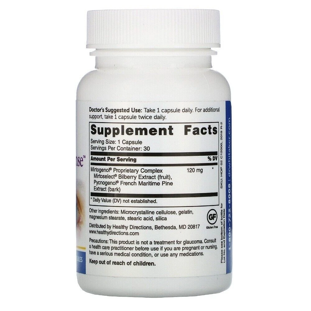 INCLUDES HIGH QUALITY EYE HEALTH INGREDIENT COMBINATION TO SUPPORT HEALTHY EYE PRESSURE, CIRCULATION, AND RETINAL HEALTH INCLUDES CLINICALLY STUDIED BLEND OF TWO INGREDIENTS. Pycnogenol French Maritime Pine Bark Extract and Mirtoselect Bilberry Extract -- Help lower intraocular pressure and support the health of your retinas DEVELOPED BY JULIAN WHITAKER, MD, PIONEER OF ALTERNATIVE MEDICINE and founder of the Whitaker Wellness Institute, helping people improve their quality of life DISTRIBUTED BY HEALTHY DIRECTIONS, known for its stringent quality control measures and Triple Testing Philosophy that have led to a spotless safety record for more than 20 years