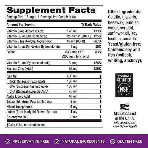 Restore & Protect - Restore offers a full suite of essential nutrients to build your eyes’ natural protection, or internal sunglasses to proactively address the concern of developing age-related eye health issues. Don’t be reactive with your eye health, be proactive with Restore NSF Contents Tested & Certified - The National Sanitation Foundation (NSF) is an independent international agency that certifies and verifies that contents match the label data on your supplements. At we go the extra mile so you can be confident you are making the right choice for your health 5X More Zeaxanthin - A combined 12 mg of the dietary nutrients zeaxanthin and lutein have been proven beneficial for age-related eye health issues. Restore provides this level of antioxidant protection. Because healthy eyes accumulate zeaxanthin and lutein at a ratio of 2:1, our patented formulation for Restore was developed purposefully with 8 mg of zeaxanthin and 4 mg of lutein per softgel Manufactured in the USA with domestic and imported ingredients - sources natural ingredients, and our Omega-3 fish oil meets P65 and USP requirements. We've done the work to source responsibly and openly and certify our formulations, so you can be confident products are supporting your eye health Be strategic with your purchase and set up a monthly subscription with Amazon's S&S program. See results from your supplements in under just 60 days