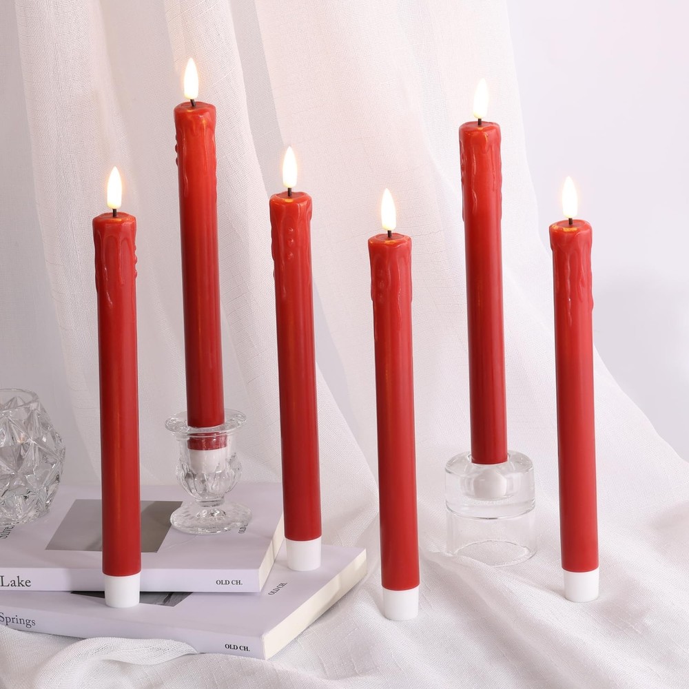Eywamage Red Christmas Flameless Taper Candles with Remote, Realistic Dripping Wax Battery LED Candlesticks Set of 6 Product Details Color: Red Brand: Eywamage MPN: MA015-S6-Red UPC: Does not apply EAN: Does not apply Finish Type: Coated Product Dimensions: 0.86"D x 0.86"W x 5"H Lamp Type: Mood Light Shade Color: Red Shade Material: Plastic Finish Type: Coated Product Dimensions: 0.86"D x 0.86"W x 5"H Lamp Type: Mood Light Shade Color: Red Shade Material: Plastic Switch Type: Remote Style: Modern Brand: Eywamage Color: Red Special Feature: Cordless Light Source Type: LED Material: Paraffin Wax + ABS Room Type: Bathroom, Kitchen, Living Room, Bedroom Power Source: Battery Powered Number of Light Sources: 6 Included Components: 6 piece led taper candles, 1 remote and user manual Is Waterproof: false Mounting Type: Tabletop Wattage: 6 watts Number of Items: 6 Lighting Method: LED Indoor/Outdoor Usage: Indoor Number of Pieces: 6 Voltage: 3 Volts Is Cordless?: Yes Manufacturer: Eywamage Shade Height: 5 Inches Part Number: MA015-S6-Red Item Weight: 1.15 pounds Item model number: MA015 Batteries: 1 CR2 batteries required. Finish: Coated Special Features: Cordless Batteries Included?: No Batteries Required?: Yes Date First Available: August 24, 2024 Unique Tear-drop Design: stand out with these electronic taper candles featuring a distinctive dripping-wax shape, adding a modern twist to traditional candle aesthetics Rich Dark Red Hue: our dark red LED taper candles offer an elegant ambiance, perfect for adding a touch of timeless elegance to your home decor or festive celebrations Battery Powered & Long Battery Life: each taper candle takes 2 AAA batteries (not included), lasting over 350 hours; remote takes 1 cr2025 coin cell ( included) Convenient Remote & Timer Function: effortlessly control the ambiance with the included remote, allowing you to control power, adjust brightness, set timers, and choose from various flicker effects at the touch of a button within 20 ft Safe & Versatile Application: these flameless taper candles provide a safe and hassle-free alternative, ideal decor for home, Christmas, wedding party, events, also wonderful gift