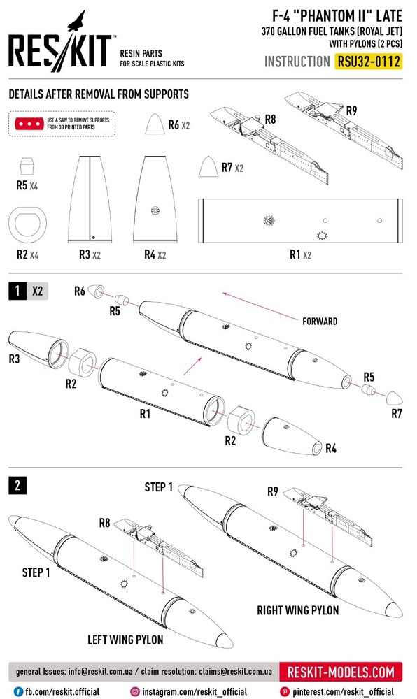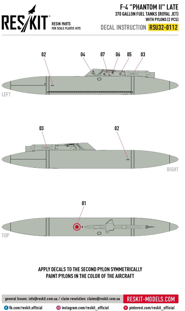 F-4 "Phantom II" late 370 gallon fuel tanks (Royal Jet) with pylons (2 pcs) (3D Printed) Scale 1:32 ResKit RSU32-0112 - for Plastic Model Kit Scale: 1/32 Manufacturer: RESKIT (Accessories for Scale Plastic Kits) Country/Region of Manufacture : Ukraine Features: Kit Condition : New in Box Type of equipment : Aircraft Type of product: FUEL TANKS Recommended kit: Any Category: RESIN & 3D ACCESSORIES F-4 "Phantom II" late 370 gallon fuel tanks (Royal Jet) with pylons (2 pcs) (3D Printed) for Aircraft Plastic Model Kit Resin fuel tanks set F-4, F4, F 4, PHANTOM II, 370 GALLON, ROYAL JET ---------------------------- If you have a desire to procure a GREATER NUMBER OF ITEMS THAN WHAT IS CURRENTLY DISPLAYED, kindly let us know, and we will happily modify our offerings to suit YOUR EXACT QUANTITY NEEDS. ---------------------------- >>> Visit our eBay store! <<< You will find everything you need at great prices. Reskit: The Ultimate Upgrade for Your Scale Models Reskit is the leading provider of upgrade sets for scale models, offering a wide range of products to enhance the realism and detail of your models. Our sets include everything from engines and interiors to exterior accessories and weapons. Whether you're a beginner or a seasoned modeler, Reskit has the upgrade sets you need to take your models to the next level. Here are just a few of the benefits of using Reskit upgrade sets: Increased realism and detail: Our sets are made with high-quality materials and components that will add a touch of authenticity to your models. Improved performance: Our sets can help improve the performance of your models, making them more realistic and engaging. Reskit upgrade sets are the perfect way to add realism, detail, and performance to your scale models. With our wide range of products, you can find the perfect upgrade set to transform your models into showpieces.