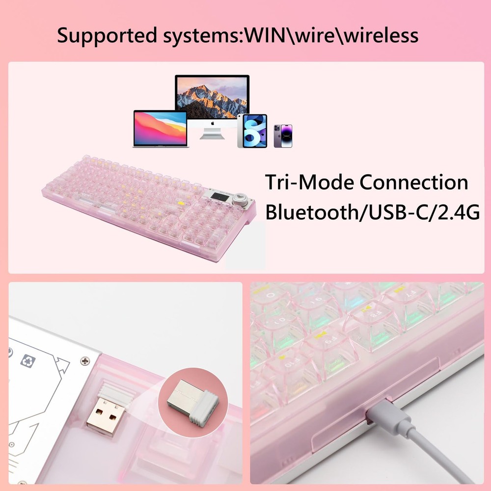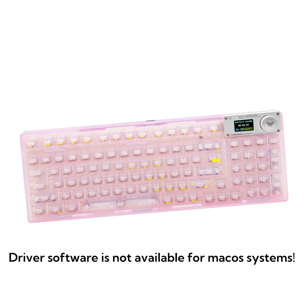 【Transparent keyboard with OLED smart display】The OLED screen casing is protected by an aluminum alloy, adding a mechanical touch to this stylish keyboard. the OLED screen switches between display screens by turning a knob. It is mainly divided into a main page, a GIF page, and a function settings page. On the function settings page, the user can adjust the keyboard connection mode, system switching, backlight mode, color, brightness, speed, volume control, and language selection with the knob. You can also customize and draw your own images and GIFs using software compatible with WIN(Driver software is not available for macos systems). 【Special Keycaps Hot Swappble Switch Mechanical Keyboard】 The hot-swappable design is compatible with commercially available PCBs and 3Pin/5Pin mechanical switches. It can be freely replaced even if one of the keys breaks, and there is no need to disassemble the keyboard to replace the axis body. It also provides fast response time. 【Transparent Keycaps】 This entire fashionable keyboard is designed with the ultimate in transparency and is made of high quality materials. The transparent shell and keycaps are designed to bring out the keyboard's 19 different south-facing RGB backlights. Even in dark environments, the RGB backlighting appears clear and bright. The keyboard's characters are printed using a proprietary printing process, making it durable and resistant to damage. It features a dual-layered foot support frame and a curved finger-contact design that minimizes fatigue even after prolonged use. 【Support for multiple system and device connections】The transparent wireless keyboard can quickly switch between Bluetooth 5.0 & 2.4GHz & USB-C connections through a combination of OLED smart screen or hot keys. The keyboard is powered by a 4000mAh battery, and a separate battery compartment is designed so that the battery can be replaced without disassembling the keyboard if you want to replace it with a higher capacity battery. It is compatible with laptops, Windows,and Android. No complicated connections are required, and the OLED smart screen can be easily switched with a knob. 【Mechanical Keyboard with Gasket】Adopting a gasket structure, the keyboard has a cotton multi-layer structure with sound deadening cotton cushion sandwiched inside the keyboard, effectively eliminating typing noise and voids when using this stylish, cute and transparent keyboard. The highly elastic silicone cushion reduces vibration generated during typing, making typing sound softer and more delicate to the touch. *If you need driver software, please contact us.